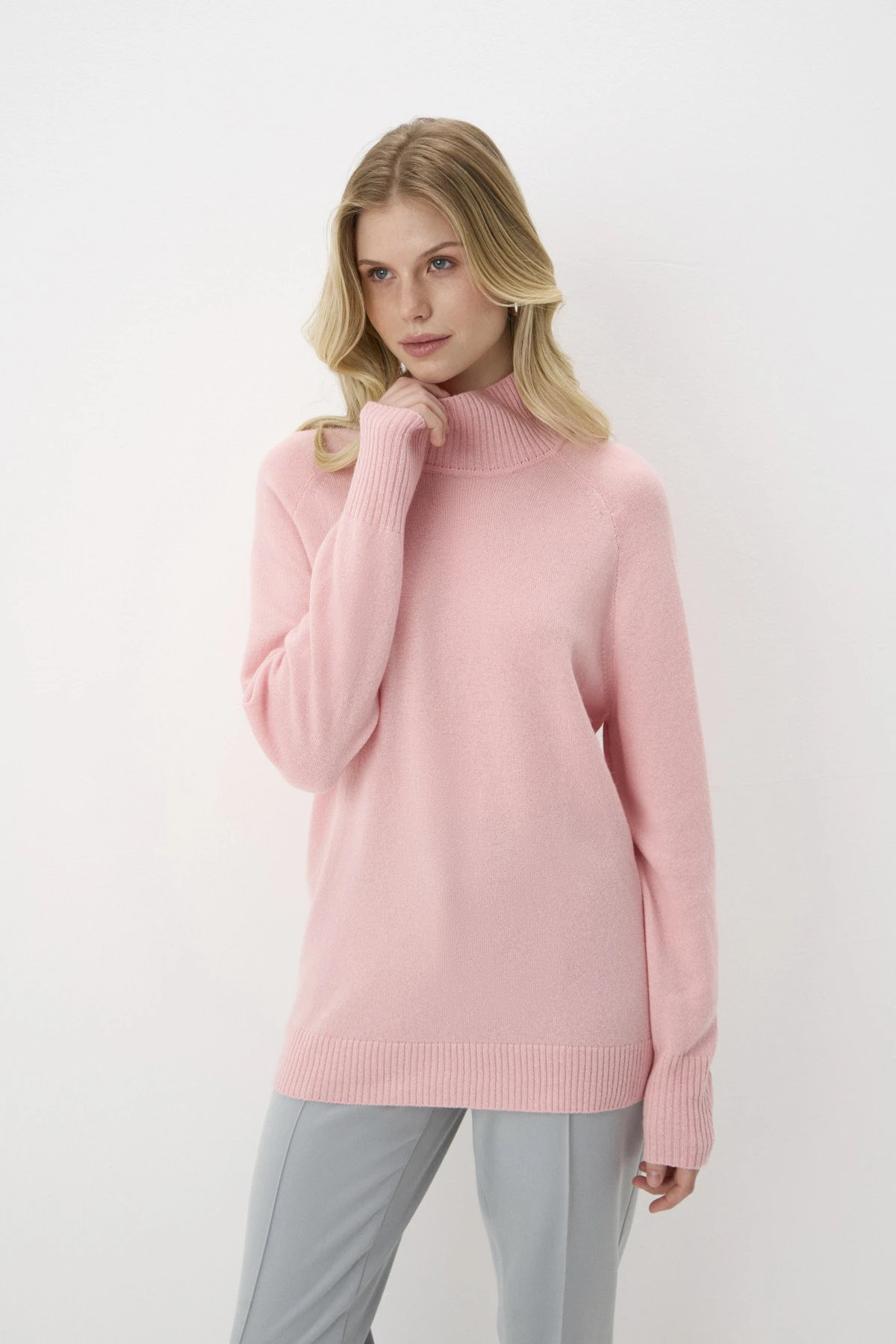 Трикотажный свитер из пряжи восхитительного состава, сочетающей тёплую шерсть, комфортную вискозу и благородный кашемир в оттенке «розовый фламинго». Воротник-стойка, манжеты рукавов и низ свитера выполнены вязкой в «рубчик». Уютный и комфортный свитер создаст стильный образ и согреет в зимний период.