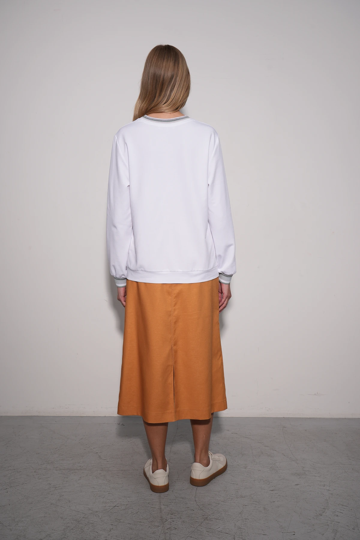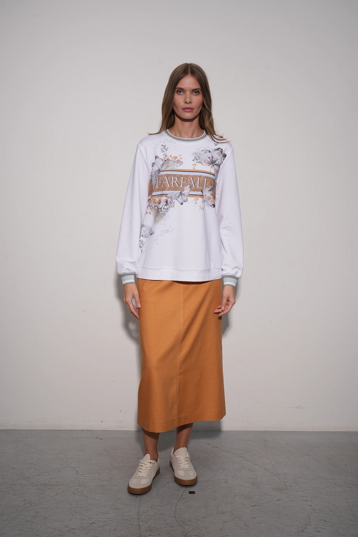 Свитшот выполнен из двухниточного футера с добавлением хлопка, что обеспечивает мягкость, гигроскопичность и комфорт. Жизнерадостный принт на молочном фоне с надписью «farfalle» (с ит. «бабочка») создаёт лёгкое и позитивное настроение. Свободный силуэт на притачном поясе гарантирует удобную посадку, а рукава полной длины на манжетах придают универсальность. Круглый вырез и манжеты декорированы авторской трикотажной бейкой, завершающей стильный и оригинальный образ. Свитшот станет яркой частью гардероба, легко сочетаясь с одеждой в стиле casual.