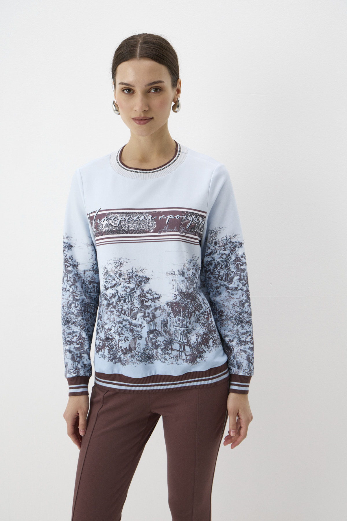 Комфортная и полюбившаяся всем форма свитшота позволяет создать ощущение уюта. Свитшот выполнен из двухниточного футера с добавлением гигроскопичного хлопка, что подчёркивает спортивный характер модели. В то же время романтика принта смягчает его спортивную стилистику и делает уместным в ситуации неформального офиса. Трикотажная отделка композиционно завершает модель, ведь оттенок каждой нити с любовью подобран в тон принта.