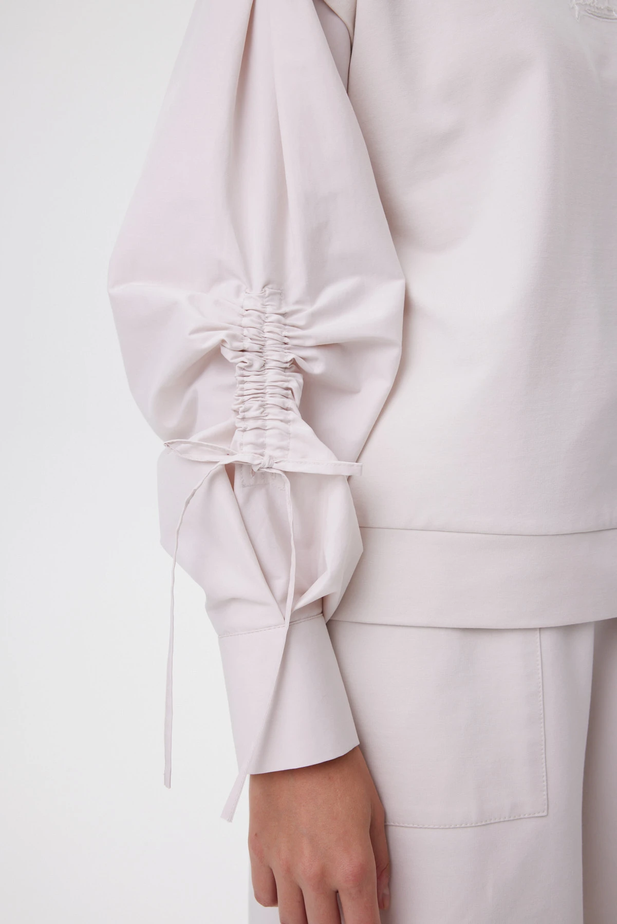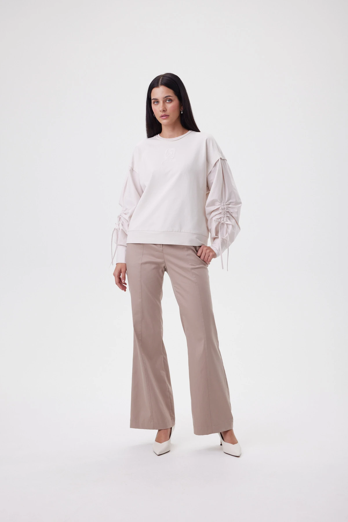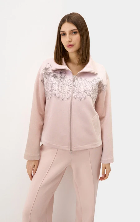 Главная визуальная метафора свитшота — имитация жилета, надетого на рубашку: линия проймы тщательно выверена, а рукав выполнен сложной конструкцией с мягкой драпировкой, собранной на шнур. Манжет — рубашечного типа, что ещё больше усиливает иллюзию стилистического микса. Свободный силуэт держит форму, но не выглядит громоздко — фигура в нём остаётся лёгкой, а рукава можно подтянуть шнуром и менять настроение: от мягкого объёма до более графичной линии. Основа из премиального футера в оттенке «миндальная пудра» даёт спокойный фон и ощущение уюта, а хлопковые рукава добавляют живую пластику и игру фактур. В центре — аппликативная вышивка на сетке с мотивом фламинго: тихий знак и красивый акцент. Комбинируется с прямыми брюками и юбкой А-силуэта для «собранного» дня или с денимом для расслабленного, но продуманного casual.