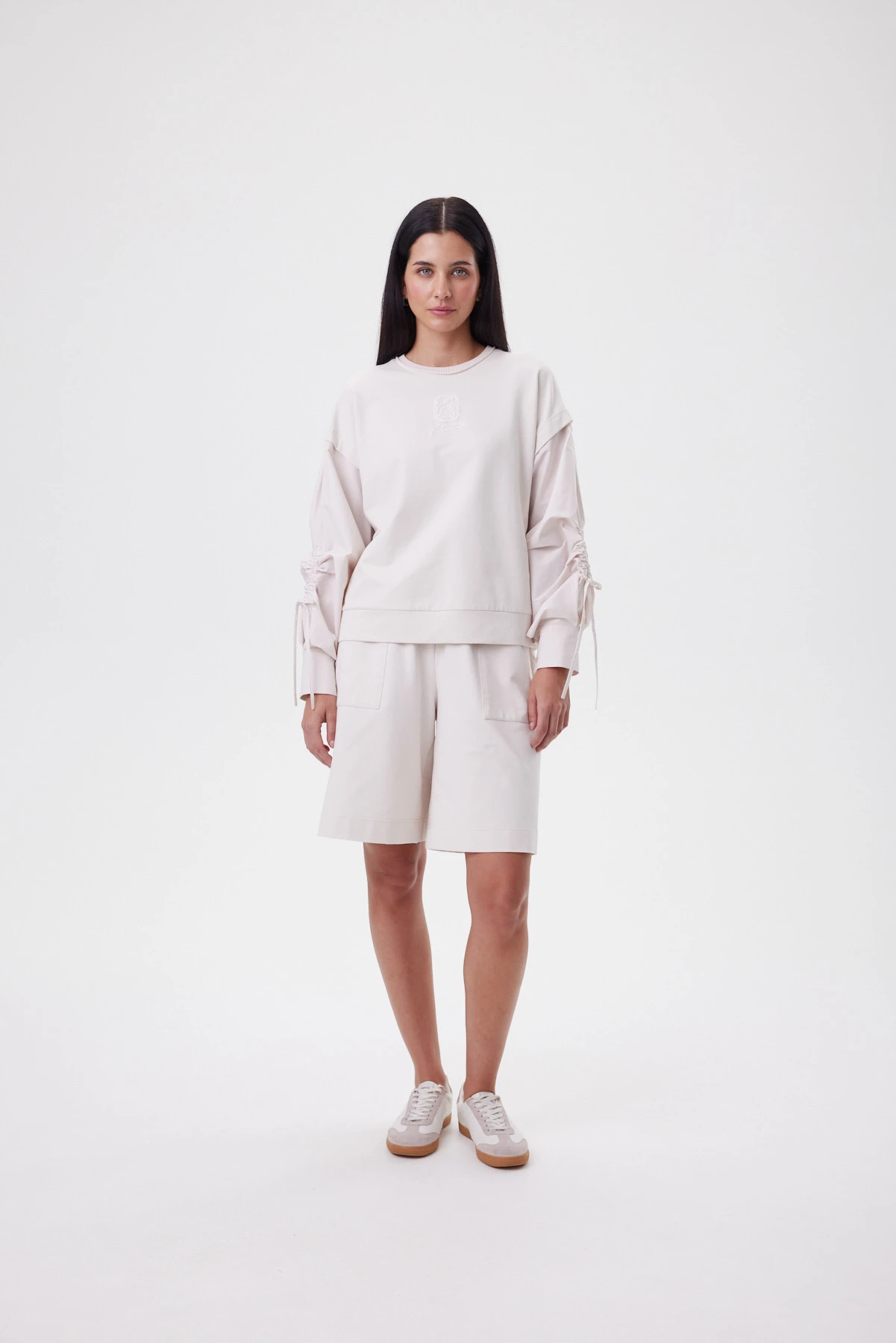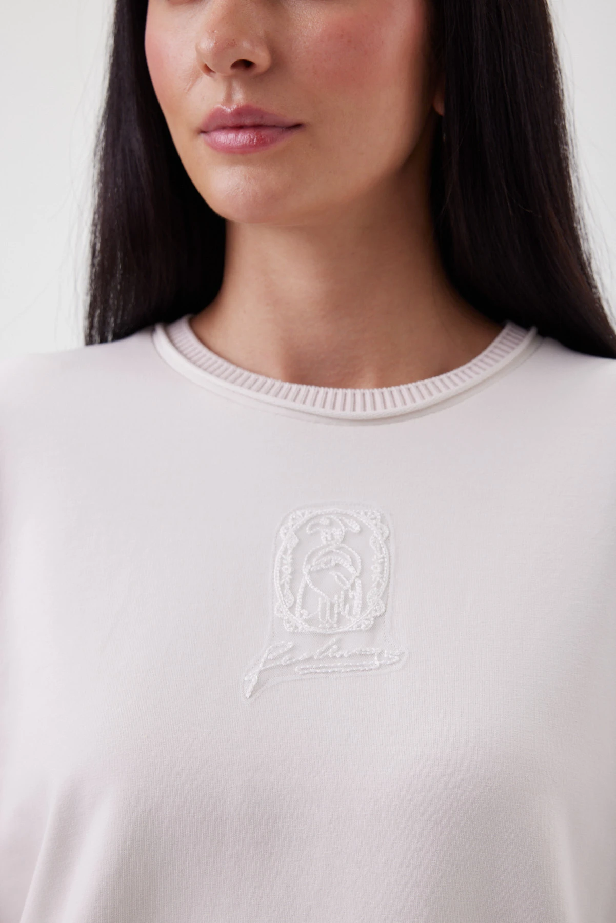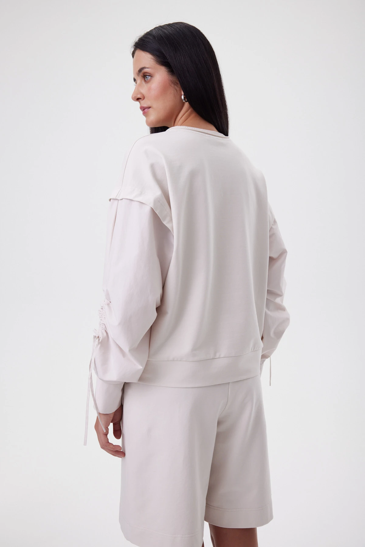 Главная визуальная метафора свитшота — имитация жилета, надетого на рубашку: линия проймы тщательно выверена, а рукав выполнен сложной конструкцией с мягкой драпировкой, собранной на шнур. Манжет — рубашечного типа, что ещё больше усиливает иллюзию стилистического микса. Свободный силуэт держит форму, но не выглядит громоздко — фигура в нём остаётся лёгкой, а рукава можно подтянуть шнуром и менять настроение: от мягкого объёма до более графичной линии. Основа из премиального футера в оттенке «миндальная пудра» даёт спокойный фон и ощущение уюта, а хлопковые рукава добавляют живую пластику и игру фактур. В центре — аппликативная вышивка на сетке с мотивом фламинго: тихий знак и красивый акцент. Комбинируется с прямыми брюками и юбкой А-силуэта для «собранного» дня или с денимом для расслабленного, но продуманного casual.