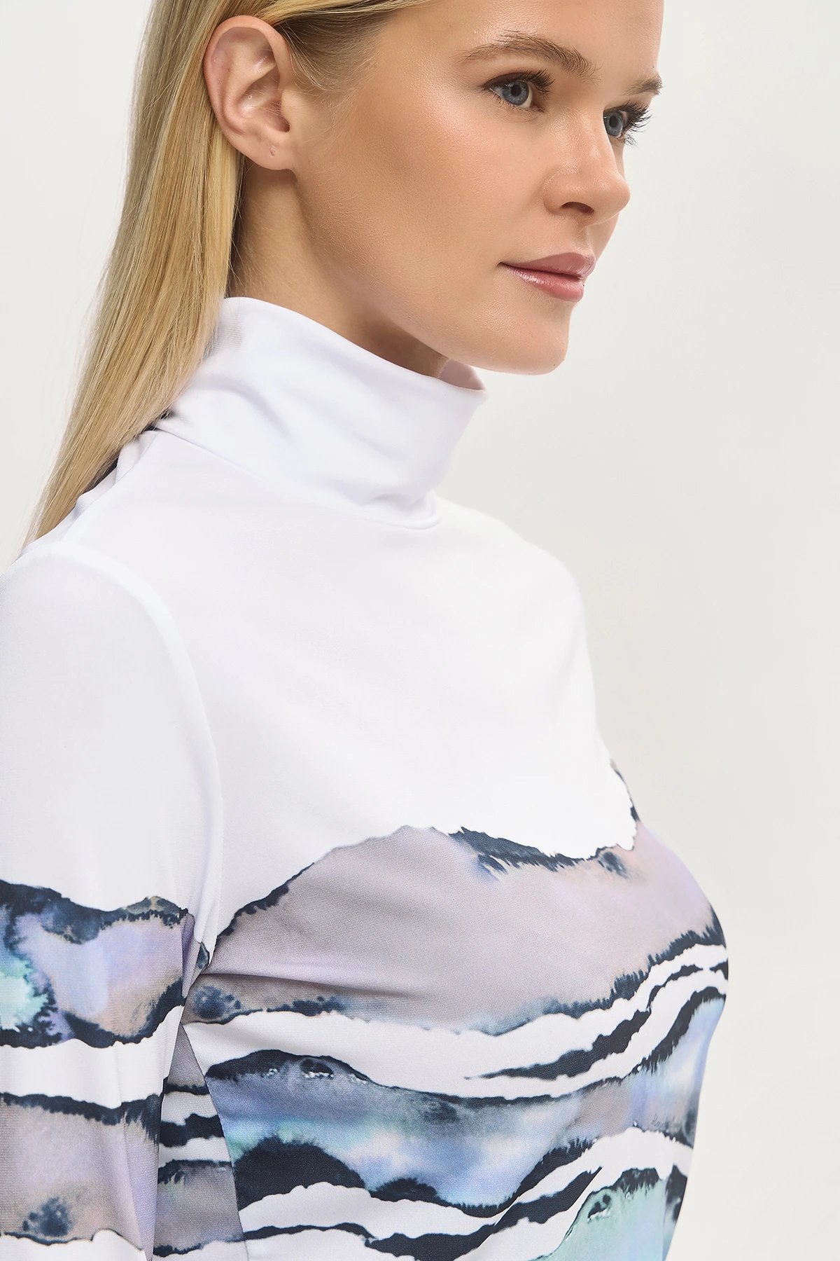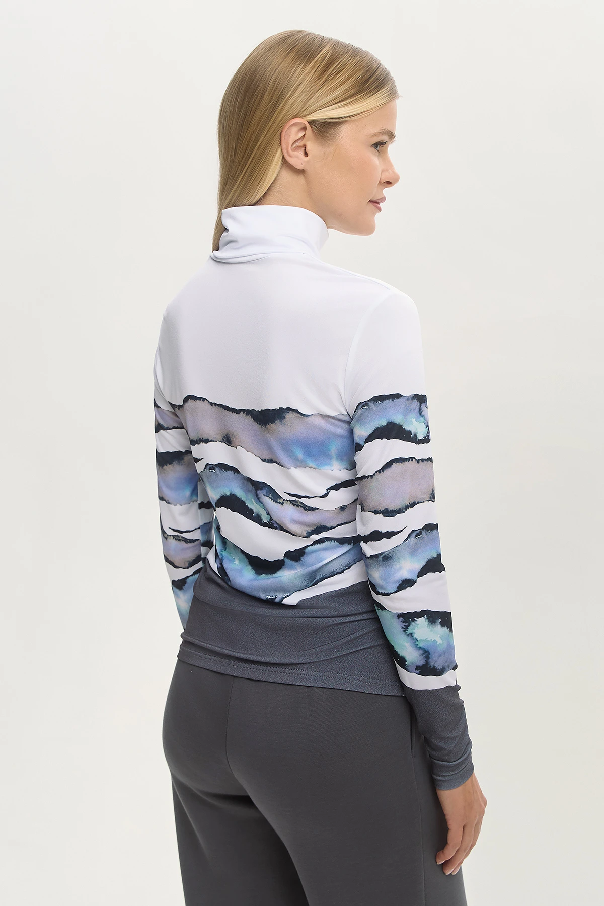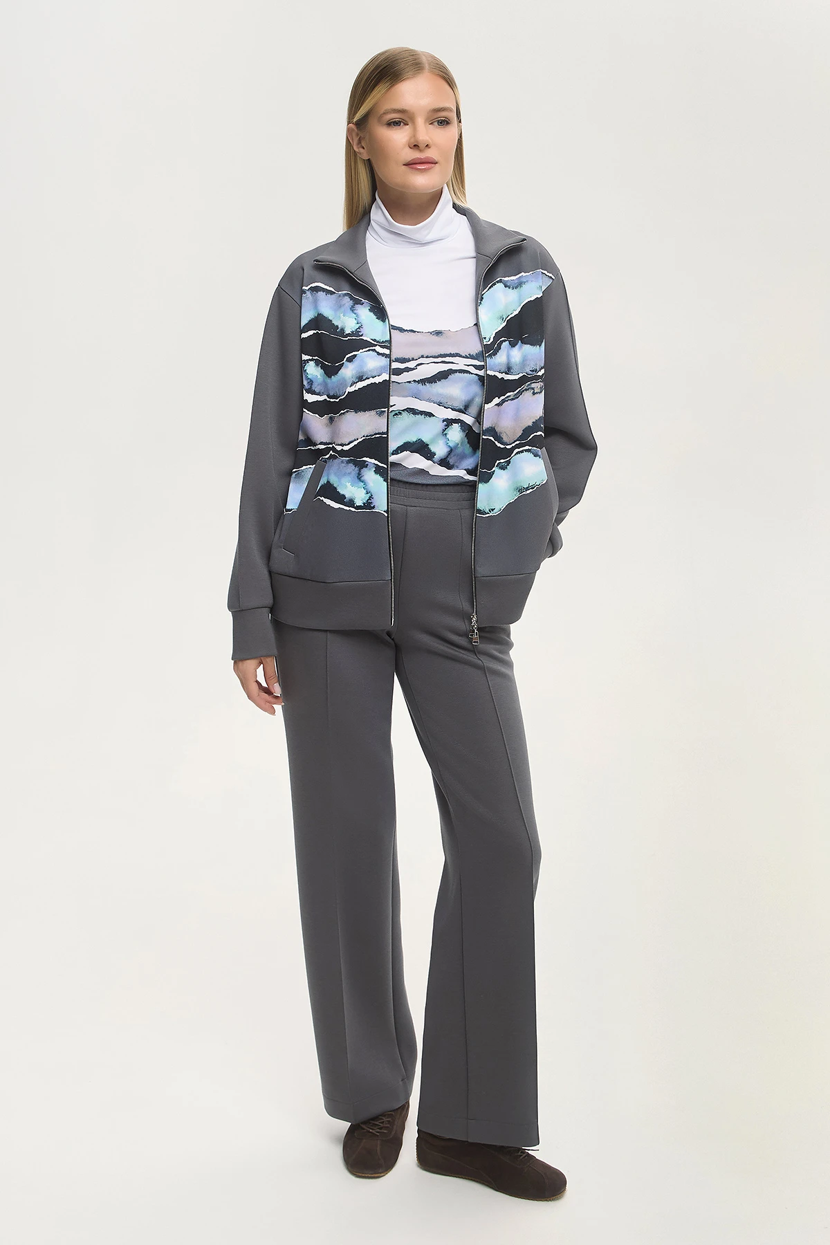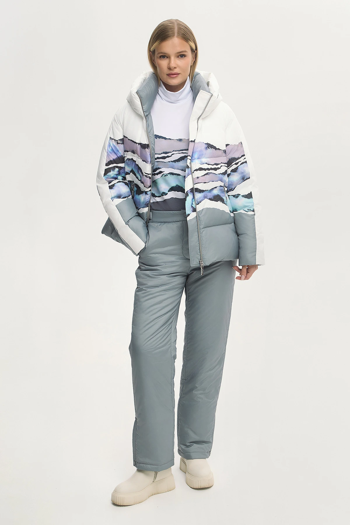 "Акварельный принт делает образ акцентным и художественным. Высокий воротник мягко прилегает к шее, защищая от ветра и добавляя элегантности.