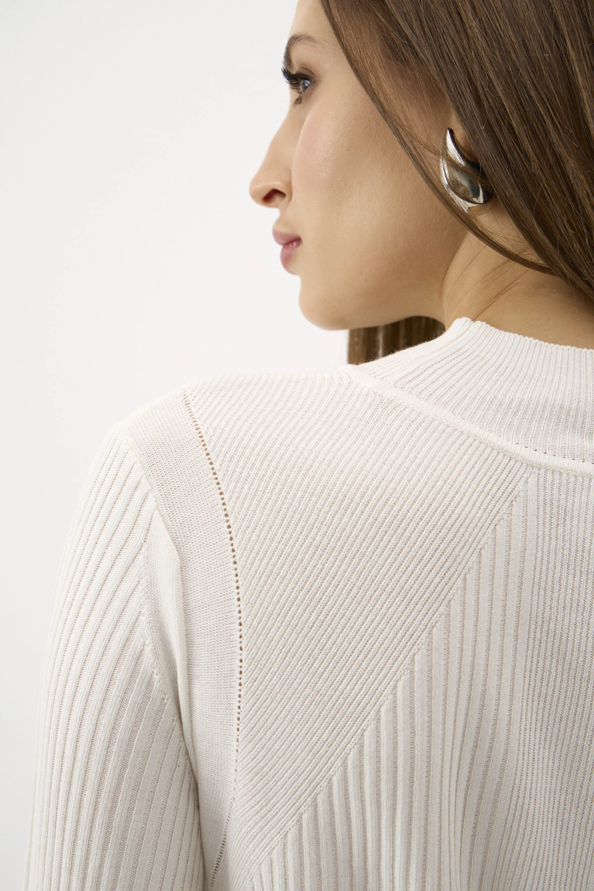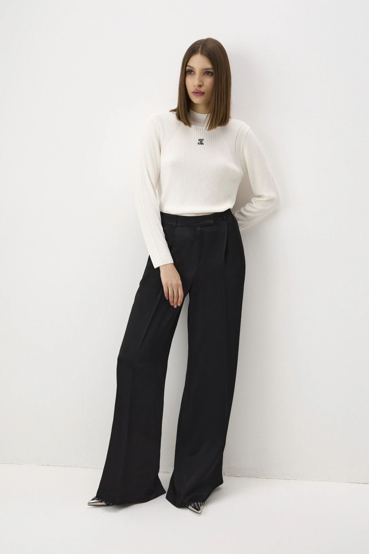 Трикотажная водолазка из премиальной вискозы район в молочном оттенке. Сочетание разных типов вязки – «рубчик» разной ширины, гладь и ажур – создают имитацию рукава реглан и придают оригинальность монохромной модели. По переду – контрастная надпись «Art of rain» («Искусство дождя»), которая метафорически отсылает нас к образу Санкт-Петербурга – столицы дождей. Надпись сделана в технике объёмной печати нанесением символов по ткани рельефным фотополимерным материалом.