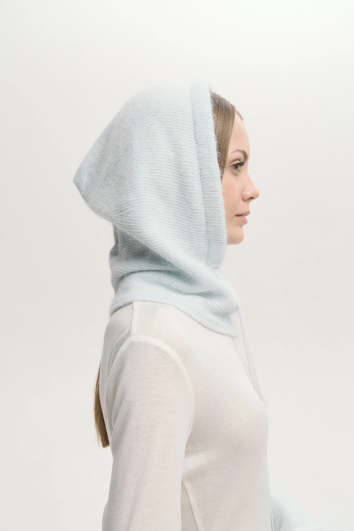 Мягкий капюшон в небесно-голубом оттенке — уютный акцент зимнего гардероба. Пушистая фактура с ангорой дарит тепло и комфорт в холодные дни. Глубокая посадка защищает от ветра, а широкие завязки позволяют варьировать посадку по настроению. Оттенок подчёркивает свежесть кожи и черты лица. Эстетичная альтернатива привычным головным уборам — с теплом и деликатностью.