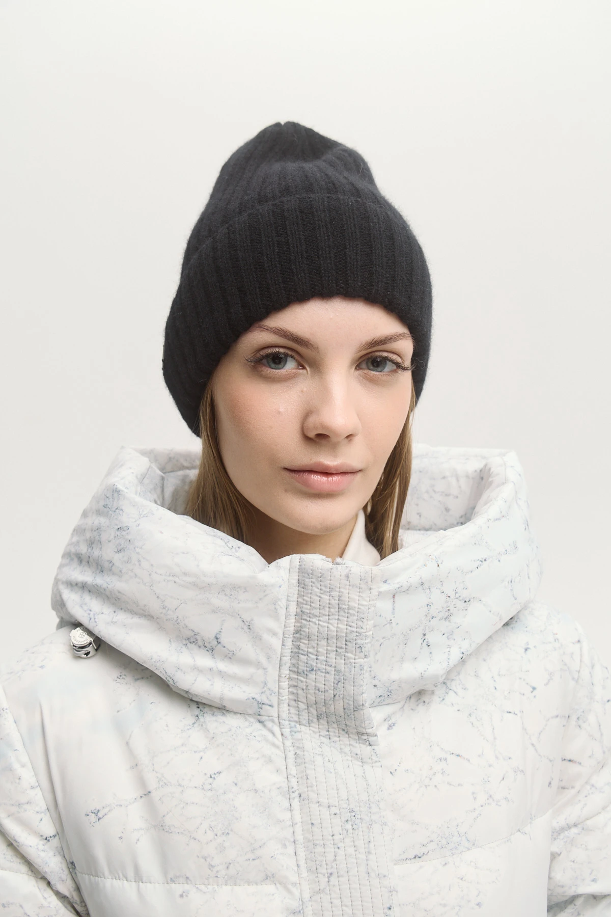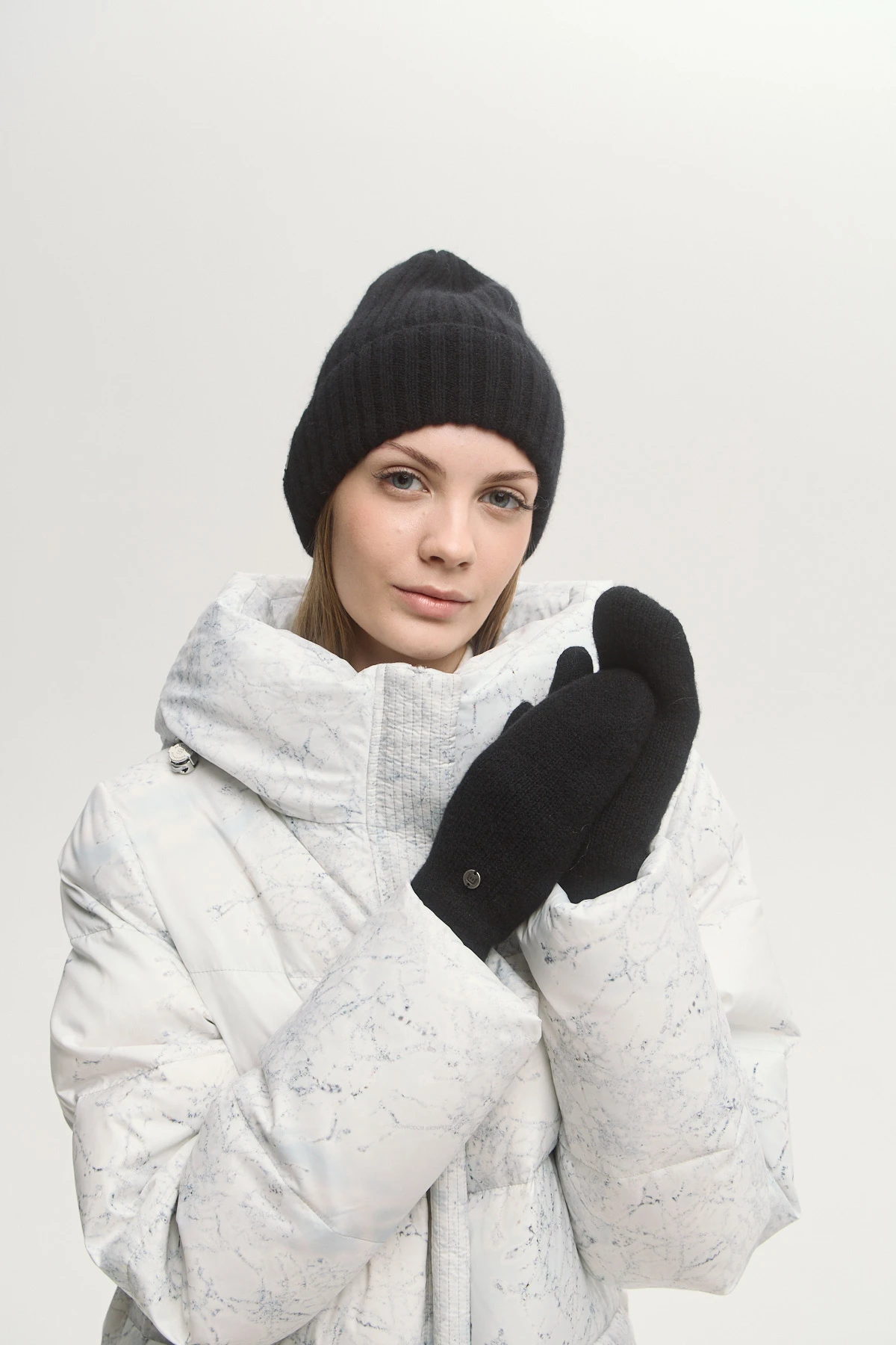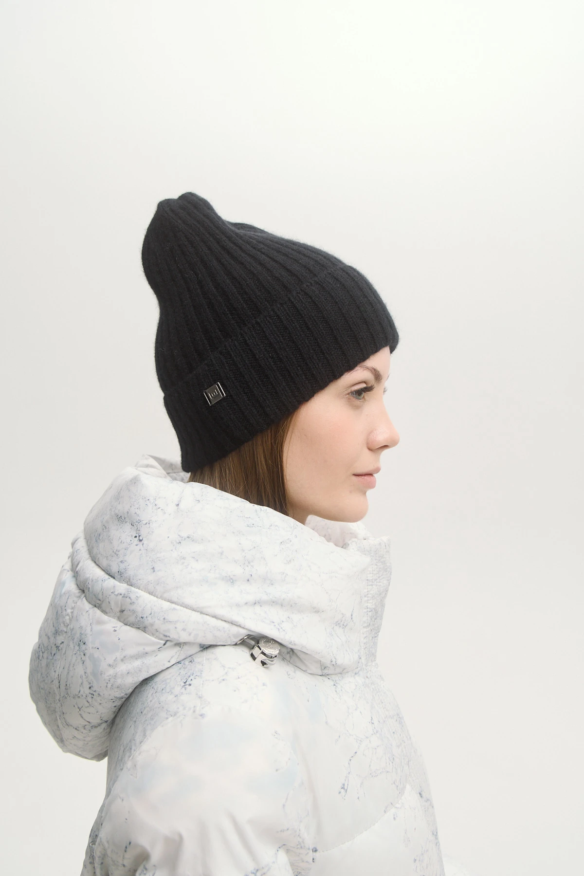 Сдержанная и тёплая — эта модель станет базовым элементом зимнего гардероба. Глубокий чёрный оттенок универсален и легко сочетается с верхней одеждой любых тонов. Шапка выполнена из мягкой пряжи с добавлением кашемира и ангоры: она тактильно приятна, сохраняет тепло и имеет комфортную посадку по голове. Объёмная фактурная вязка придаёт модели выразительность.
