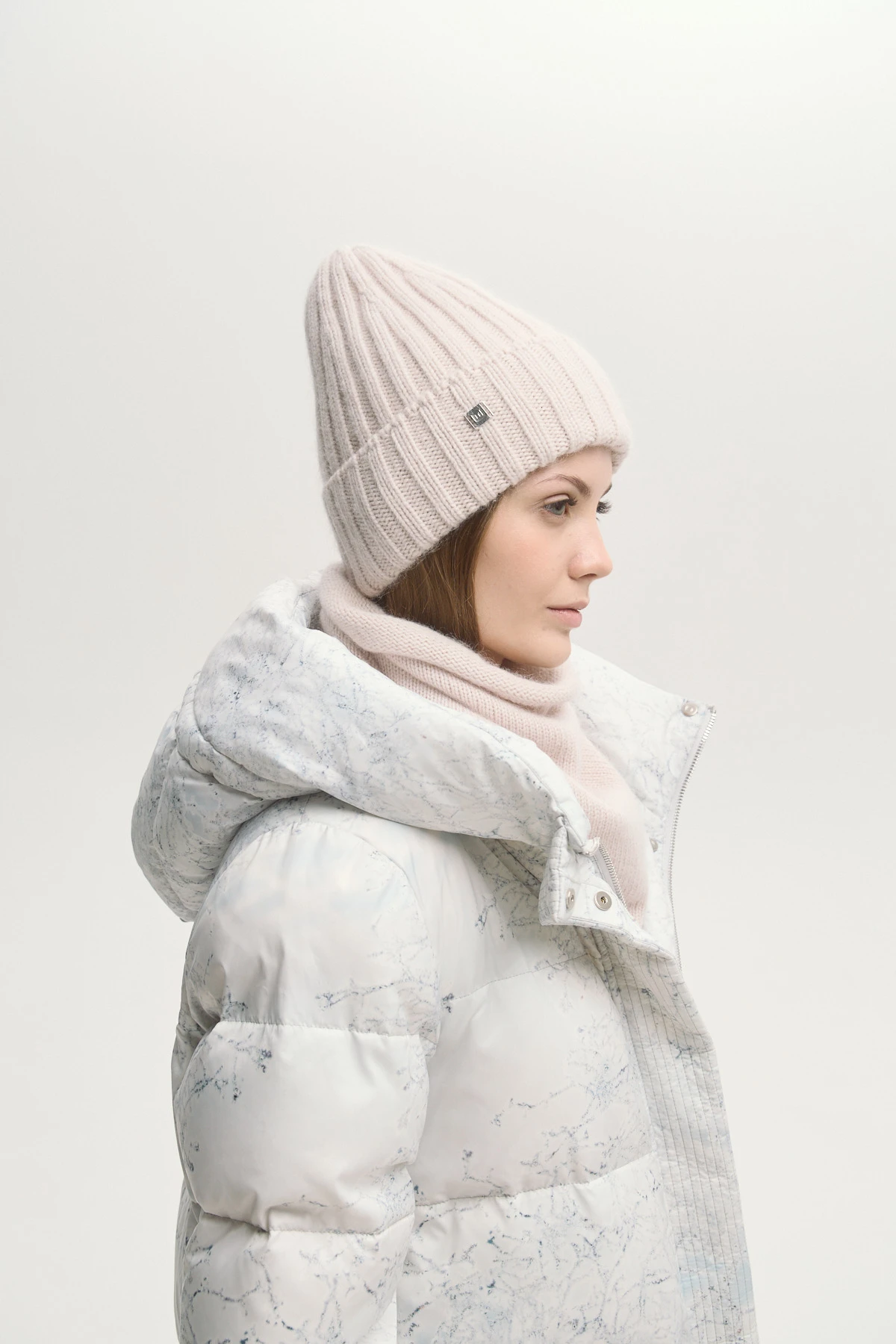 Уютная шапка с подкладкой из флиса, созданная для комфорта даже в самые холодные дни. Нежная фактура с ангорой и мохером делает модель особенно тактильно приятной. Светлый оттенок топлёного молока подчёркивает свежесть кожи и мягкость черт лица. Подкладка защищает от ветра, а эластичная вязка хорошо держит форму и не теряет объём.