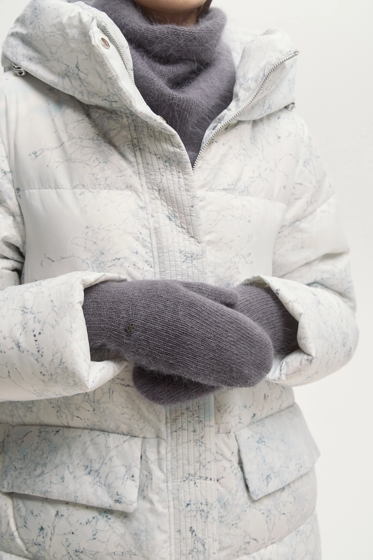 Варежки с пушистой фактурой и мягкой посадкой. Эластичная резинка надёжно фиксирует варежки на запястье и защищает от холода. Металлическая фурнитура с логотипом добавляет лаконичный акцент. Универсальный серый оттенок легко сочетается с верхней одеждой в светлой или нейтральной гамме.