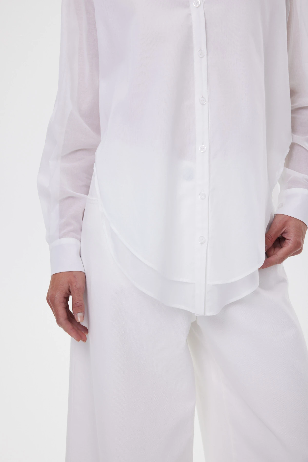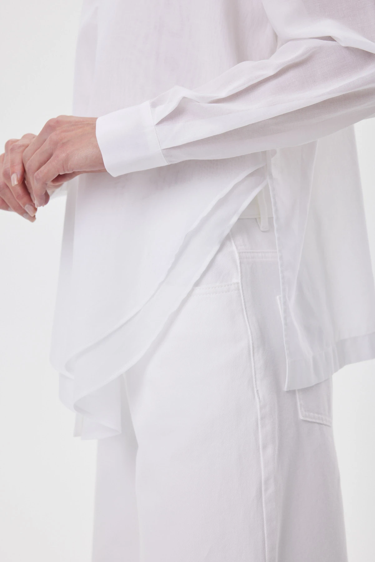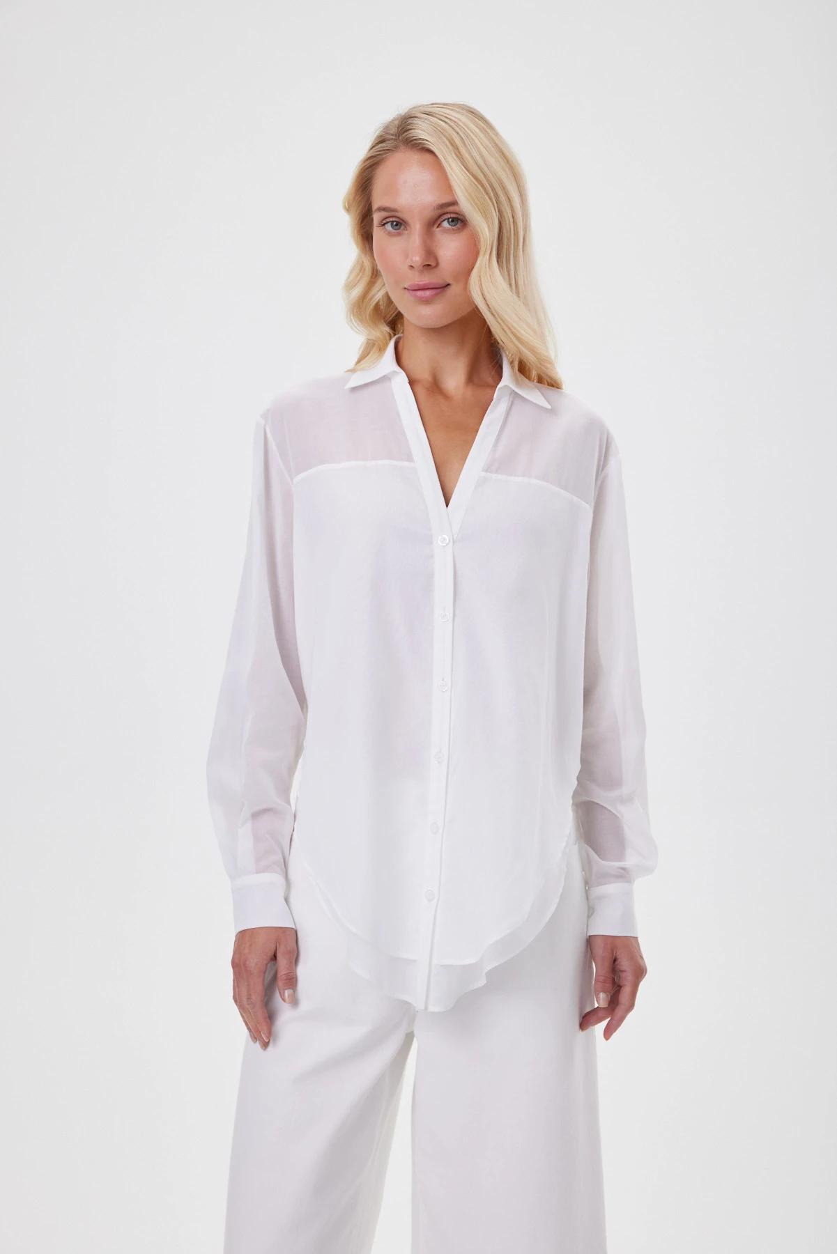 Блузка-рубашка выполнена из тончайшего 100% хлопка с редким полотняным переплетением — материал получился полупрозрачным, почти воздушным. Острый глубокий вырез уравновешивает общую мягкость и женственность, добавляя дерзости. Хлопок воздухопроницаемый, мягкий, адаптивный к телу. Перед построен на игре длин: верхний слой повторяет классическую форму, нижний — чуть длиннее и округлён, формируя мягкую вертикаль и собирая силуэт. Для комфортной носки предусмотрен двойной слой по переду — он уменьшает просвет и подчёркивает эффект двухслойности, а высокие боковые разрезы позволяют завязать нижний слой узлом, подчеркнув талию, или носить свободно — для воздуха и пластичного движения ткани.