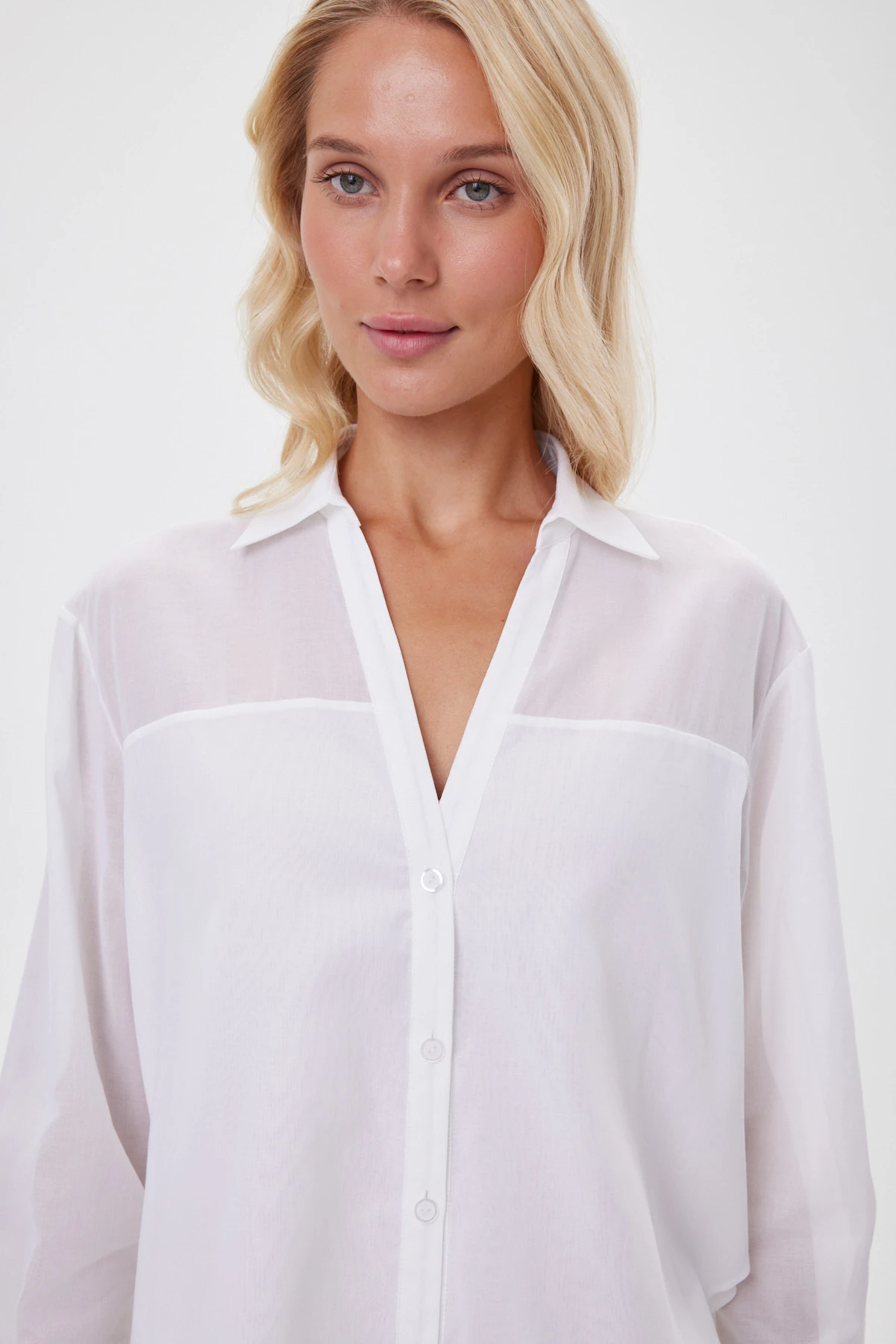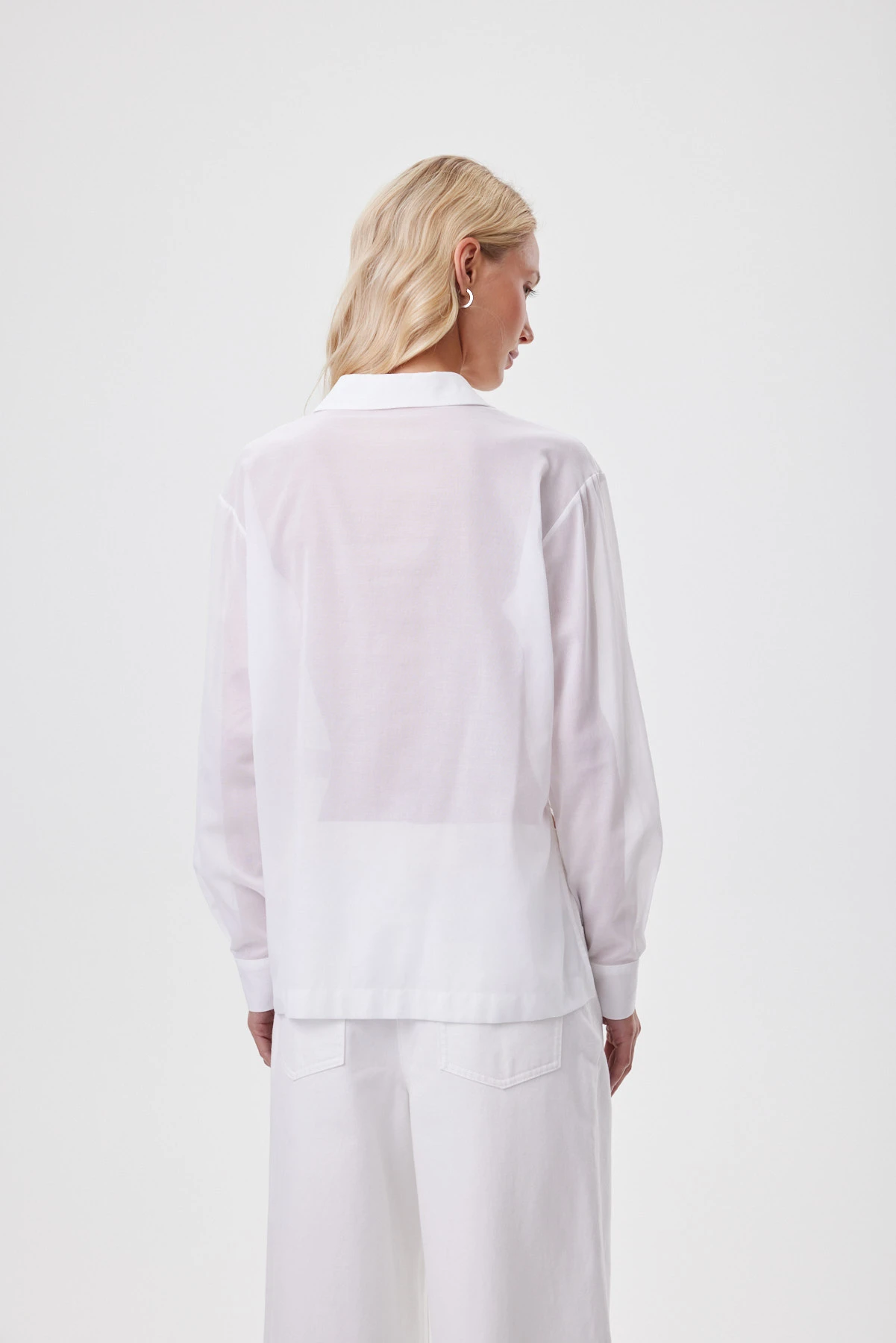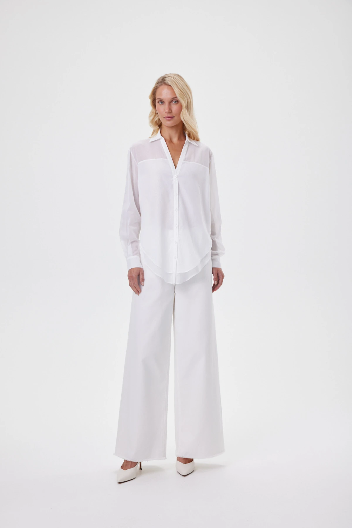 Блузка-рубашка выполнена из тончайшего 100% хлопка с редким полотняным переплетением — материал получился полупрозрачным, почти воздушным. Острый глубокий вырез уравновешивает общую мягкость и женственность, добавляя дерзости. Хлопок воздухопроницаемый, мягкий, адаптивный к телу. Перед построен на игре длин: верхний слой повторяет классическую форму, нижний — чуть длиннее и округлён, формируя мягкую вертикаль и собирая силуэт. Для комфортной носки предусмотрен двойной слой по переду — он уменьшает просвет и подчёркивает эффект двухслойности, а высокие боковые разрезы позволяют завязать нижний слой узлом, подчеркнув талию, или носить свободно — для воздуха и пластичного движения ткани.