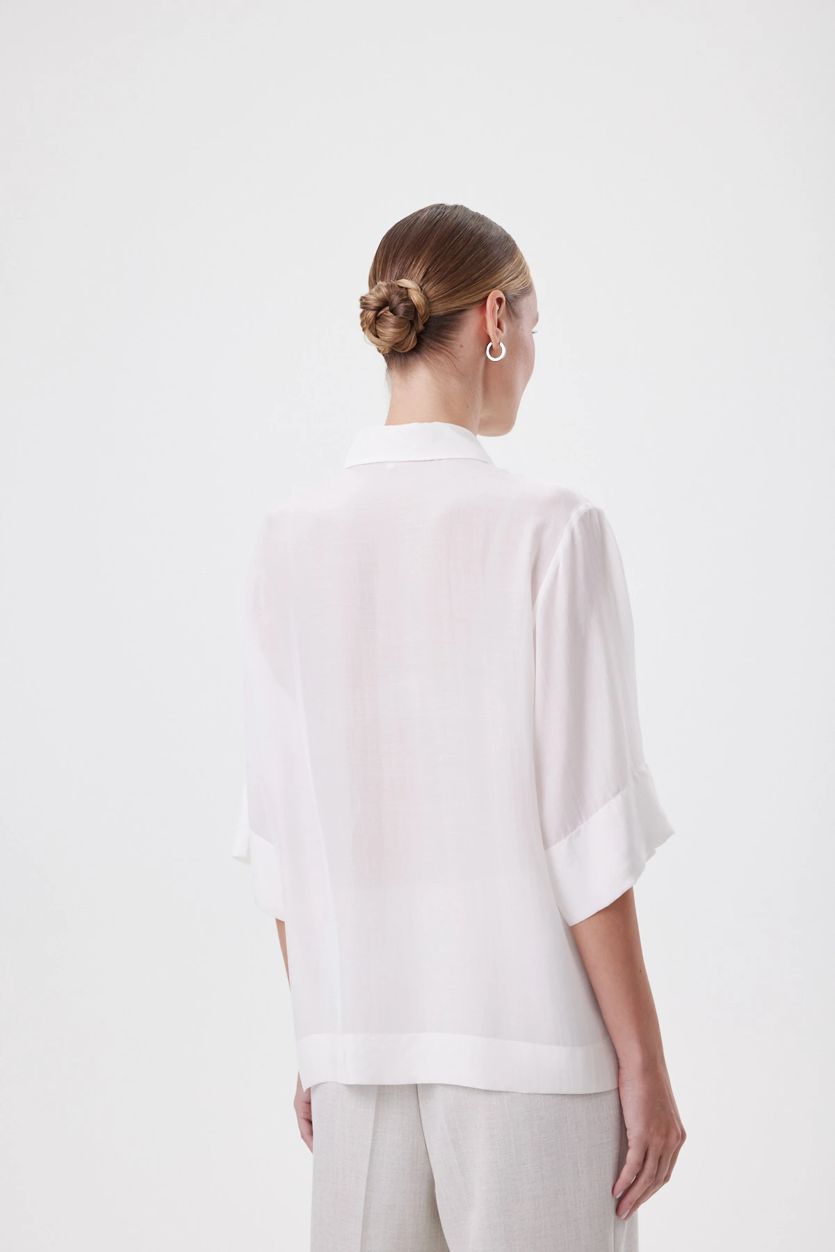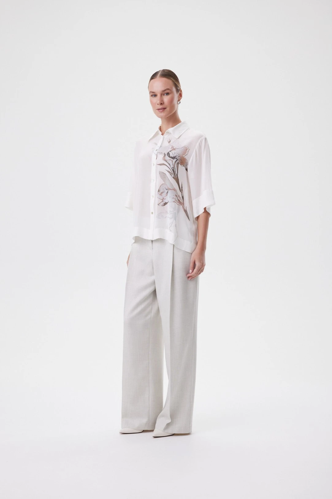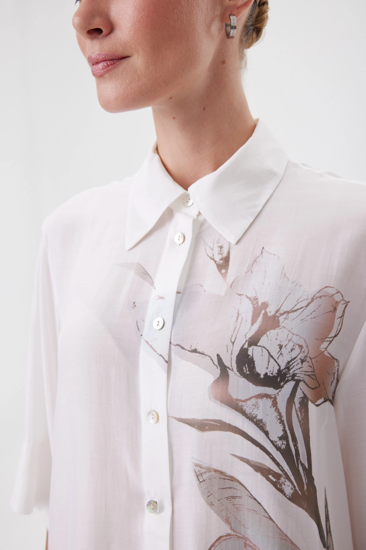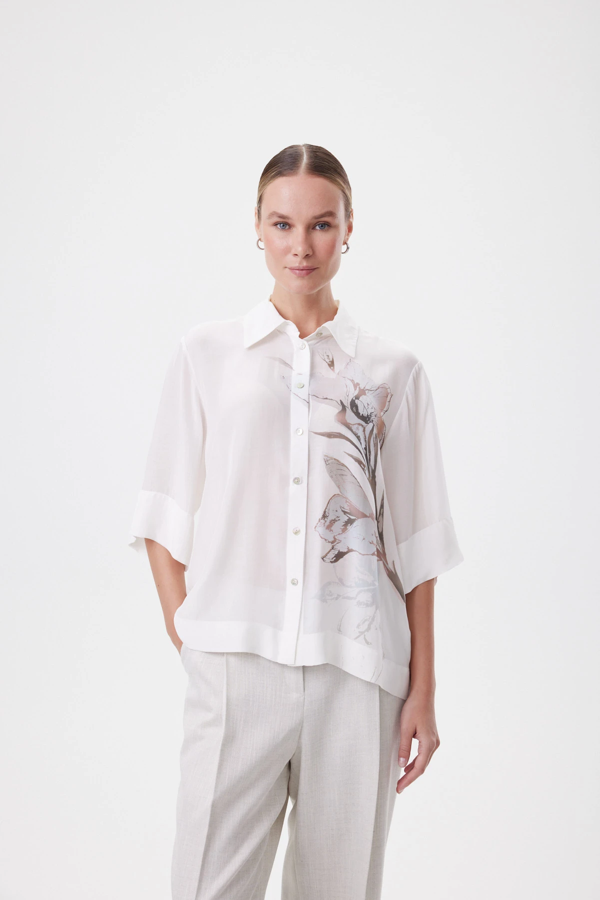 Блузка в свободном oversize-силуэте садится так, будто ткань скользит по фигуре: объём мягкий, без лишней «тяжести», а рукав ¾ открывает запястье и делает пропорции гармоничнее. Классический воротник и планка на пуговицах добавляют собранности, а широкие подгибки по низу и рукавам фиксируют форму — силуэт выглядит аккуратно даже в расслабленной посадке. Материал пластичный, мягкий и буквально скользит по коже. Ткань полупрозрачная, и летом такой эффект делает образ изящным и женственным, добавляя чувственности без излишней откровенности. Принт гладиолуса с деликатной асимметрие создаёт ощущение «движущегося» рисунка. Перламутровые пуговицы поддерживают тему света и блика. Носите с белыми брюками и денимом для дневного образа, с юбкой прямого силуэта — для более собранного, или вторым слоем поверх топа в жару.