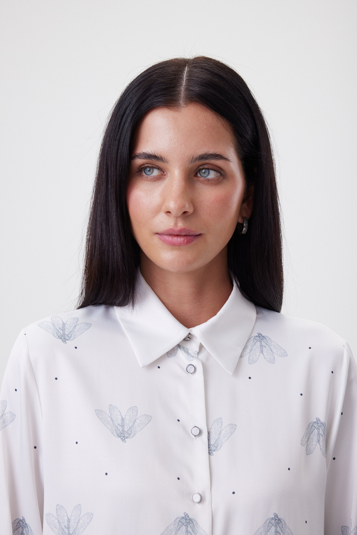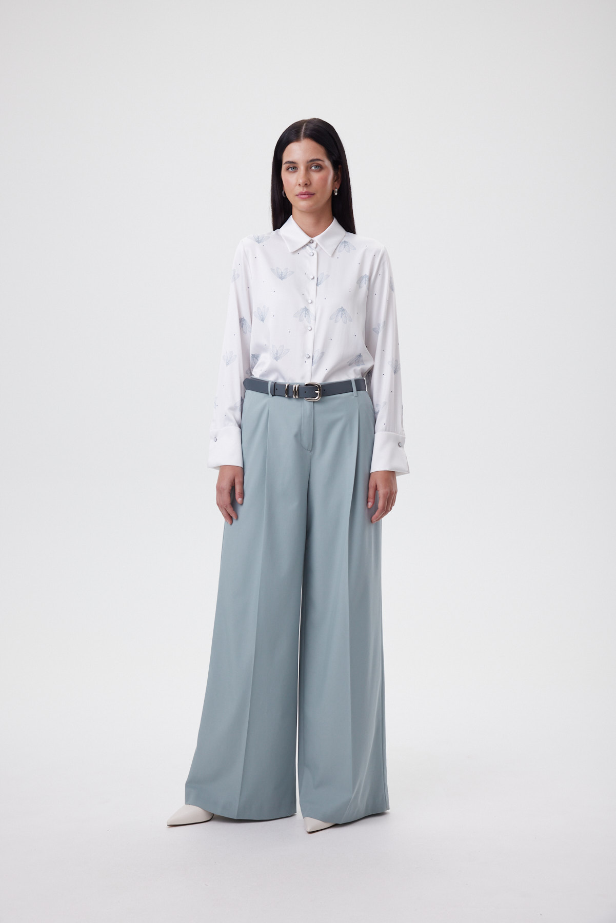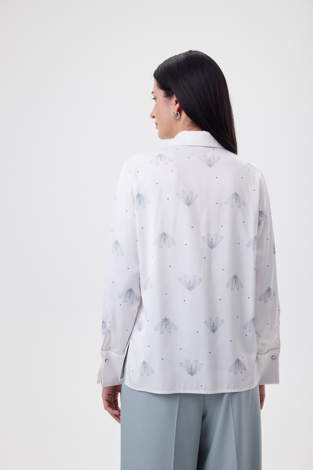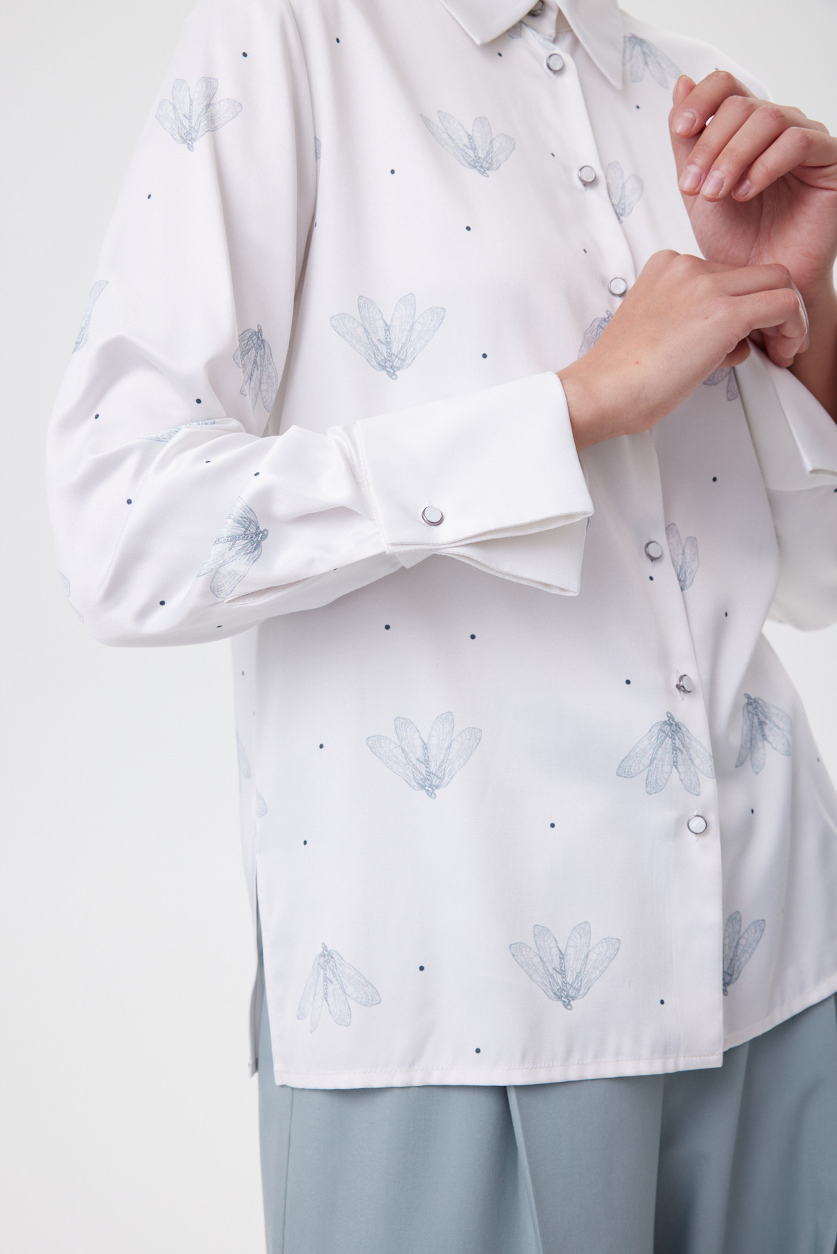 Блузка из мягкой премиальной поливискозы приятна к телу, деликатно драпируется и весь день выглядит собранно без сложного ухода и лишней утюжки. Свободная форма остаётся аккуратной и «умной»: даёт воздух вокруг фигуры, не уходя в oversize, а боковые разрезы позволяют красиво носить её навыпуск. Главный акцент — авторский принт с невесомыми мотыльками, выполненный прямой цифровой печатью: линии остаются графично чёткими, переходы — тонкими, рисунок не тускнеет и сохраняется после стирок. Высокий манжет, сложенный пополам, оформлен по принципу «имитации запонки» — две перламутровые пуговицы работают как ювелирная деталь и поддерживают изящную, современную графику модели.