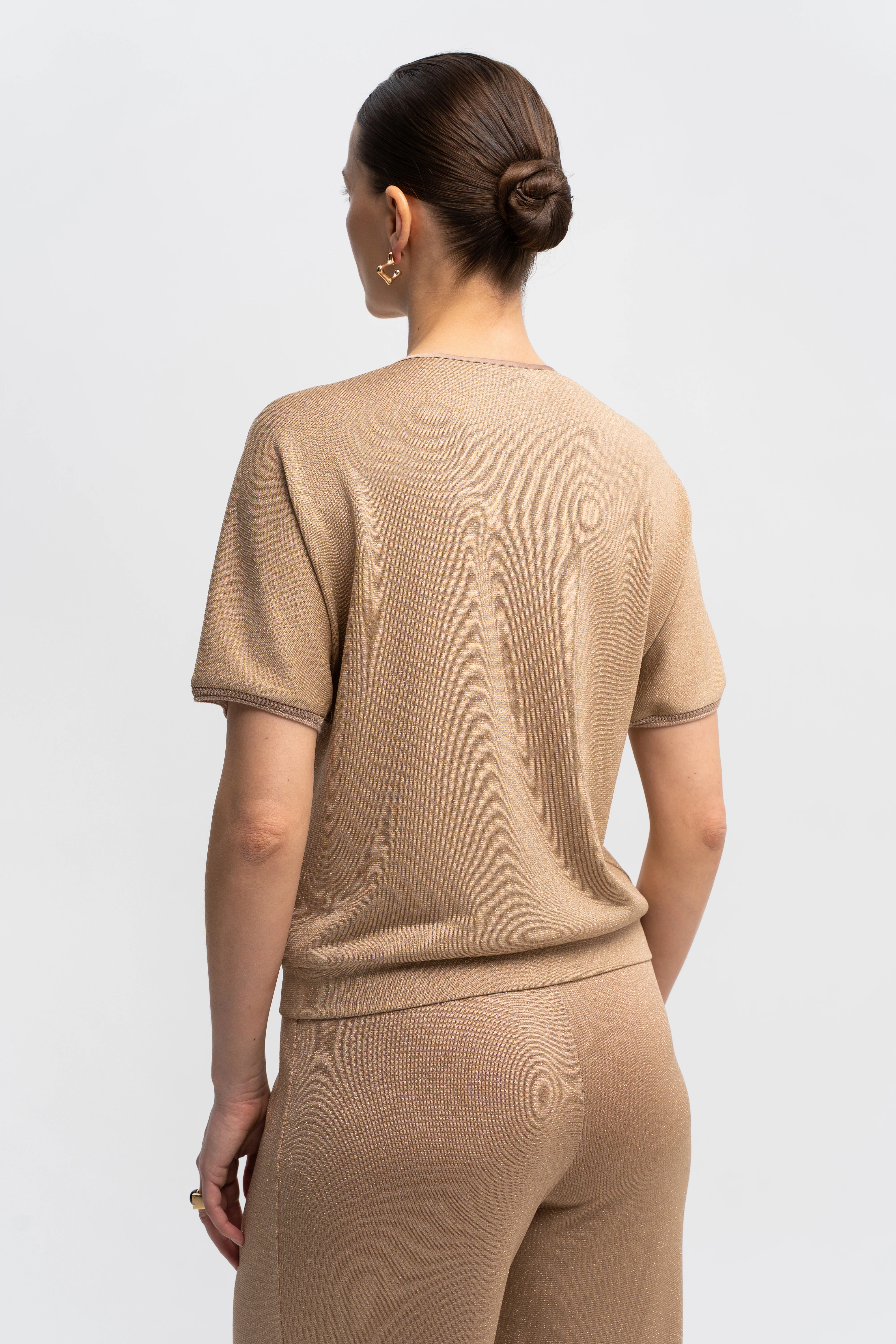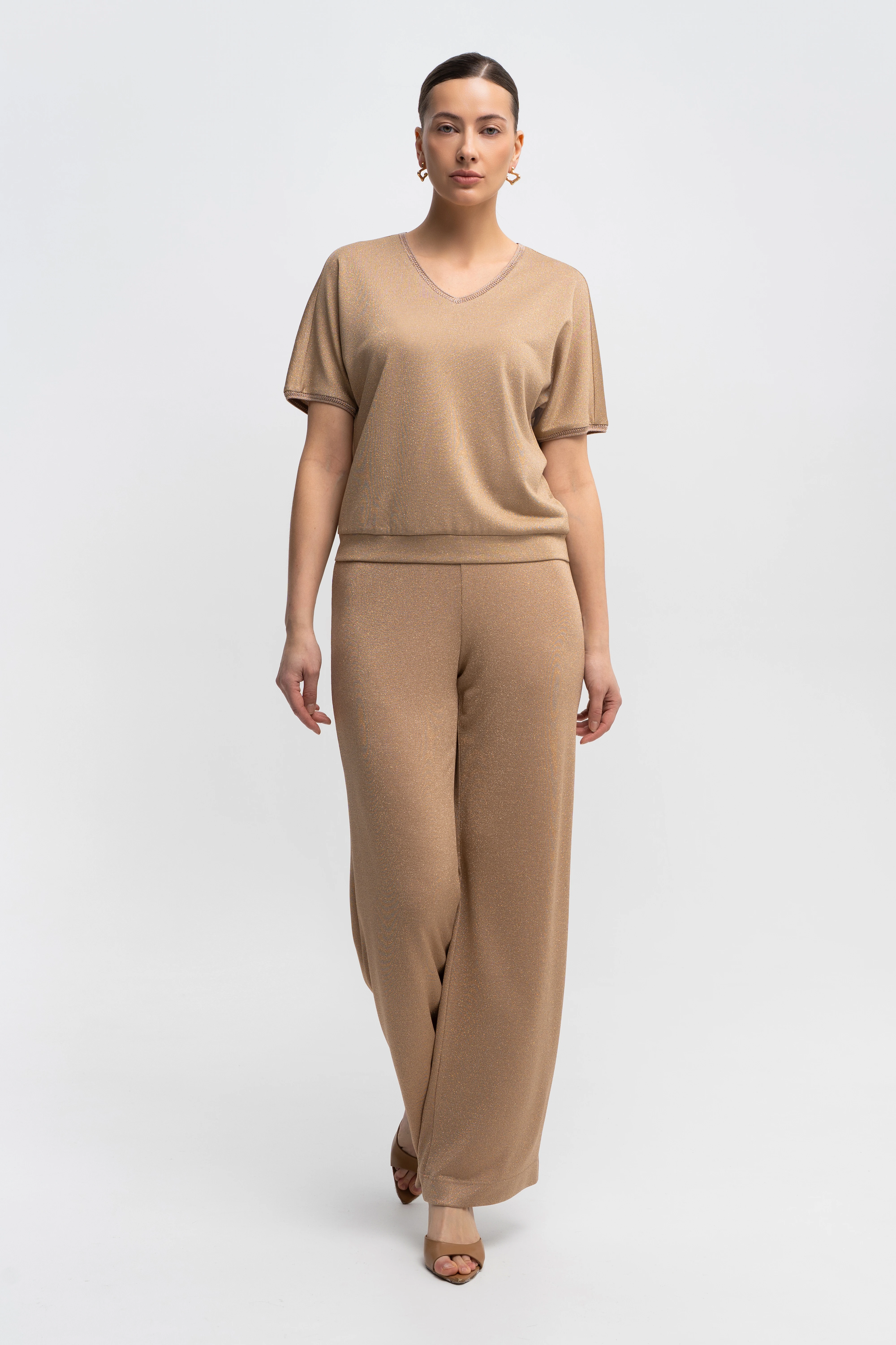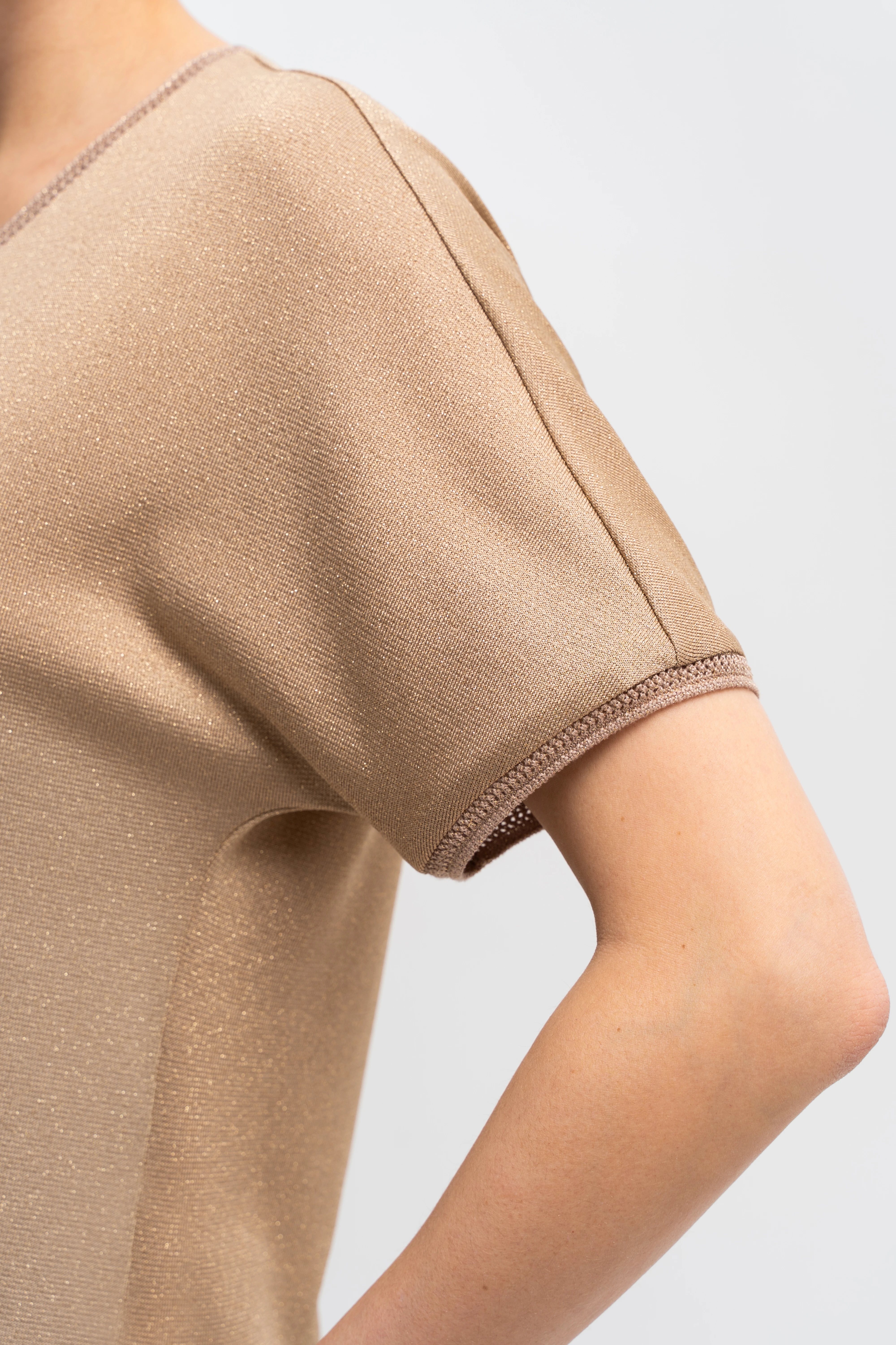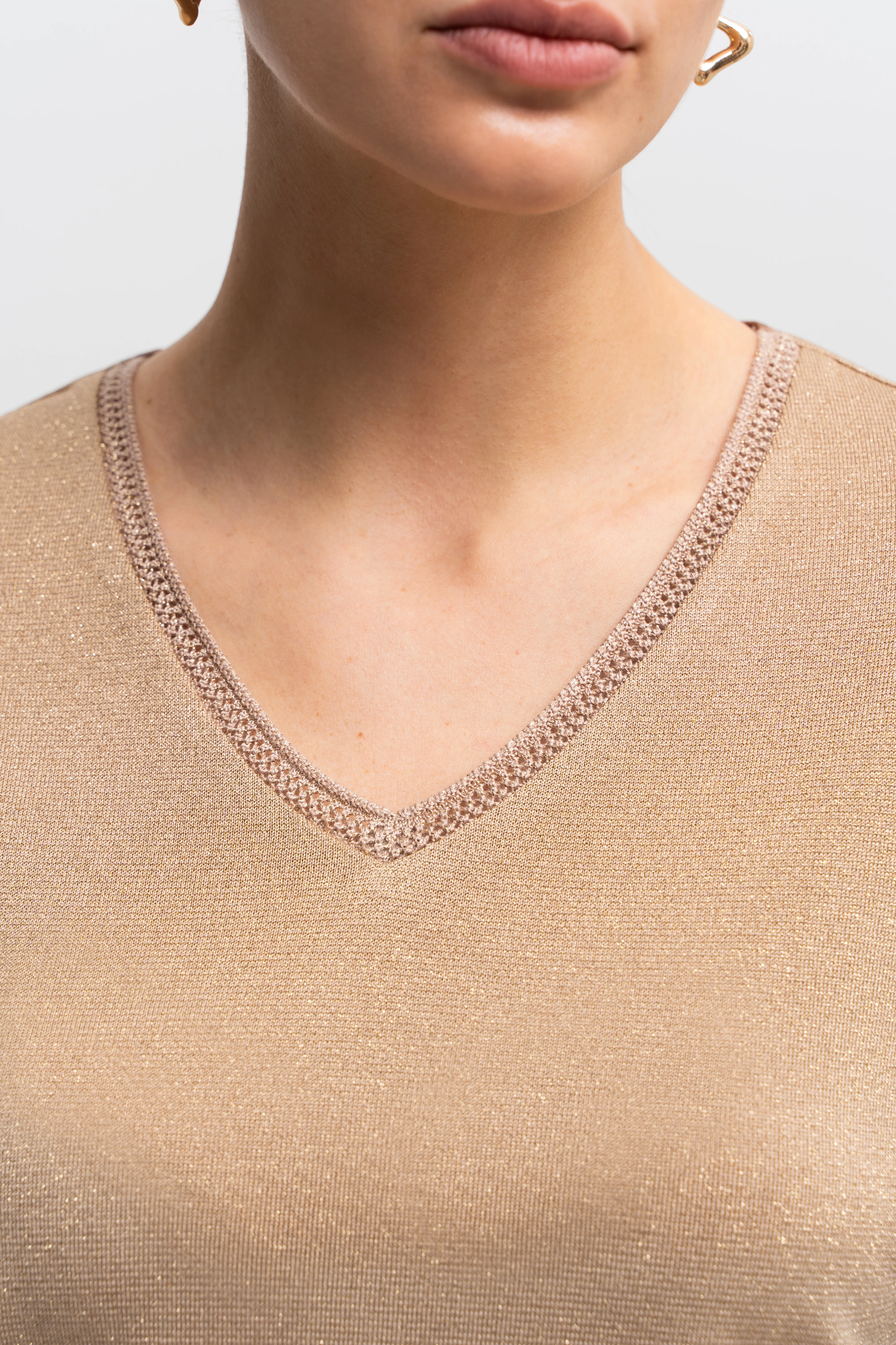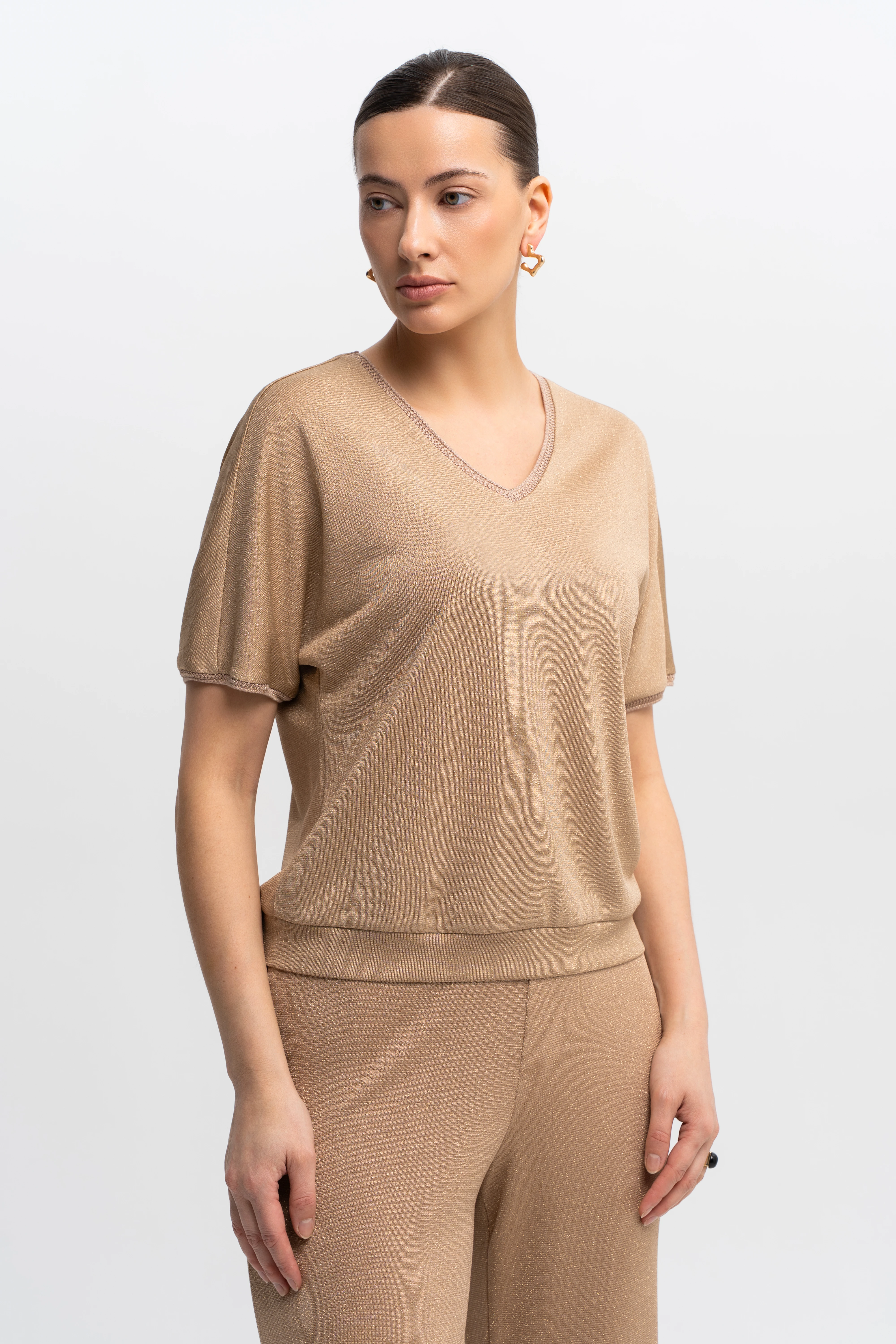 Блузон свободного силуэта с цельнокроеным рукавом типа «летучая мышь». Такой крой визуально смягчает плечевую зону, деликатно скрывает область плеча и руки, создаёт эффект лёгкой драпировки в движении. V-образный вырез подчеркивает линию шеи и формирует вертикаль по центру корпуса, балансируя пропорции. Премиальный трикотаж на основе района прохладен к коже и пластично струится, метанит даёт тонкое «шёлковое» свечение, а эластан помогает сохранять аккуратную посадку без вытяжения. Ажурная отделка по горловине и краям рукавов добавляет изящества. Нюдово-бежевый монохром с мягким сиянием легко собирается и для дневных, и для вечерних образов.