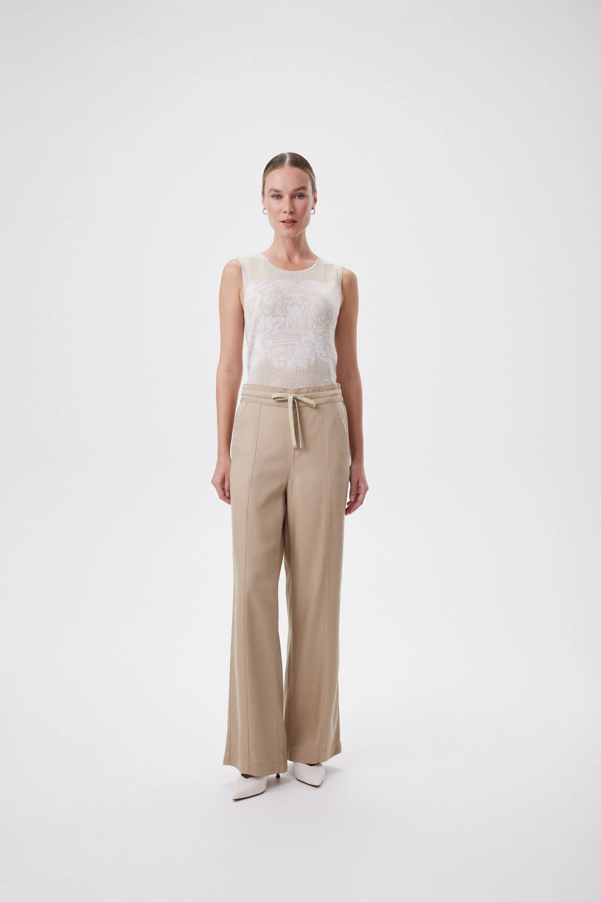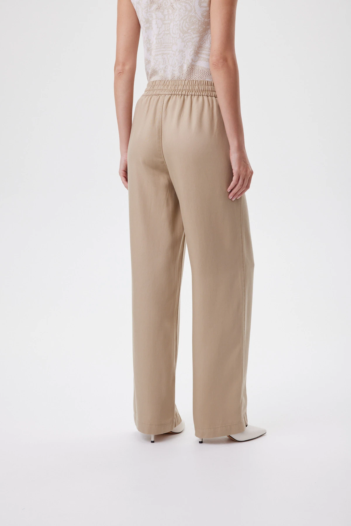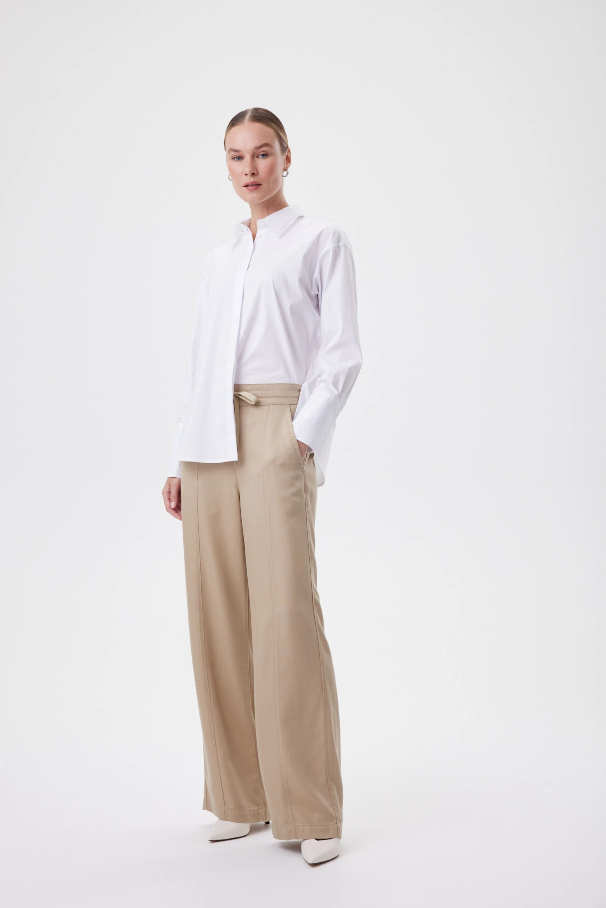 Джинсовые брюки из премиального тенсела особенно ценятся за мягкость и гладкость: ткань словно «дышит», тактильно приятная к коже, держит форму без утяжеления. Природно-песочный оттенок звучит благородно — он легко вписывается и в повседневные, и в более собранные рабочие комплекты. Силуэт свободный и расслабленный, но структурный: стрелки и вертикальные швы формируют чёткую линию и визуально удлиняют ноги. Форма брючин выдержана в современной трактовке: они мягко расширяются книзу, создавая ровную вертикальную линию от бедра до пола. За счёт такой конструкции брюки работают с разными типами фигуры, не подчёркивая лишнее.