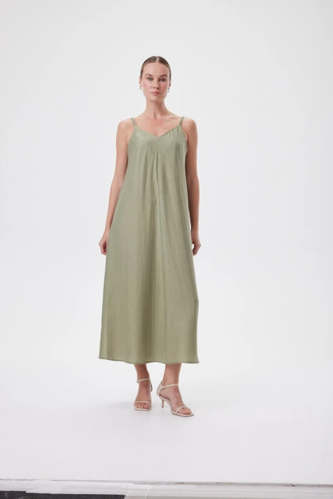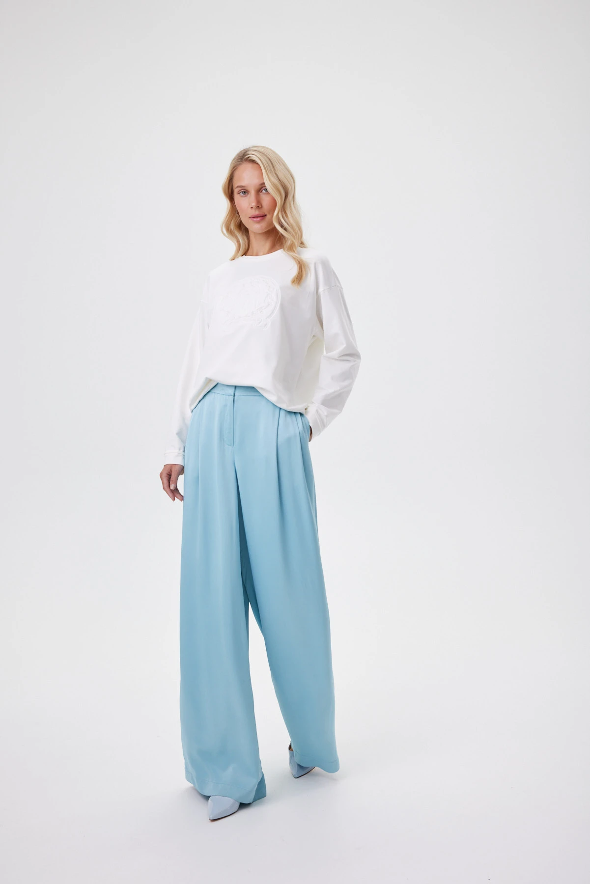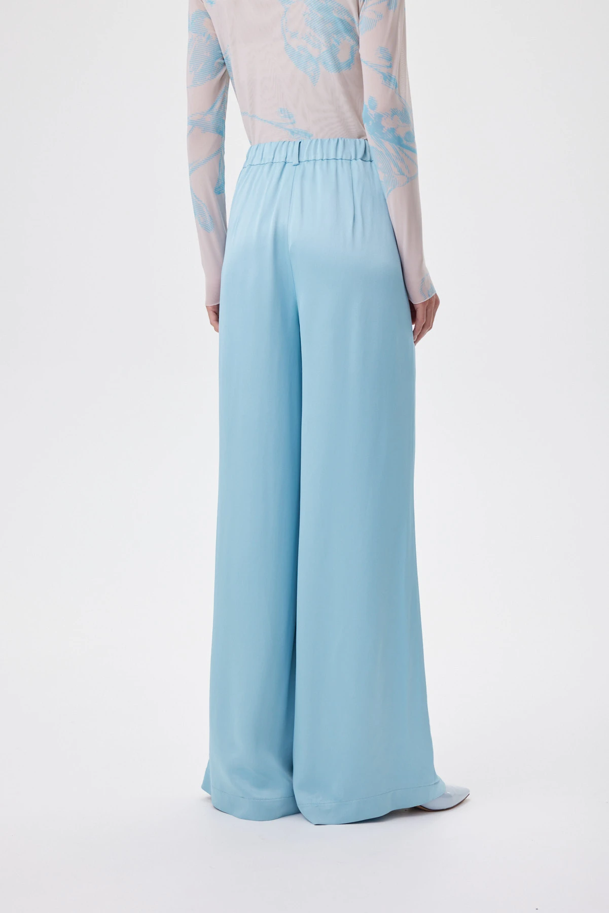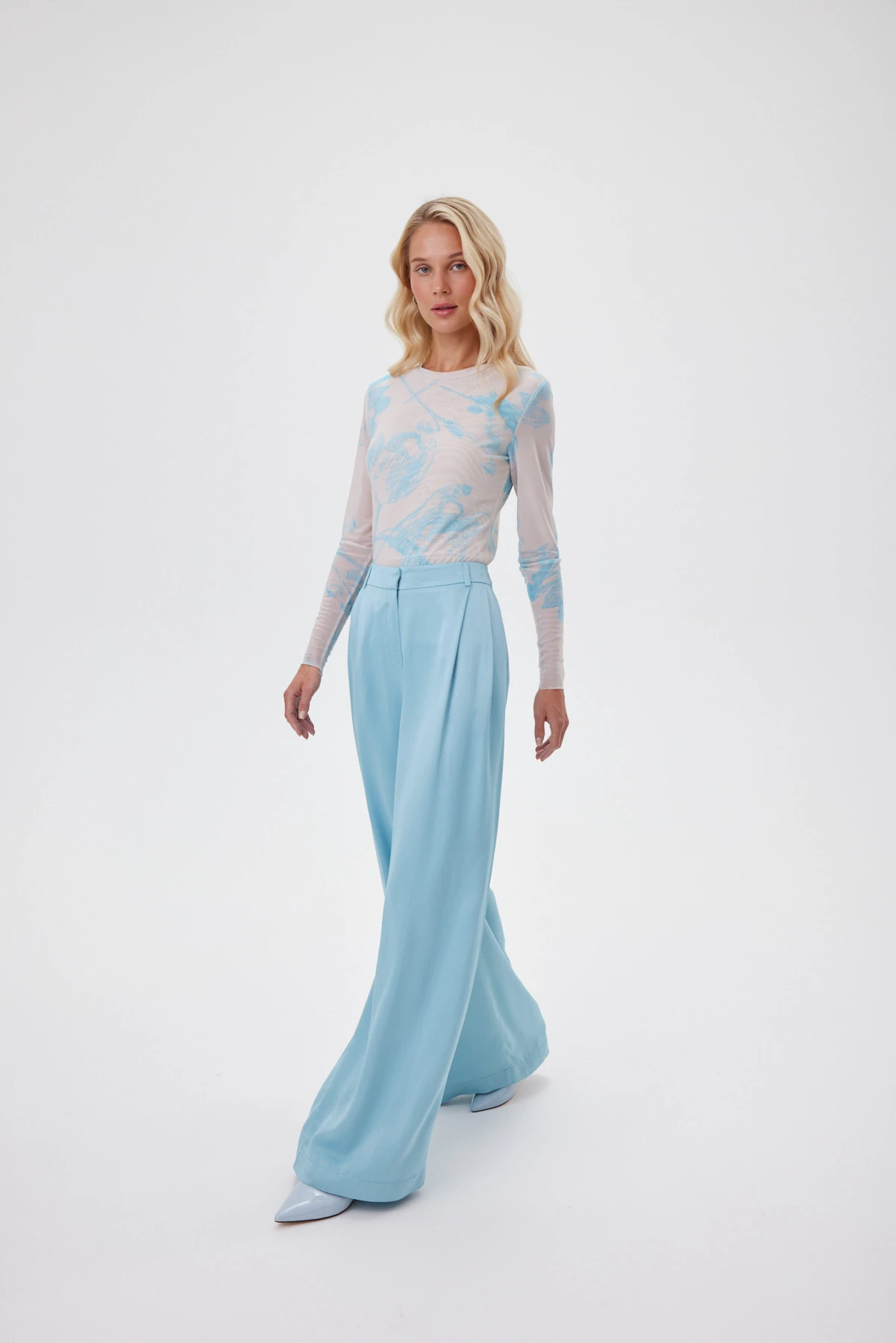 Брюки с двумя мягкими складками формируют естественный объём и при этом визуально вытягивают силуэт, создавая эффект воздушности и демонстрируя женственные линии. Эластичная вставка в поясе обеспечивает комфорт и вариативную посадку без давления. Модель не деформируется в носке и сохраняет цвет. Ткань с сатиновым переплетением и лёгкой креповой текстурой сложного лазурного оттенка мягко ловит свет, оставляя деликатное сияние по всей поверхности.