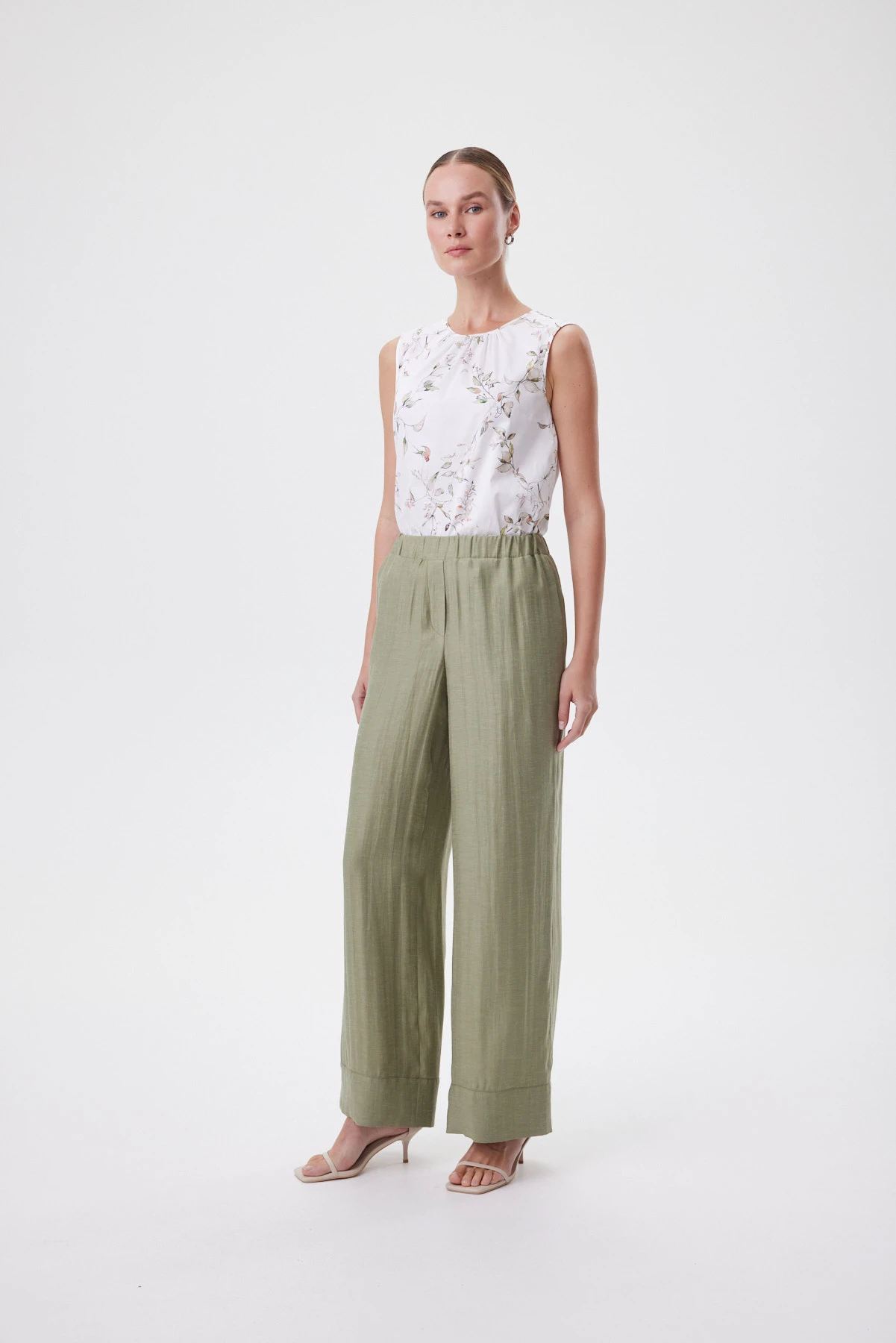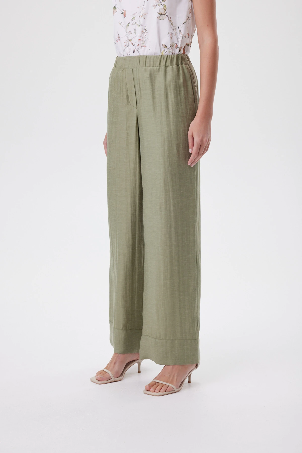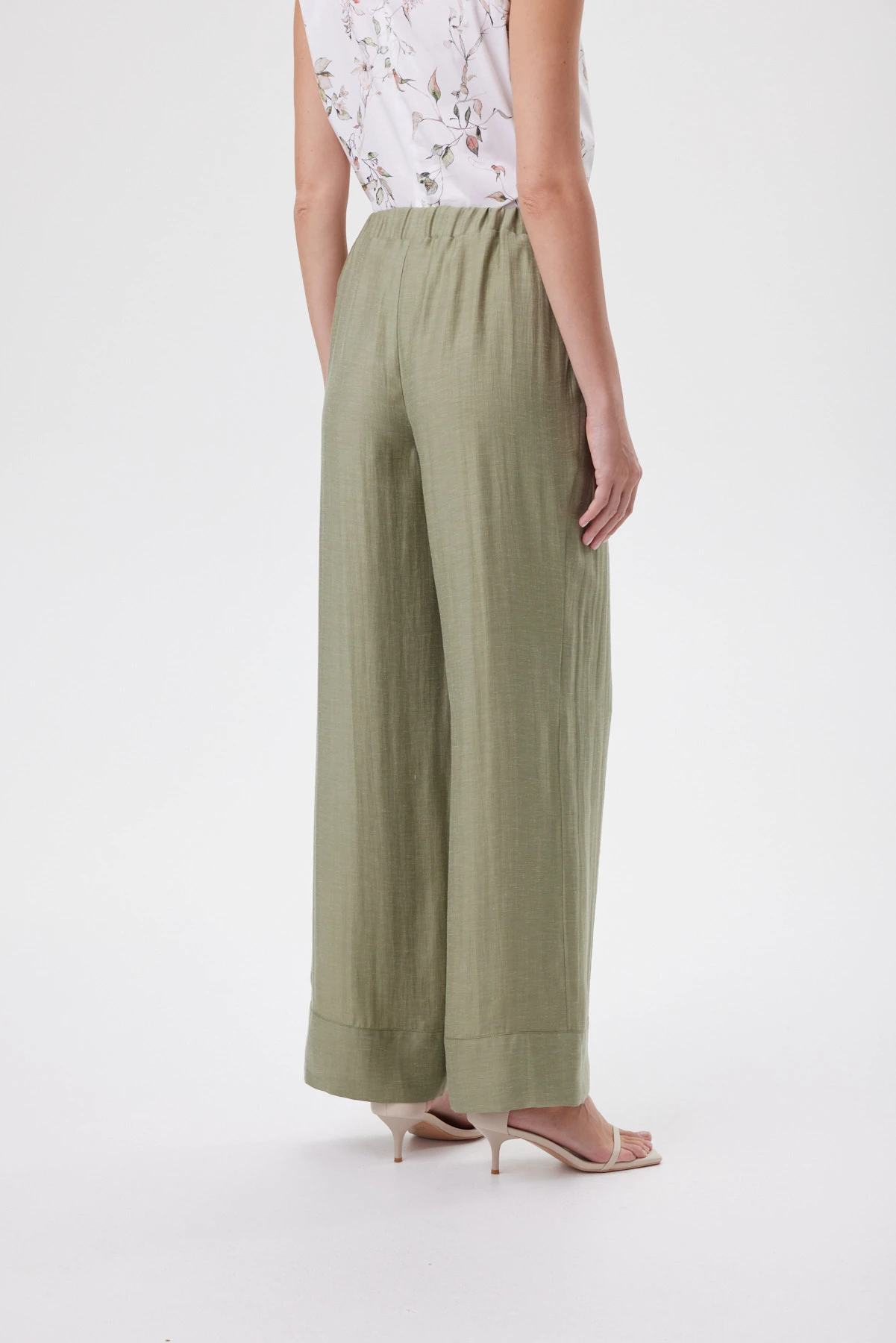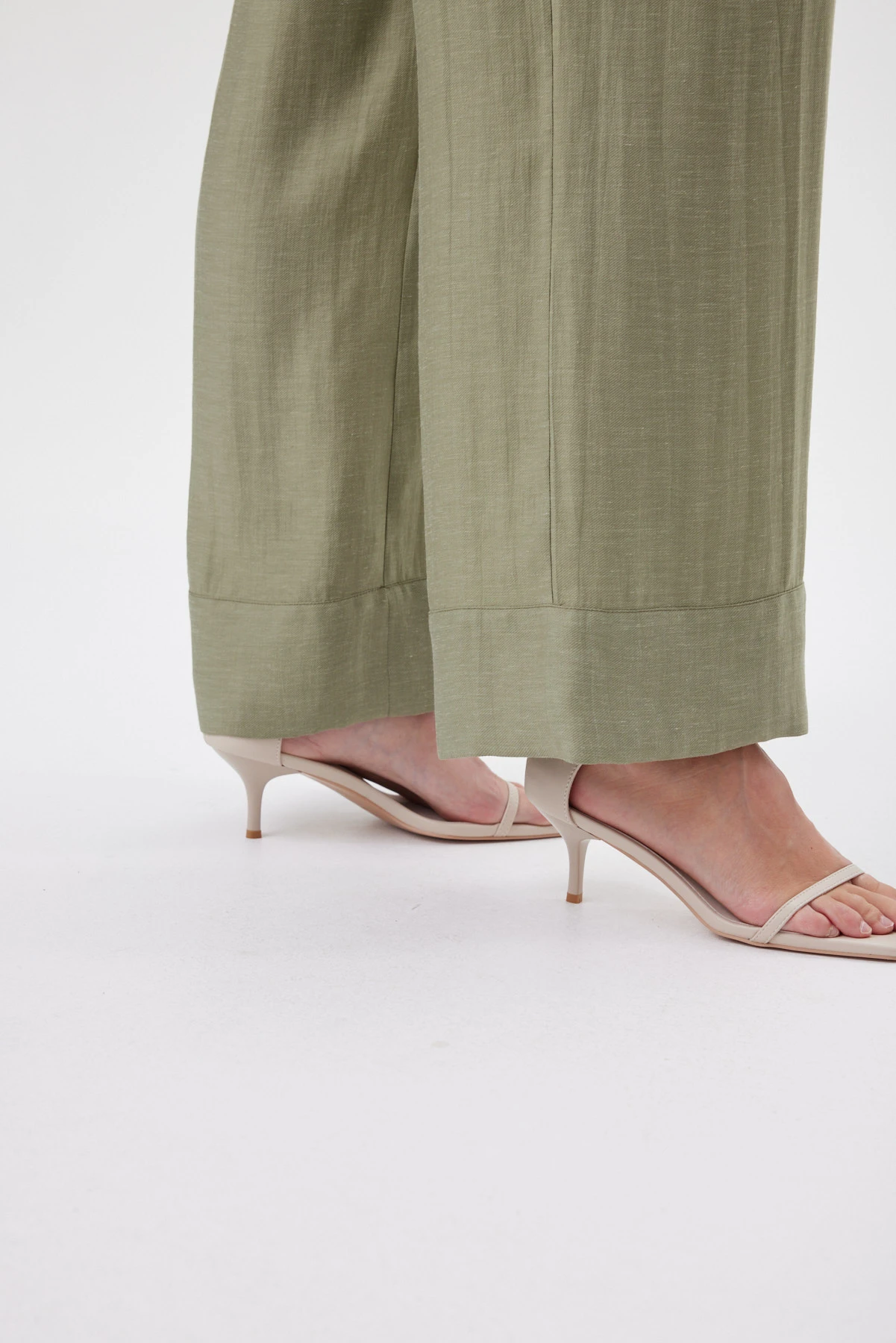 Брюки выполнены в форме палаццо, но с корректной степенью расширения: они струятся вниз мягкими вертикальными линиями, которые визуально вытягивают силуэт. Посадка комфортная — пояс полностью на эластичной ленте. Имитация гульфика добавляет собранности переду — получается расслабленная элегантность без лишней строгости. Льняная фактура даёт живую, природную текстуру и делает оливковый оттенок особенно свежим и спокойным. Карманы в боковых швах не утяжеляют бёдра. Для стабилизации низ брючин оформлен притачной широкой манжетой. Брюки сочетаются с белым топом и рубашкой, с жакетом-кимоно или с лёгким трикотажем.