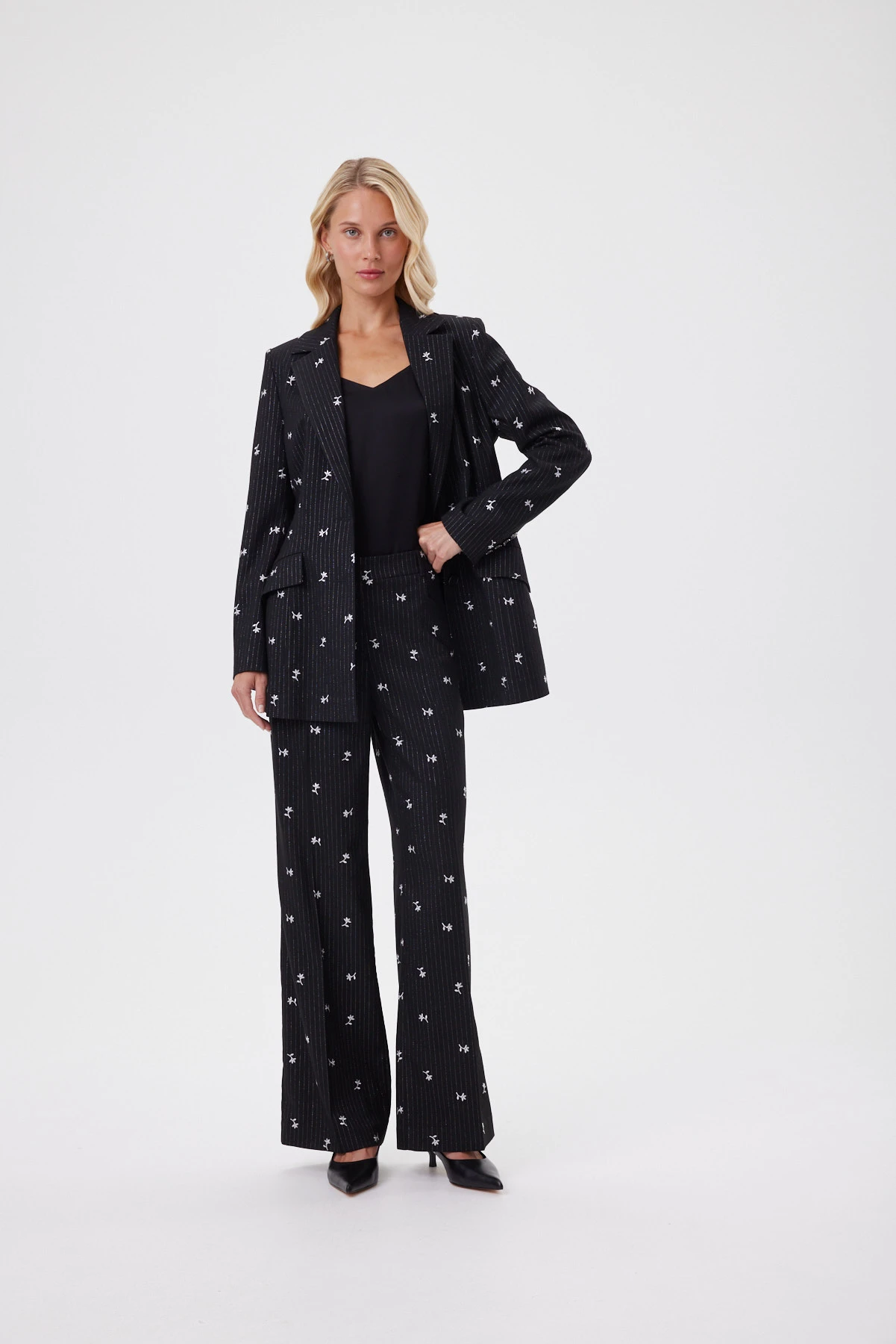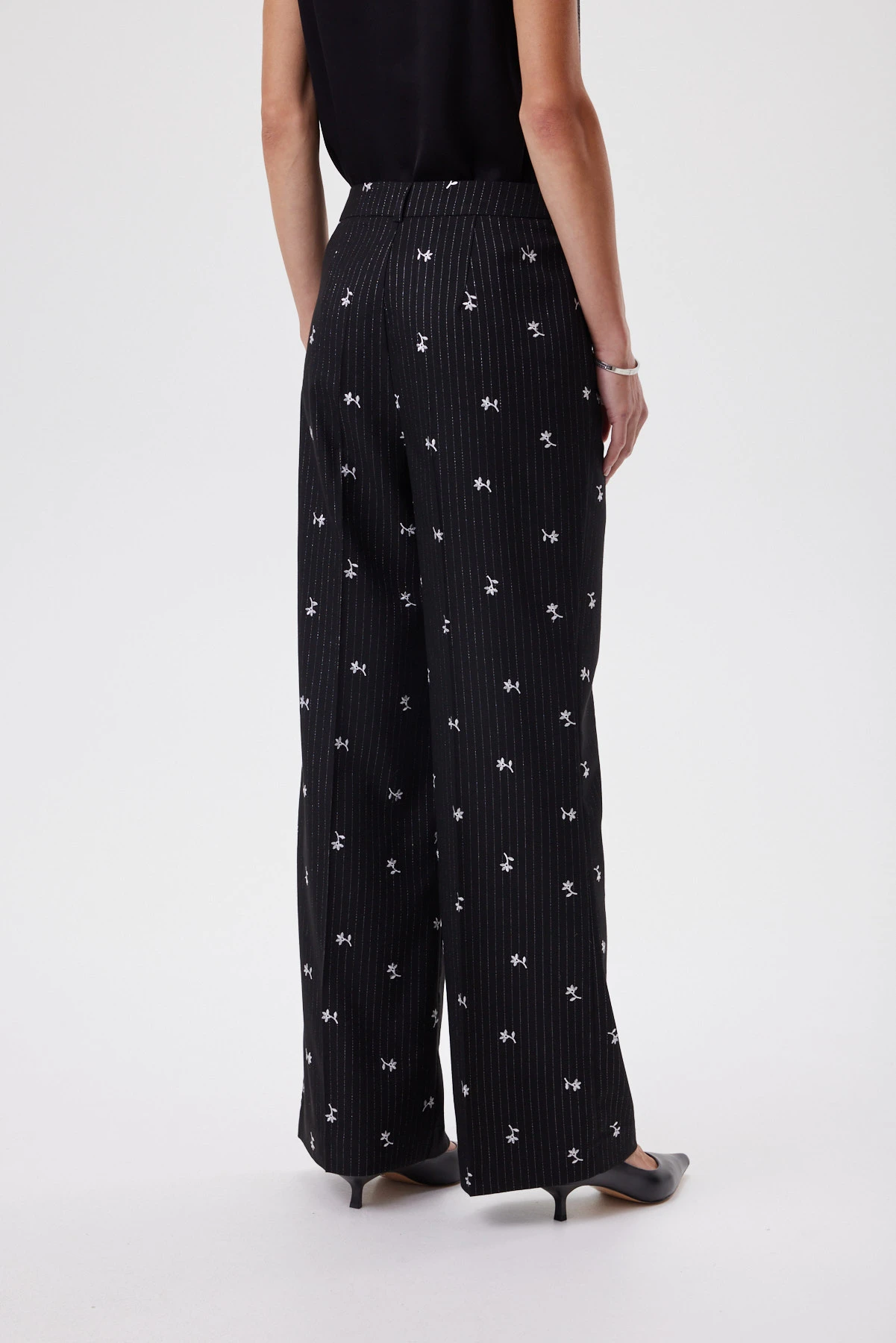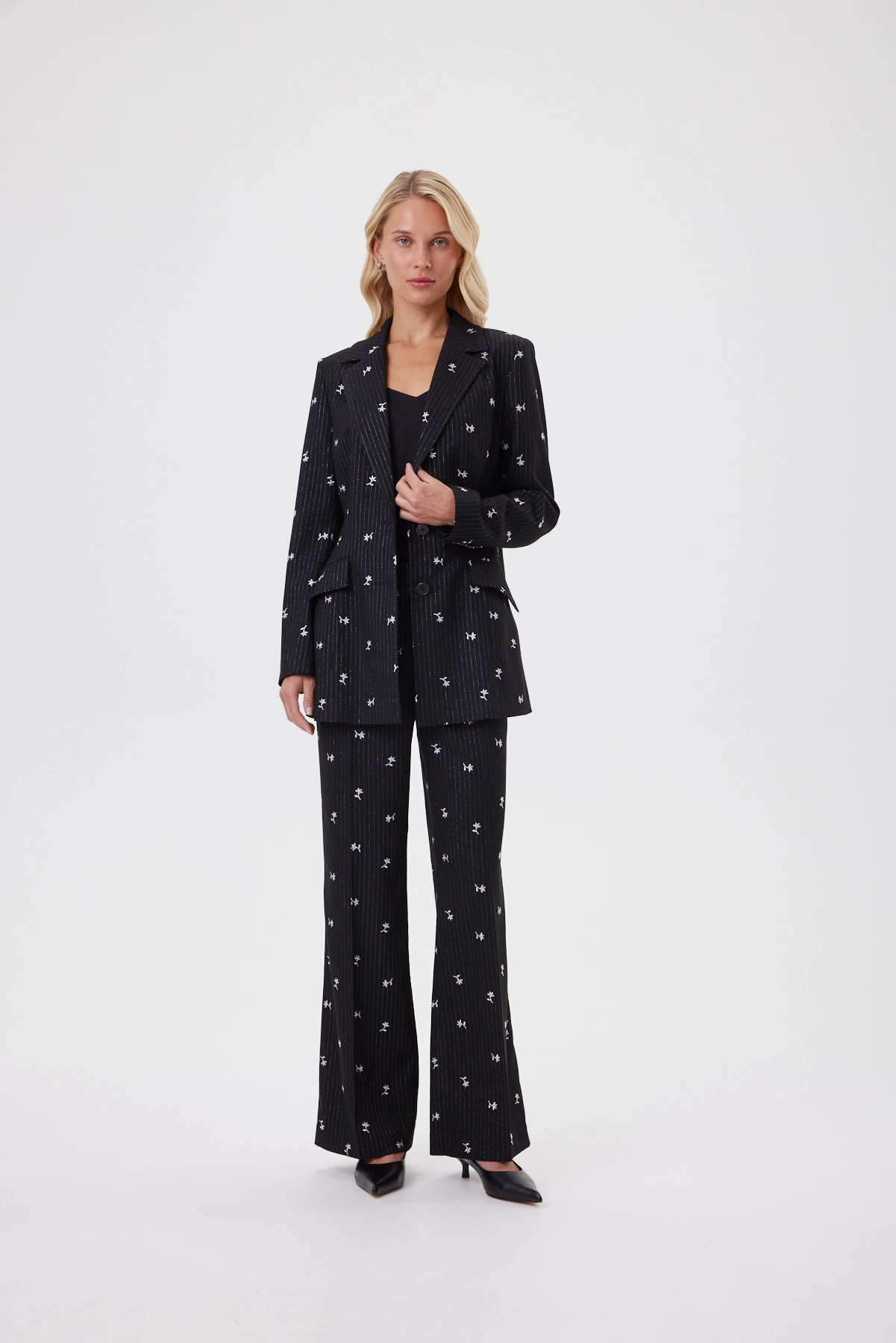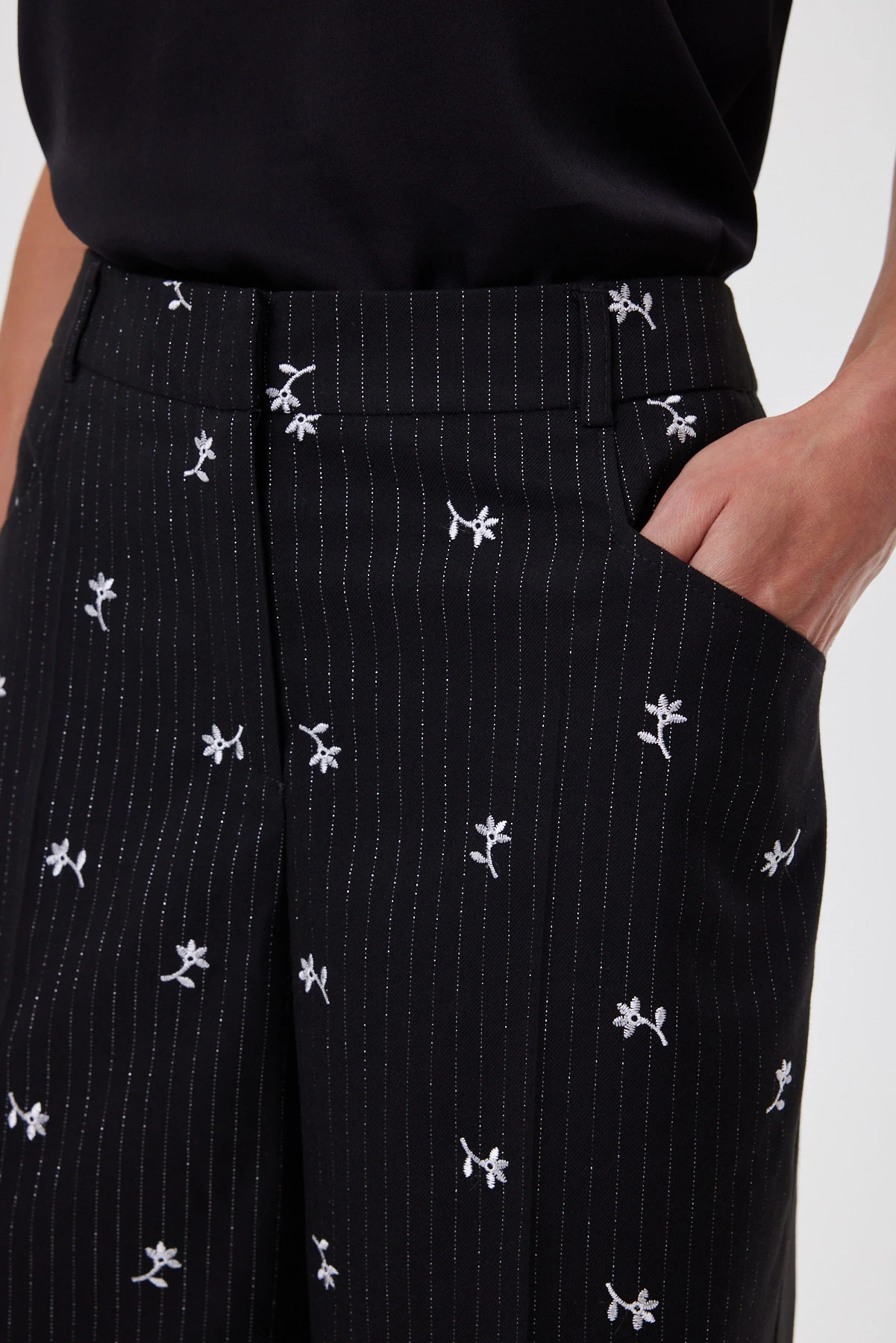 Брюки выполнены в современном прямом силуэте с лёгким расширением от бедра — это самый универсальный крой, который выравнивает пропорции и визуально вытягивает ноги даже без каблуков. Посадка ближе к классической: пояс фиксирует талию комфортно, а чистая вертикаль по всей длине делает силуэт собранным и стройным. Плотная костюмная ткань держит форму, не просвечивает и не вытягивается в коленях, оставаясь пластичной в движении. Деликатная полоска и равномерная вышивка мини-цветов и фламинго усиливают вертикальный ритм и добавляют образу нюансную выразительность. Карманы спрятаны в боковые швы, чтобы не утяжелять бёдра, а шлёвки и аккуратная обработка пояса поддерживают «костюмный» уровень. Комплектуется с жакетом из капсулы, с белой рубашкой или с топом и лоферами для образа в стиле casual.