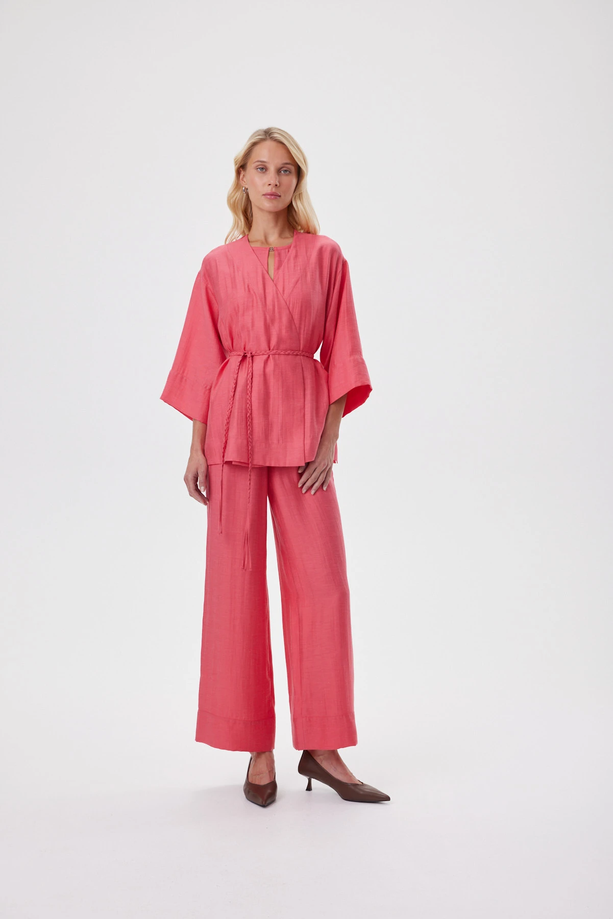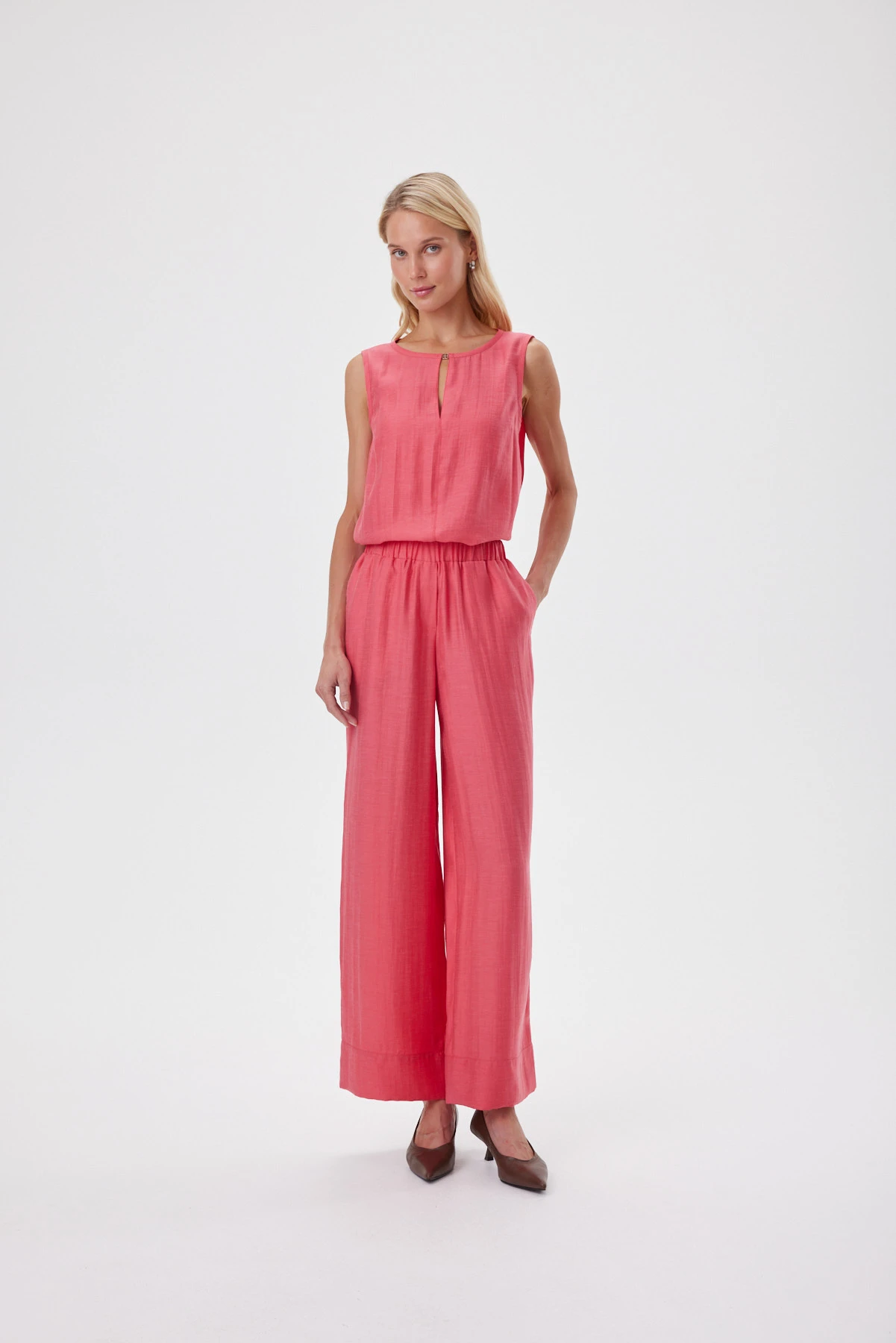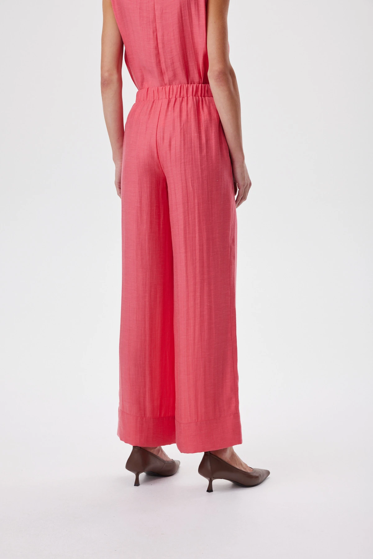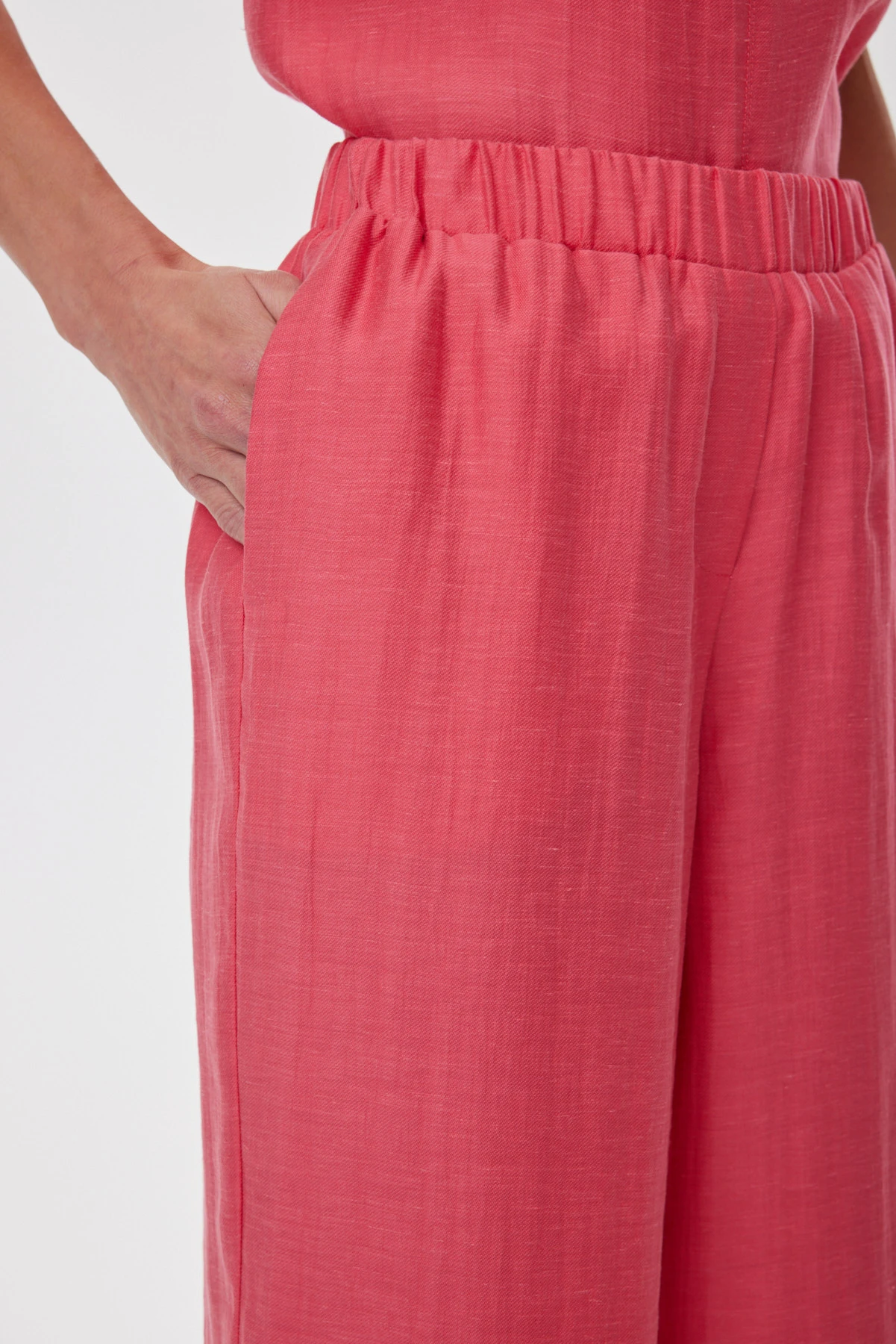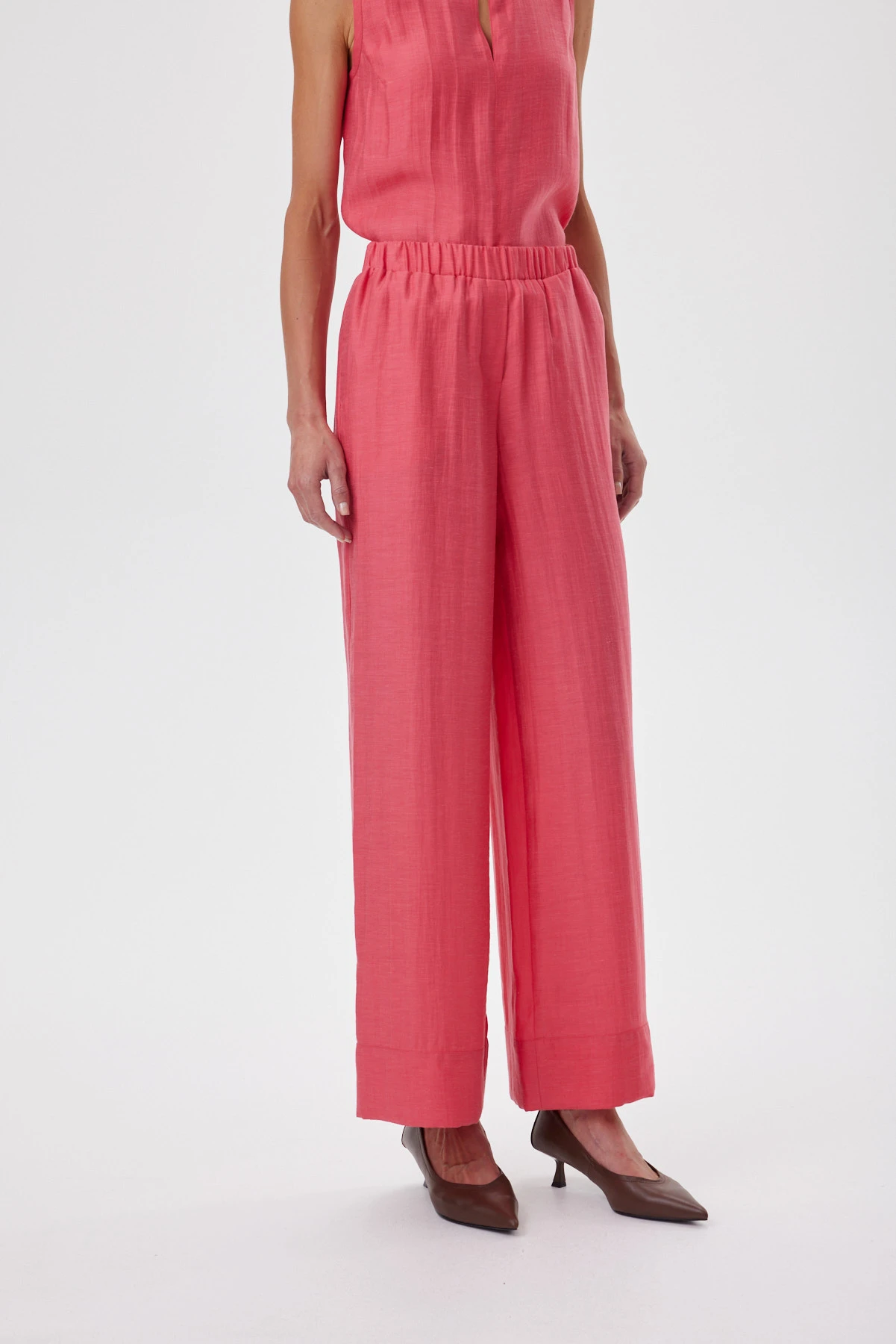 За счёт природной фактуры ткани цвет льняных коралловых брюк-палаццо выглядит глубже и многослойнее, это один из актуальных оттенков сезона. Широкий прямой силуэт струится от талии и делает шаг более лёгким. Мягкий пояс на эластичной ленте даёт комфортную посадку без лишних складок. Смесовая ткань с льном и лиоцеллом воздухопроницаемая и остаётся прохладной в жару: лён даёт живую фактуру, лиоцелл — мягкость и шелковистый блеск, полиэстер помогает меньше мяться и сохранять аккуратный вид. Топ создаёт идеальные образы с белым топом, с рубашкой навыпуск или в комплекте с коралловым верхом для сильного монохрома.