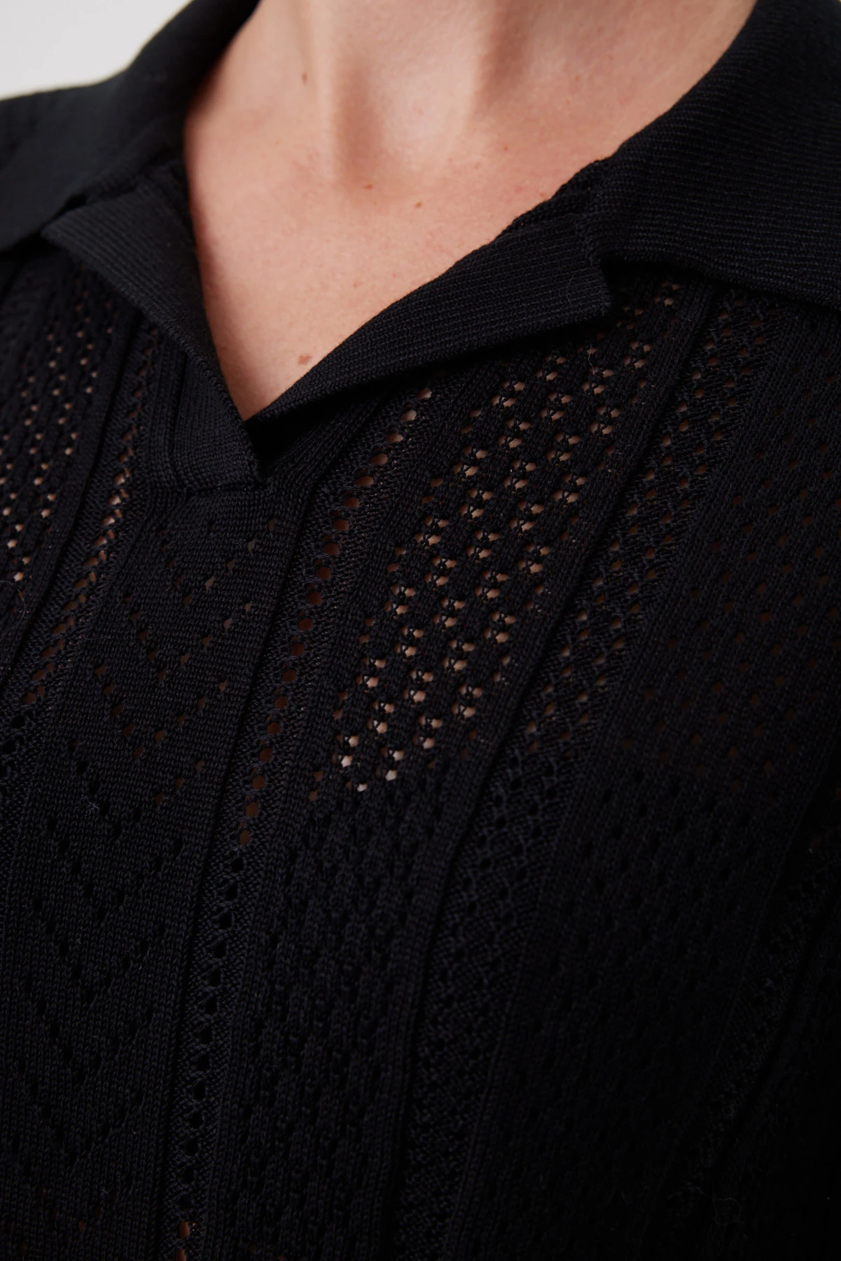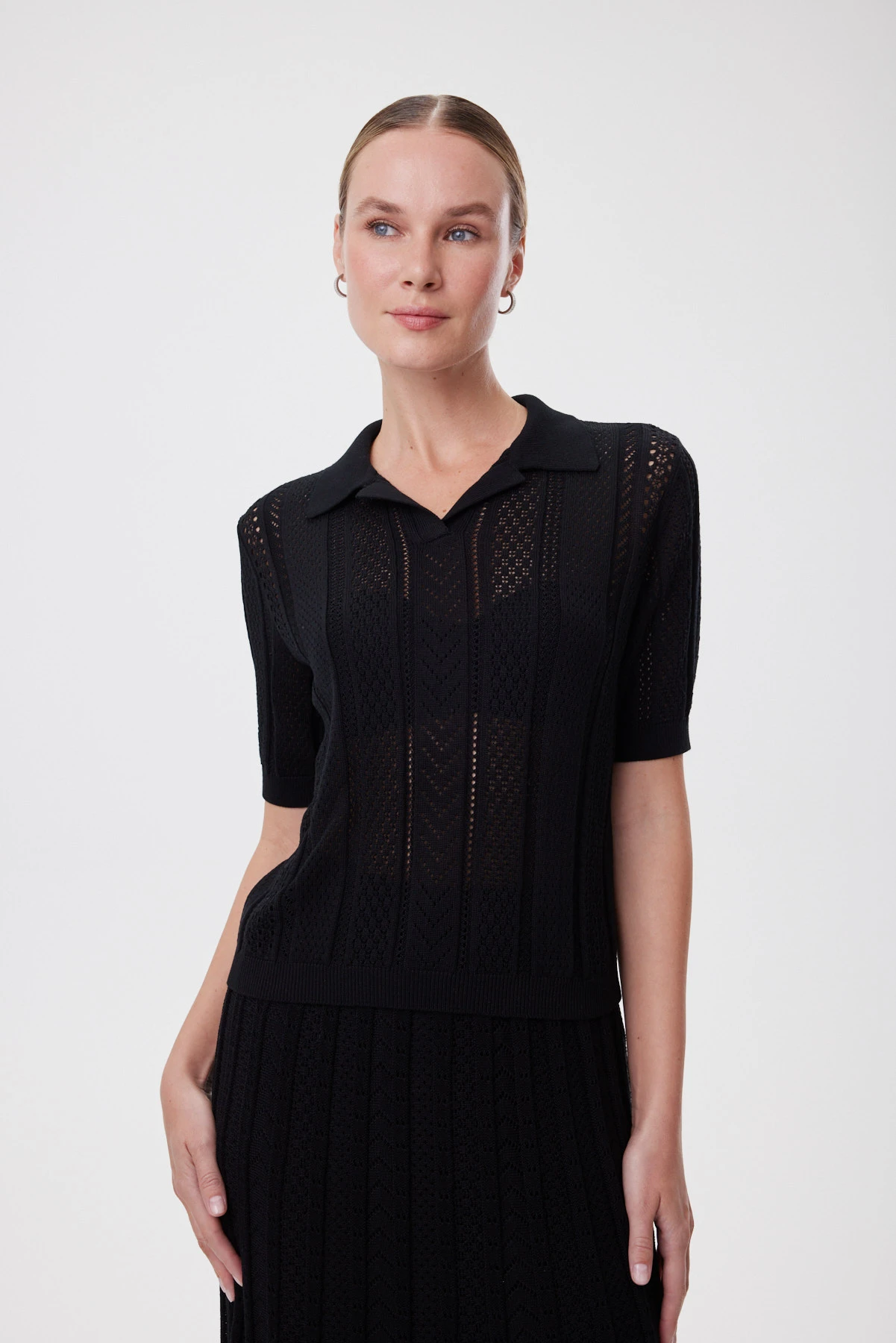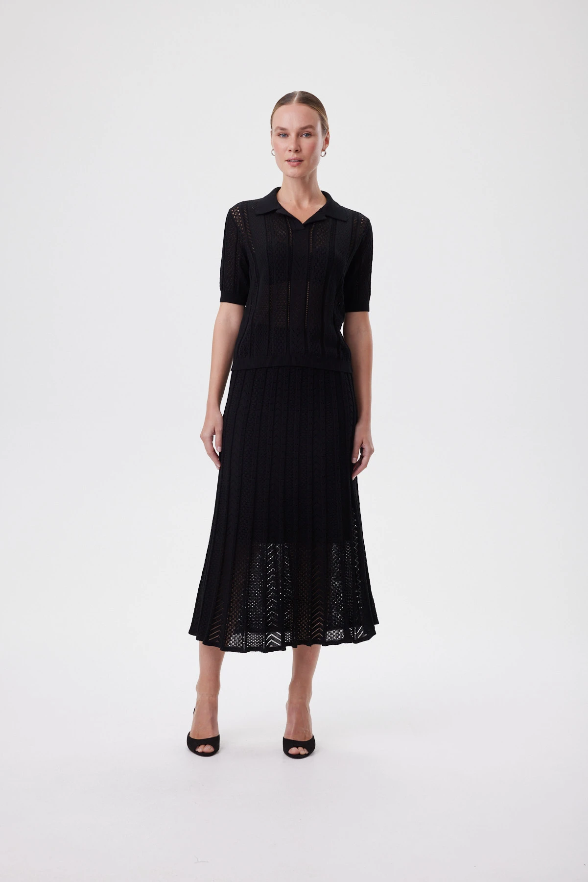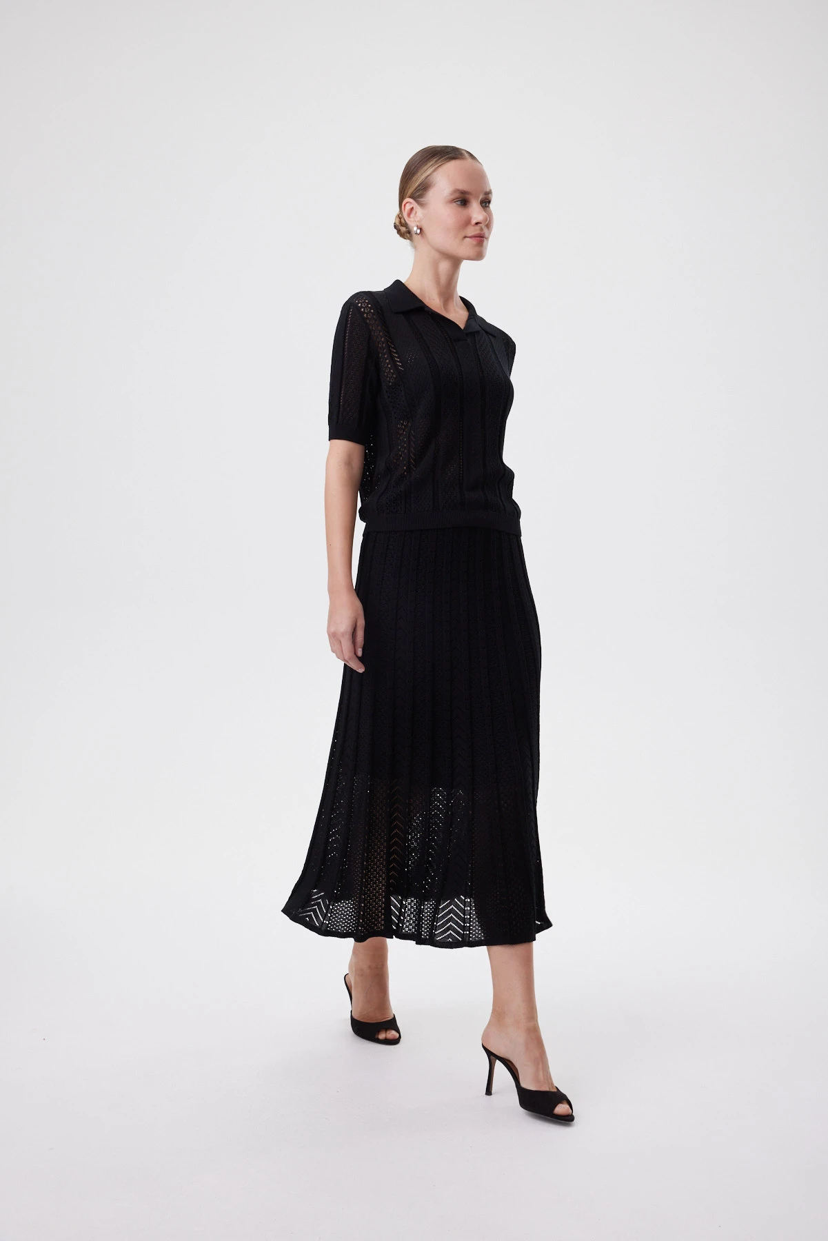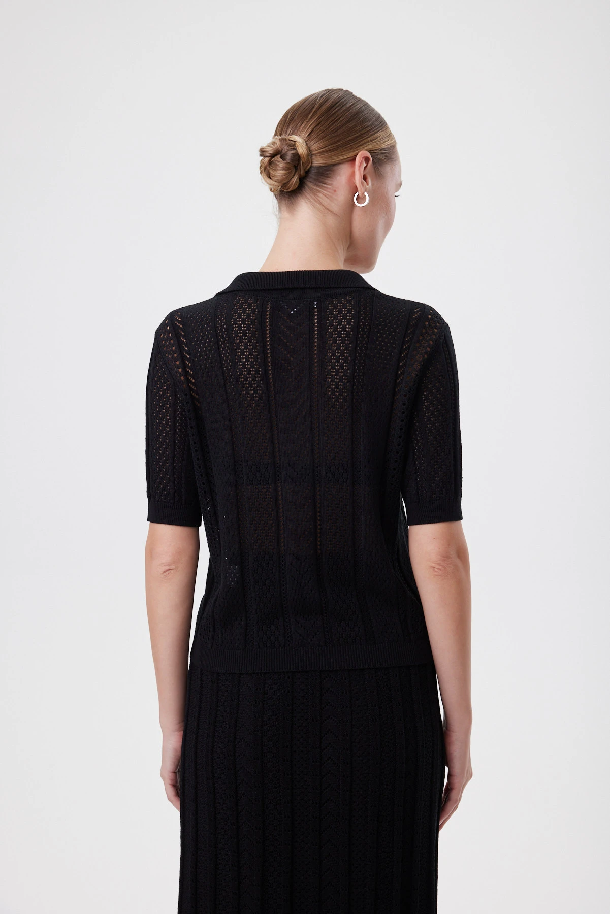 Чёрный поло в глубокой, графичной гамме, делает изделие более лаконичным и выразительным. Комбинация разных узоров и плотностей выстроена в правильных вертикалях: они стройнят и визуально вытягивают силуэт, сохраняя лёгкость. Аккуратно вывязанный воротник с острым уголком держит форму без жёсткости, а рукав до локтя делает модель универсальной для разных пропорций. Тенсел с эластаном мягко струится, остаётся прохладным и воздухопроницаемым, а ажур добавляет ещё больше «воздуха» — идеально для тёплого сезона. Носите с чёрными брюками для монохромного лука, с белым денимом для effortless casual или под жакет — чтобы добавить фактуру в офисный комплект.