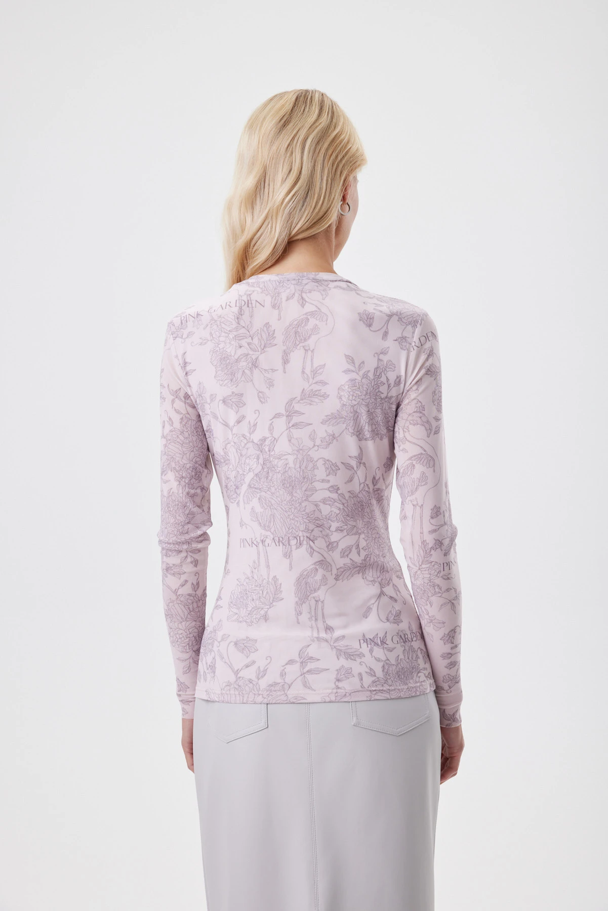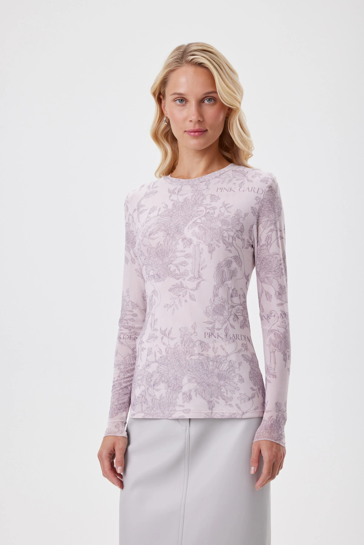Лонгслив из мягкой эластичной сетки — воплощение интеллектуальной женственности: материал двусторонне тянется, мягко повторяет линии тела, не сковывает и не теряет форму со временем. Перед и спинка выполнены в два слоя: внешний — с авторским принтом, внутренний — однотонная подложка, которая полностью исключает просвечивание и позволяет носить модель без дополнительного топа. Авторский принт создан как графическая композиция: каждую линию сначала отрисовали вручную, затем перевели в digital-формат — цветы и фламинго складываются в тонкую историю о спокойствии и уверенности. Лонгслив, как и каждое изделие бренда, сочетается с капсулами как этой коллекции, так и с моделями из прошлых сезонов.