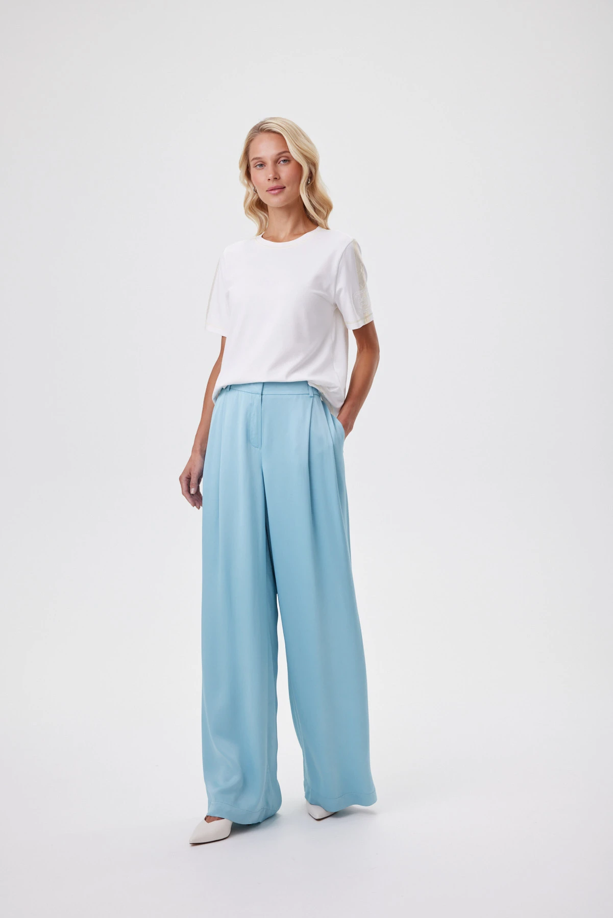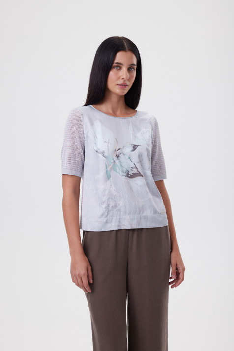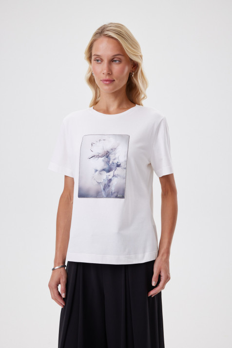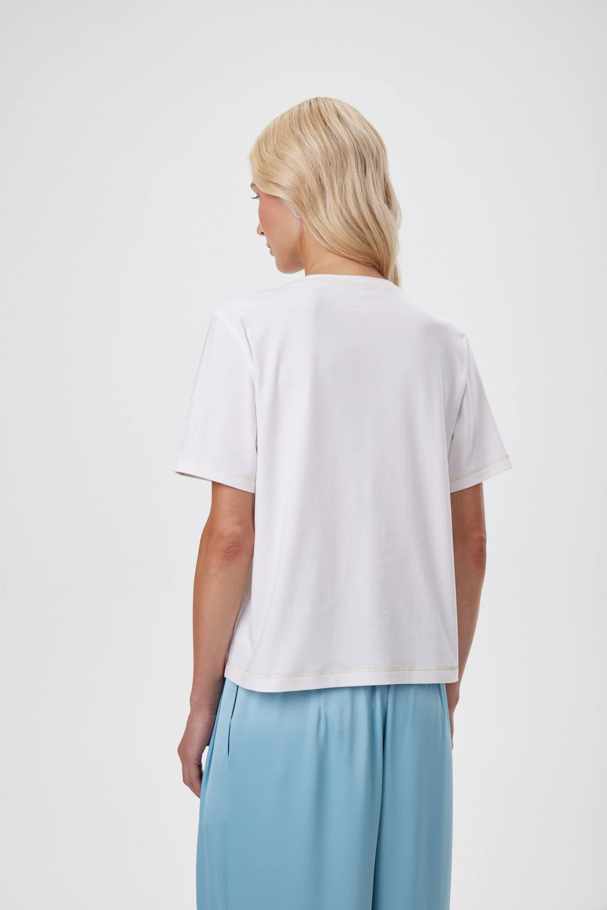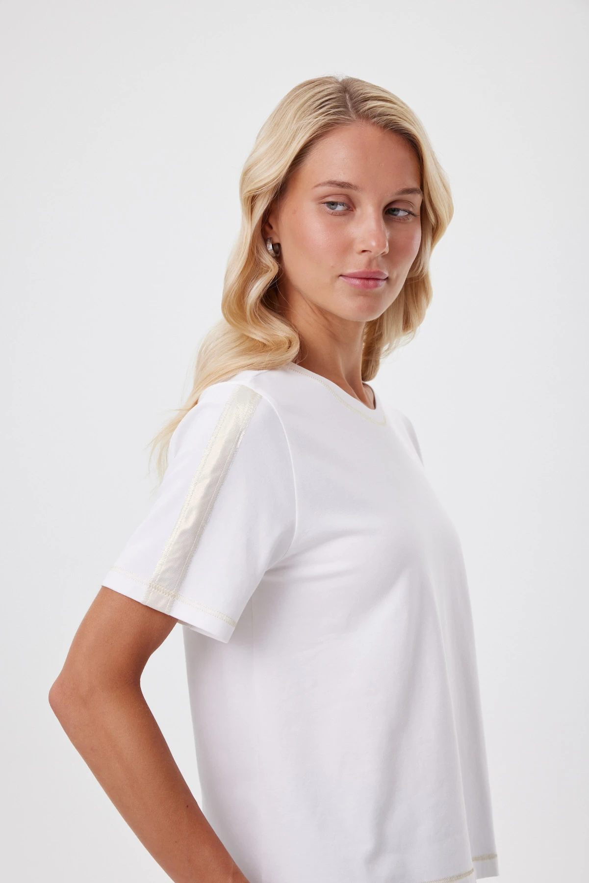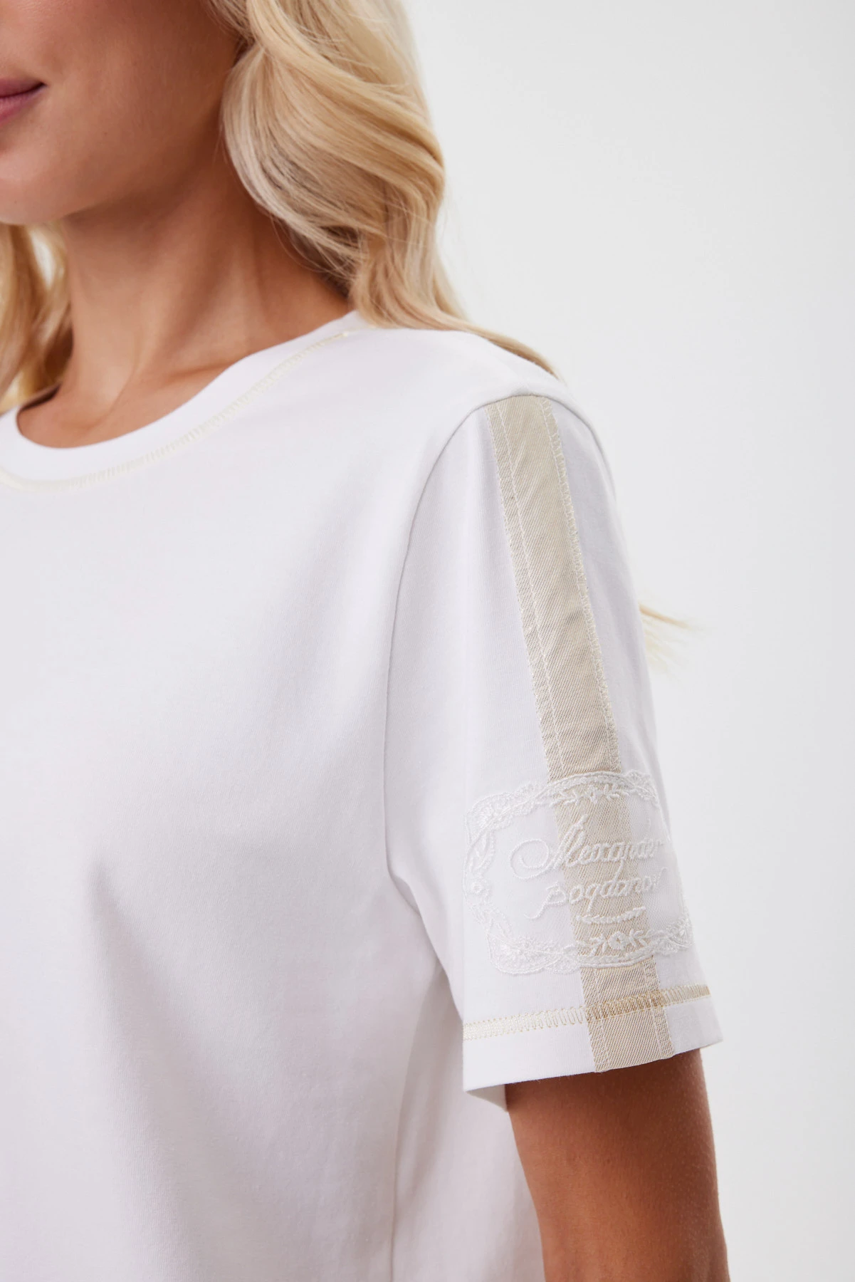 Футболка из плотного хлопка премиального качества не просвечивает и остаётся мягкой даже после стирок — комфортный выбор для чувствительной кожи. Отделочная строчка по горловине, рукавам и низу выполнена с настилом из метанита: нить не просто фиксирует край, а даёт мягкое свечение, похожее на тонкую позолоту. На рукаве — деликатный лампас с лентой и вышивкой. Благодаря тонким деталям это не просто базовая футболка, а изделие с технологичными элементами по люксовым стандартам, как баланс между минимализмом и ювелирной точностью.