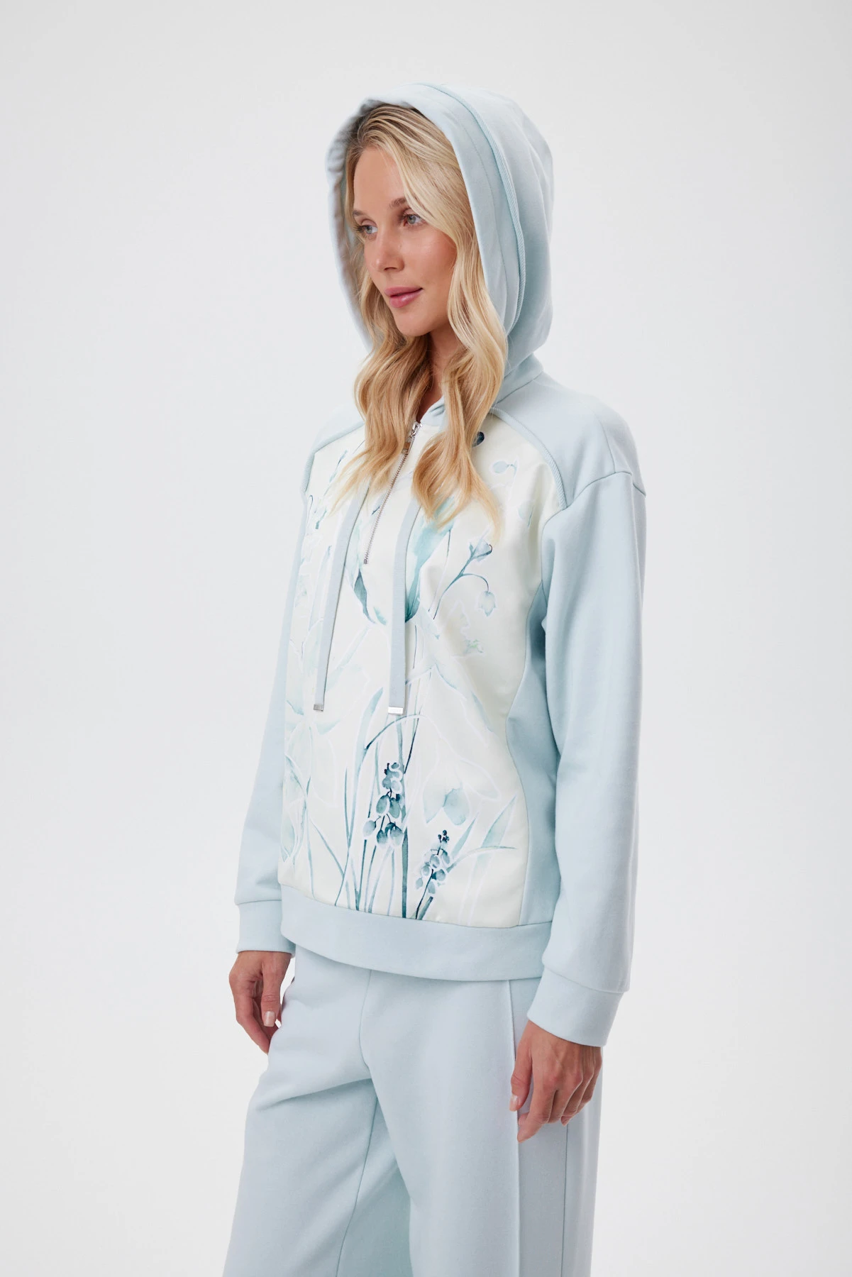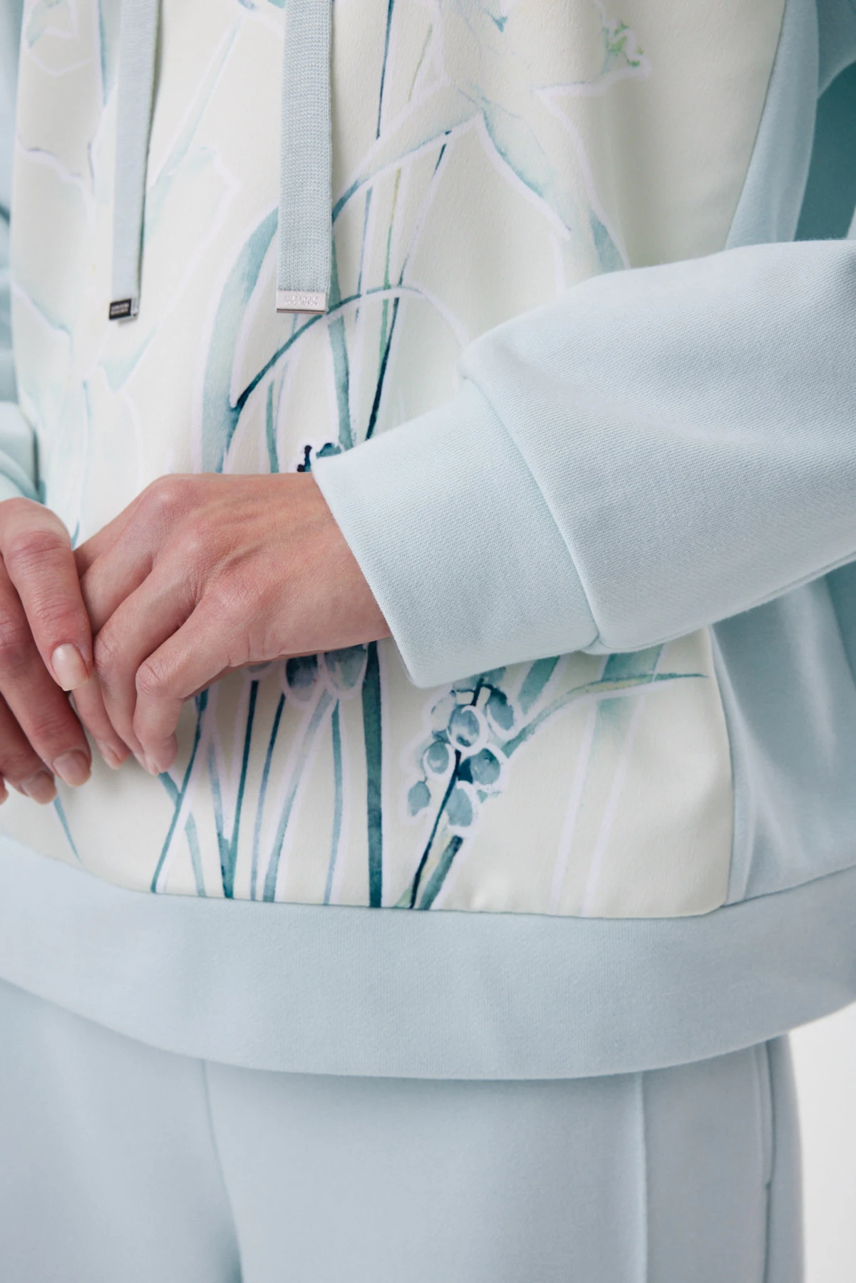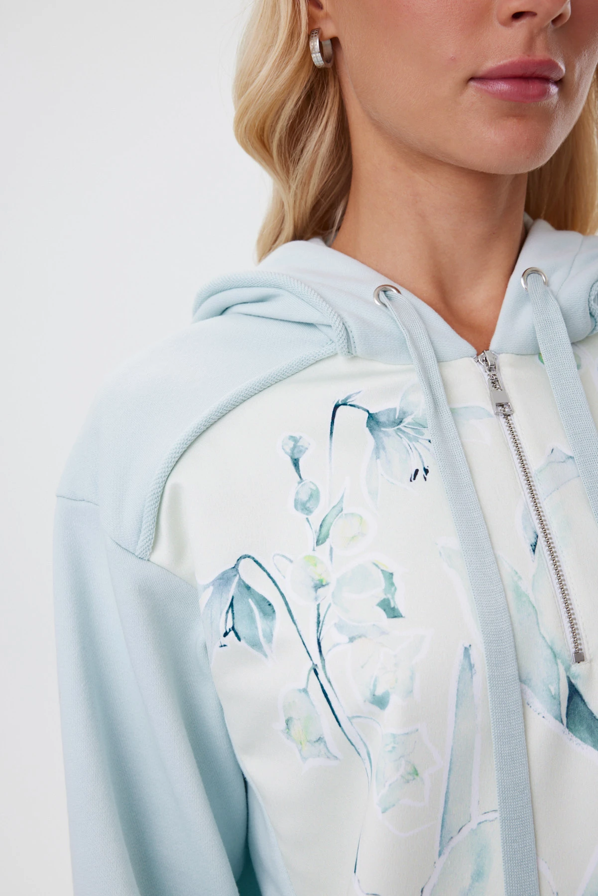 Мятный худи комфортен к телу и сохраняет форму при носке. Материал устойчив к деформации, не вытягивается, сохраняет цвет. Худи построен на контрасте фактур: матовый футер сочетается с сатиновой вставкой. За счёт этого появляется глубина и рельеф поверхности. Авторский принт — акварельный первоцвет: рисунок создан вручную и доработан в digital, а сатиновая база усиливает эффект влажной кисти и внутреннего свечения. Изделие словно играет, добавляя образу кокетства и интеллектуальной женственности. Кокетка и капюшон украшены пластичными декоративными «закрутками» из основного футера — новый выразительный штрих сезона. Завершают образ плотный вязаный шнур с металлическими наконечниками и подкладка капюшона с фирменным рисунком «88».