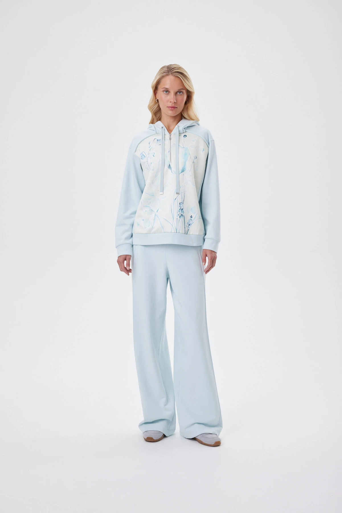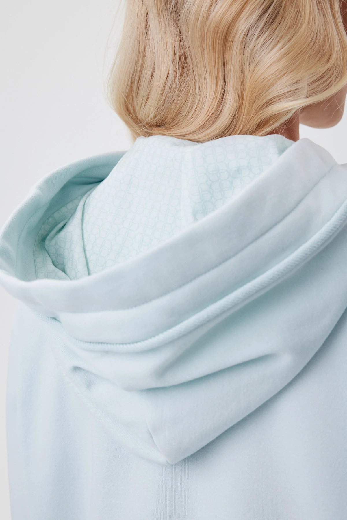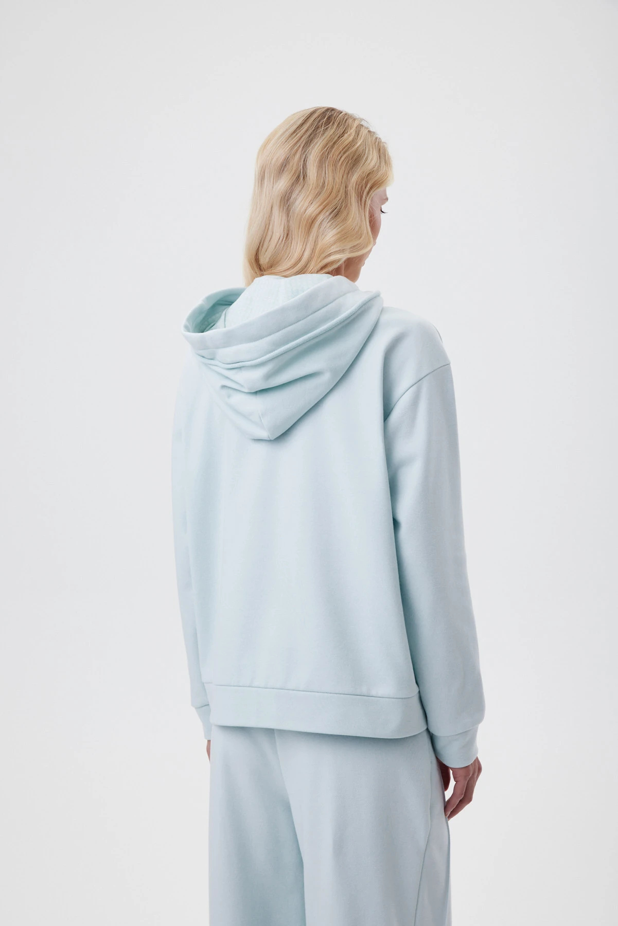 Мятный худи комфортен к телу и сохраняет форму при носке. Материал устойчив к деформации, не вытягивается, сохраняет цвет. Худи построен на контрасте фактур: матовый футер сочетается с сатиновой вставкой. За счёт этого появляется глубина и рельеф поверхности. Авторский принт — акварельный первоцвет: рисунок создан вручную и доработан в digital, а сатиновая база усиливает эффект влажной кисти и внутреннего свечения. Изделие словно играет, добавляя образу кокетства и интеллектуальной женственности. Кокетка и капюшон украшены пластичными декоративными «закрутками» из основного футера — новый выразительный штрих сезона. Завершают образ плотный вязаный шнур с металлическими наконечниками и подкладка капюшона с фирменным рисунком «88».