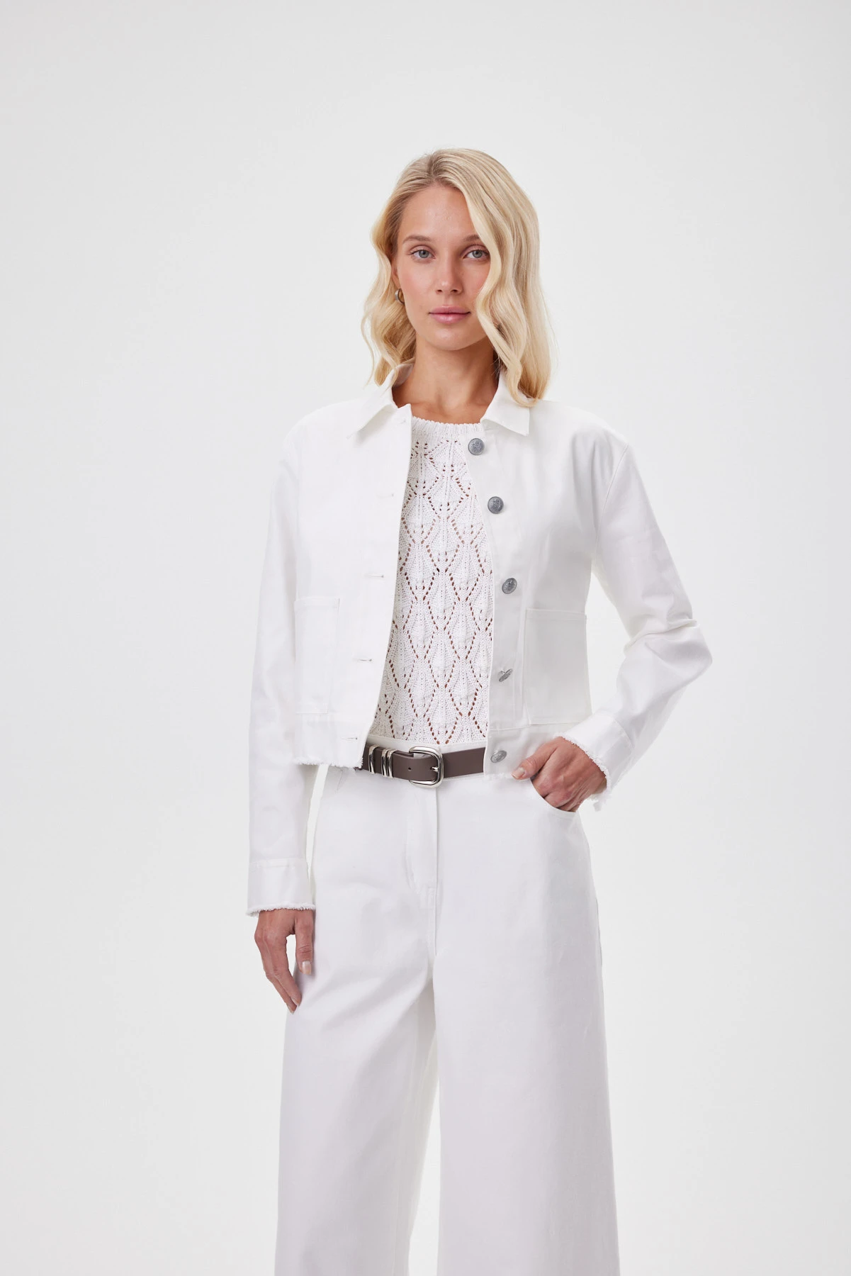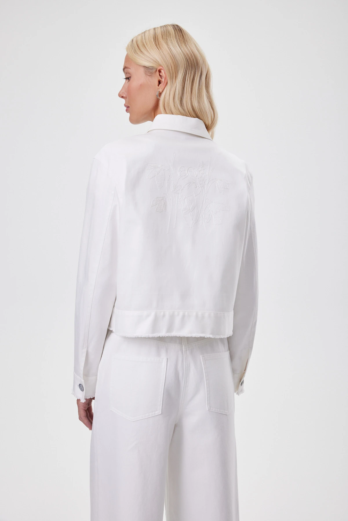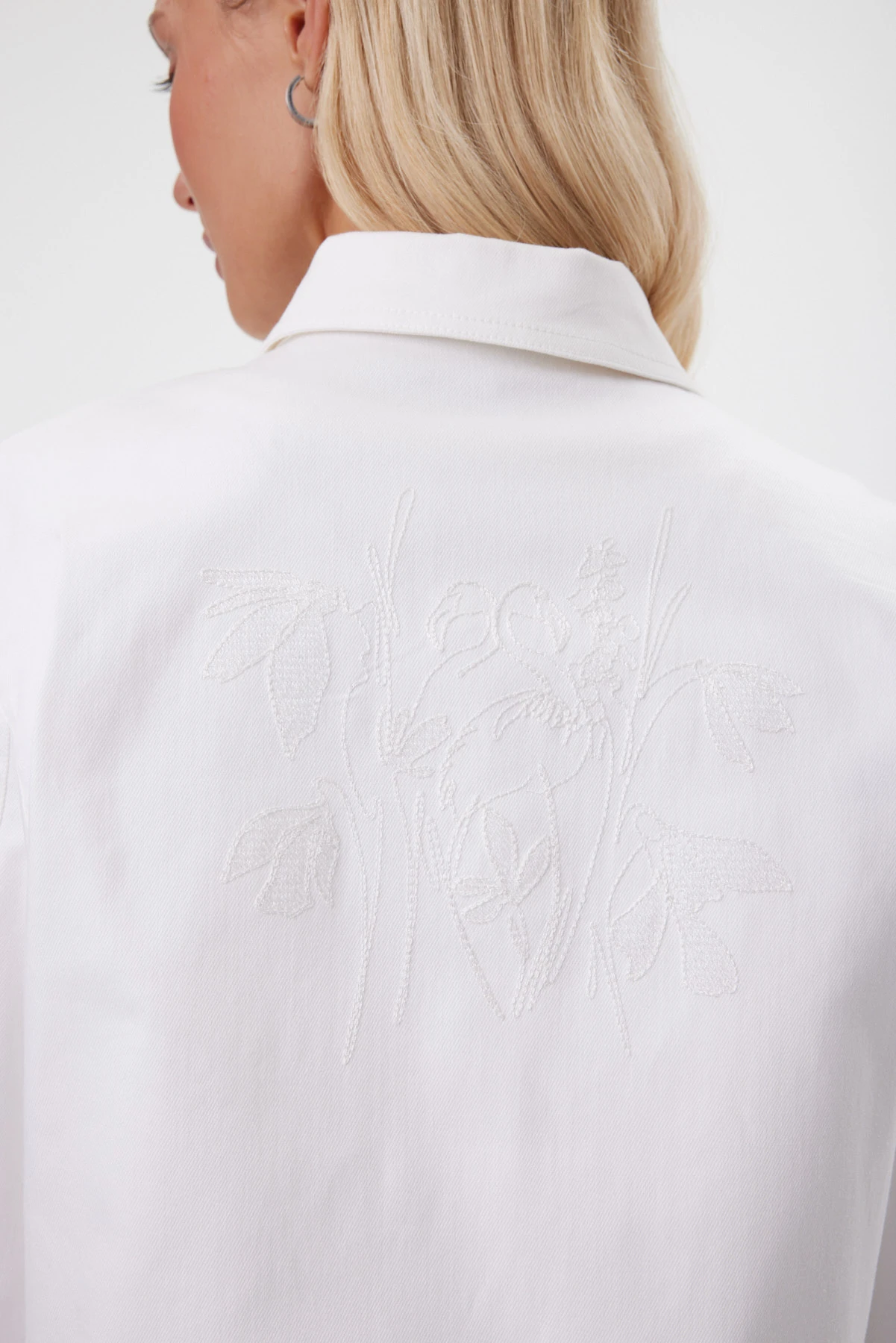 Джинсовка из белого денима раскрывает крой особенно деликатно: силуэт выглядит свежо, аккуратно и «архитектурно». Укороченная длина, ровный низ, рубашечный воротник и крупные накладные карманы создают современную композицию без перегруженности и хорошо адаптируются под разные типы фигур.Мягко вываренный 100% хлопок остаётся плотным, гибким и комфортным, сохраняя ощущение премиального натурального материала. Металлические пуговицы с благородным блеском и аккуратная бахрома по низу и манжетам добавляют тонкие акценты, а авторская вышивка первоцвета по спинке завершает образ спокойным, осмысленным декоративным штрихом. Сочетается как с брюками, юбками, так и с платьями практически любого силуэта.