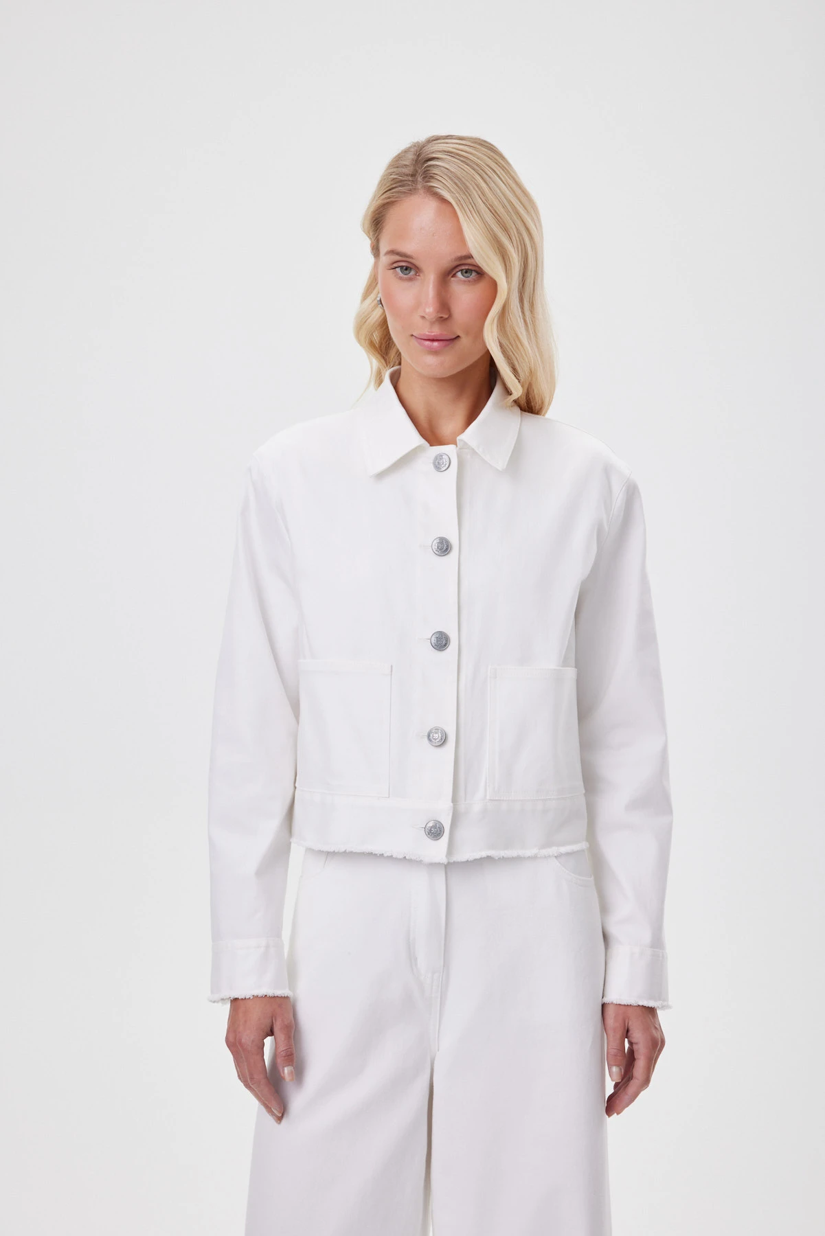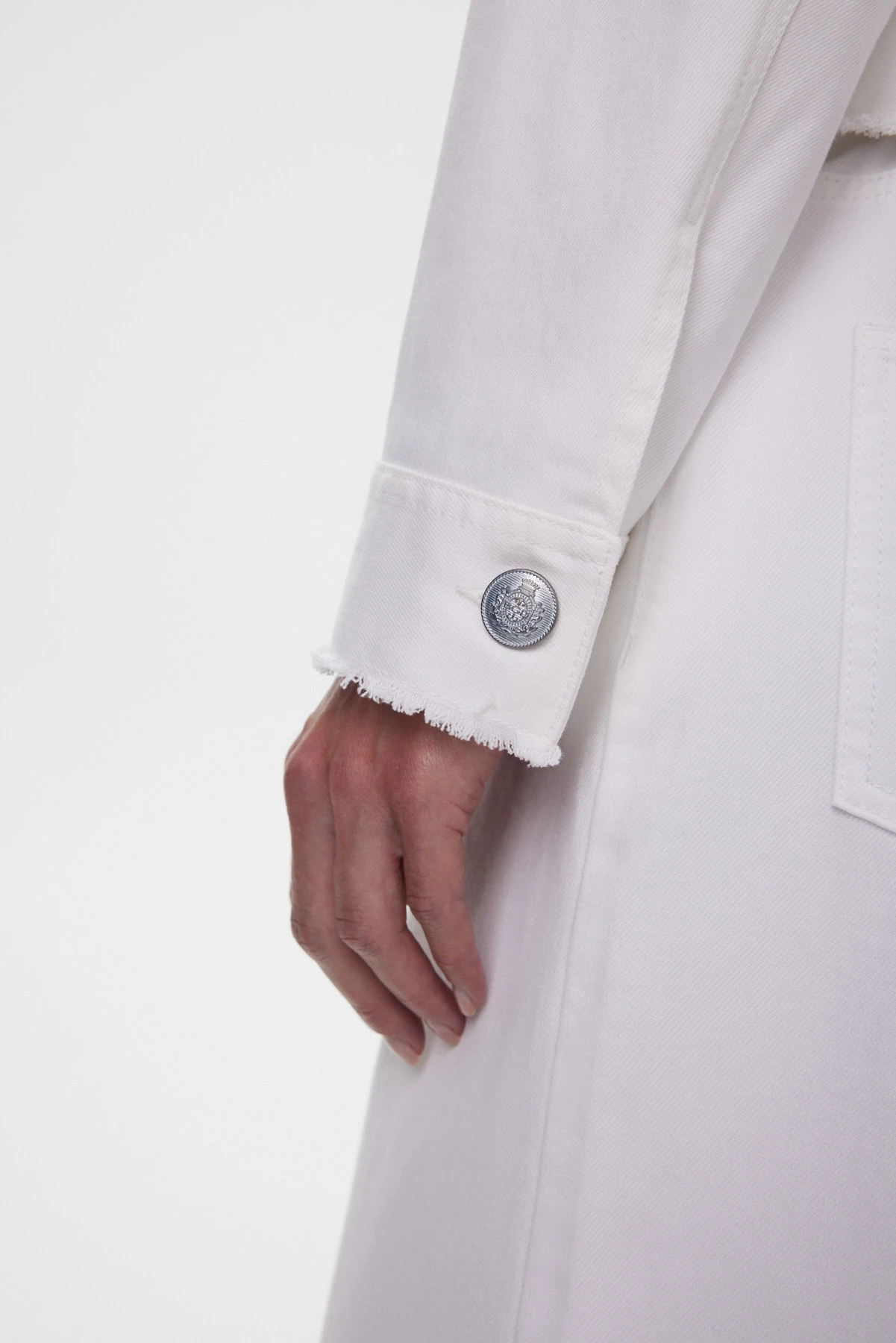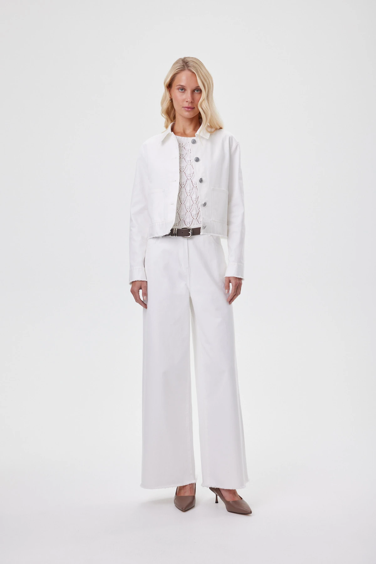 Джинсовка из белого денима раскрывает крой особенно деликатно: силуэт выглядит свежо, аккуратно и «архитектурно». Укороченная длина, ровный низ, рубашечный воротник и крупные накладные карманы создают современную композицию без перегруженности и хорошо адаптируются под разные типы фигур.Мягко вываренный 100% хлопок остаётся плотным, гибким и комфортным, сохраняя ощущение премиального натурального материала. Металлические пуговицы с благородным блеском и аккуратная бахрома по низу и манжетам добавляют тонкие акценты, а авторская вышивка первоцвета по спинке завершает образ спокойным, осмысленным декоративным штрихом. Сочетается как с брюками, юбками, так и с платьями практически любого силуэта.
