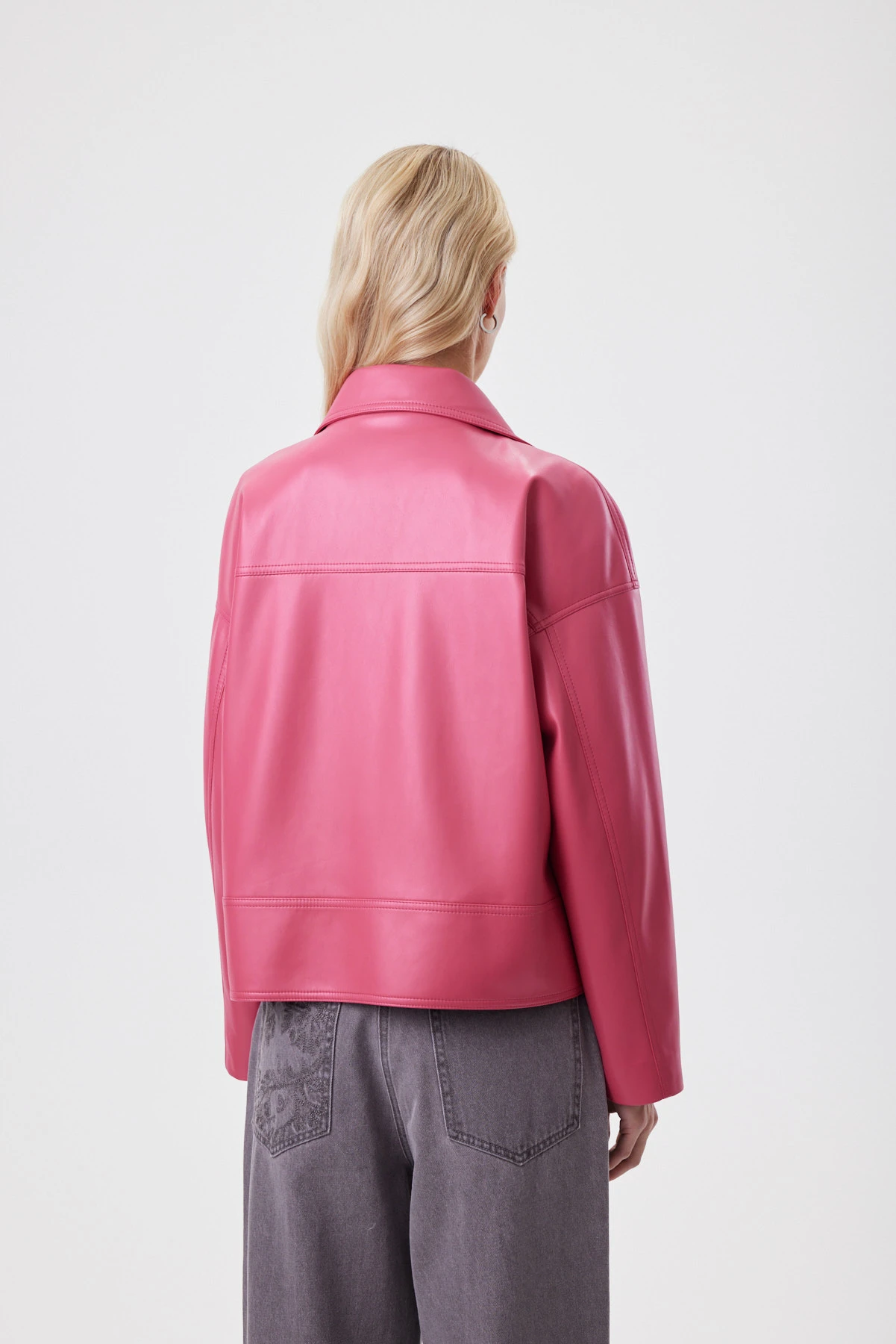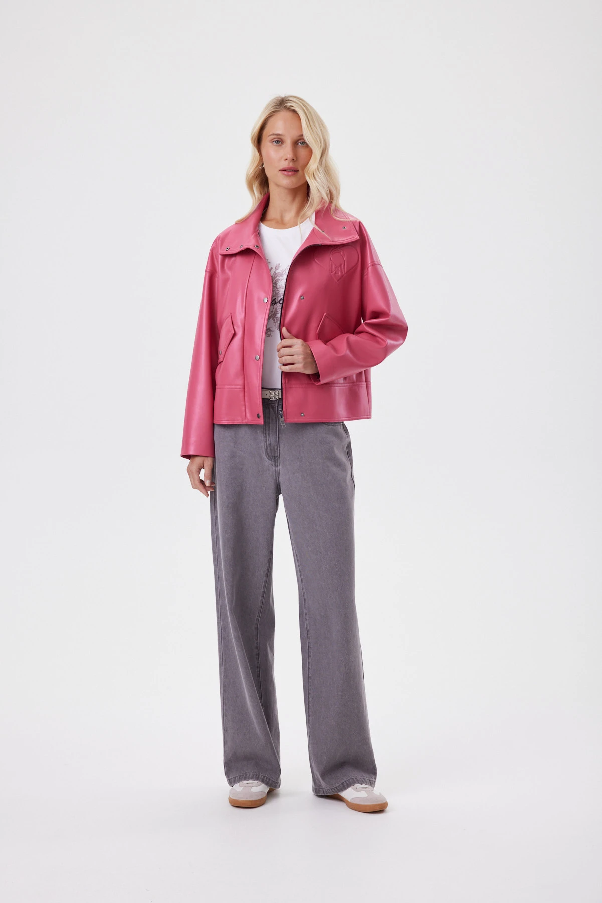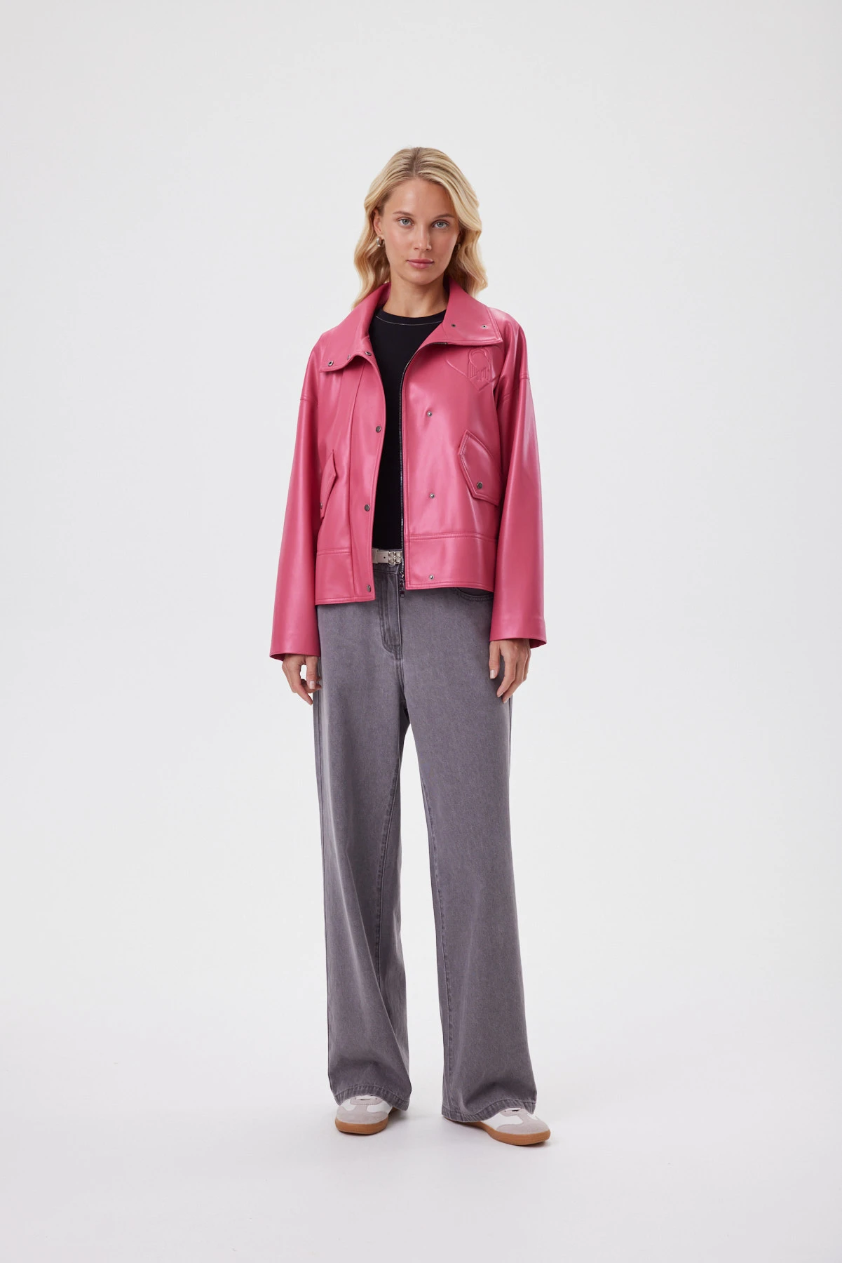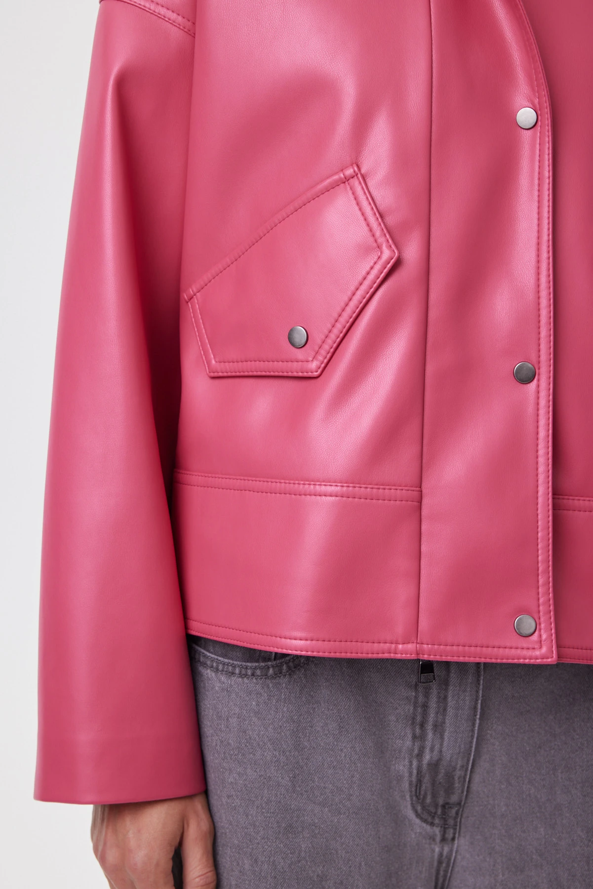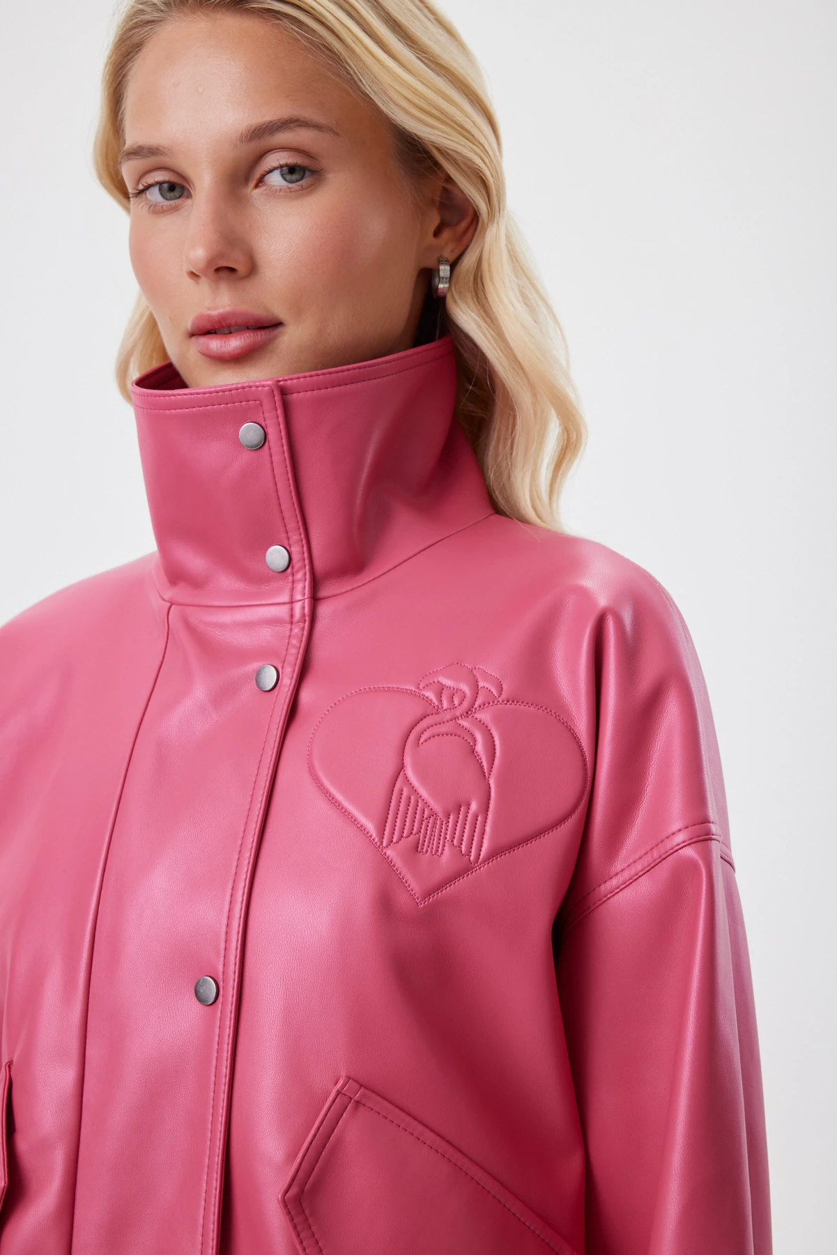 Лаконичный силуэт ярко-розовой куркти раскрывается через детали, главный акцент — крупный шеврон спереди справа: объёмное сердце с вышитым фламинго. Воротник-стойка и функциональные клапаны держат форму и добавляют собранности, а спущенная линия плеча и свободный рукав дают расслабленную посадку — получается эффект «мягкой брони» с женственной интонацией. Материал куртки — экокожа нового поколения — выполнена по европейской технологии двухслойного напыления: шелковистая поверхность с лёгким сатиновым блеском остаётся мягкой, не деформируется и не перегревается. Подкладка с сердечным принтом, как выражение любви к покупательницам, делает вещь особенно тёплой по настроению.
