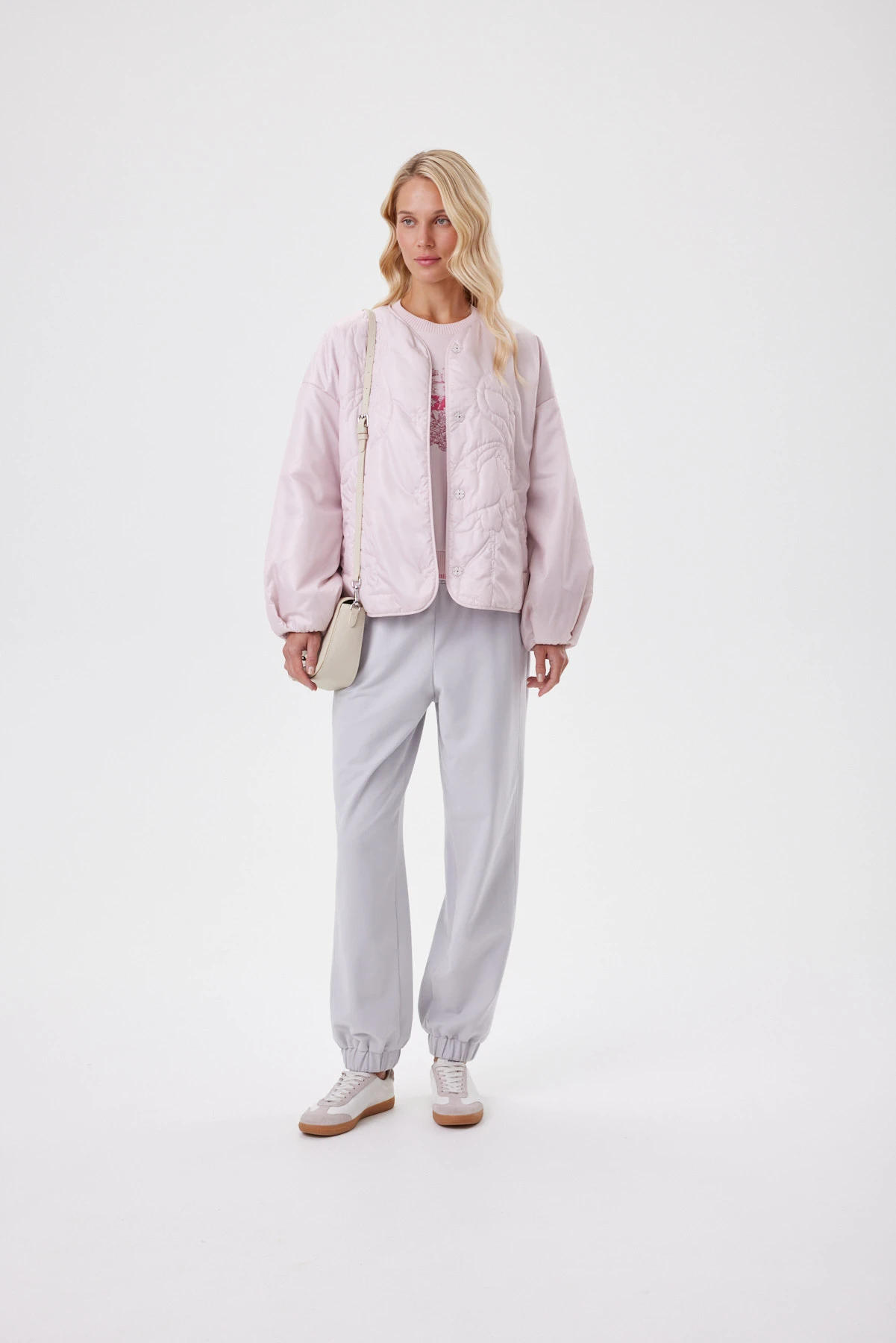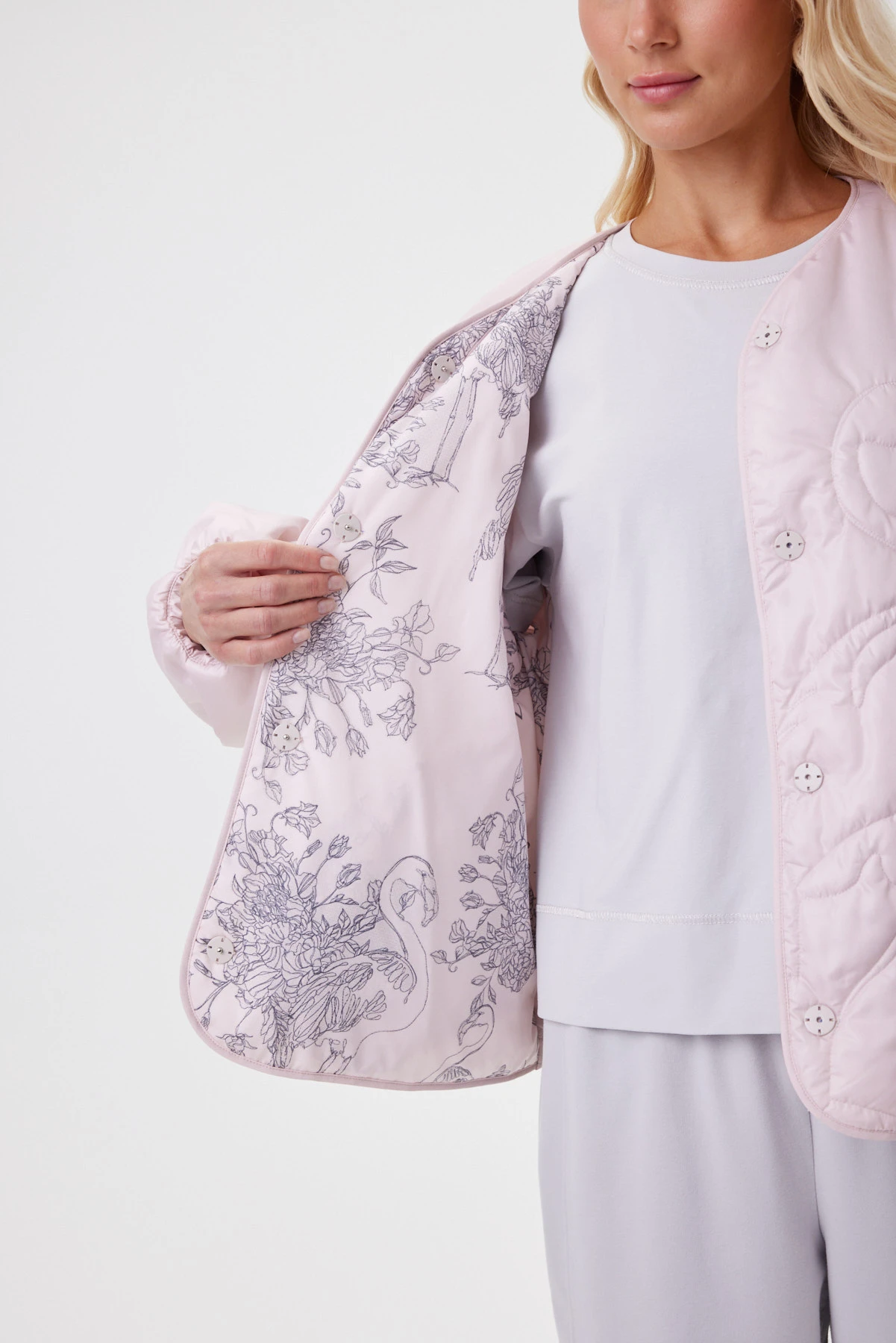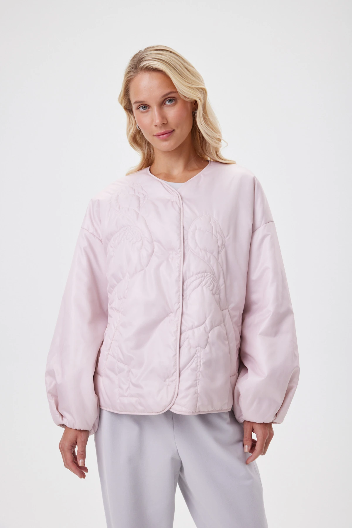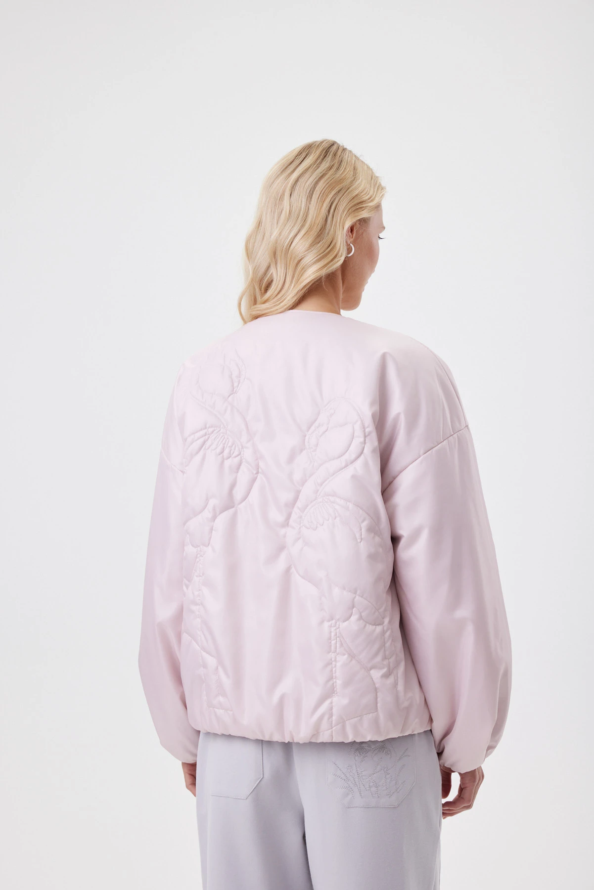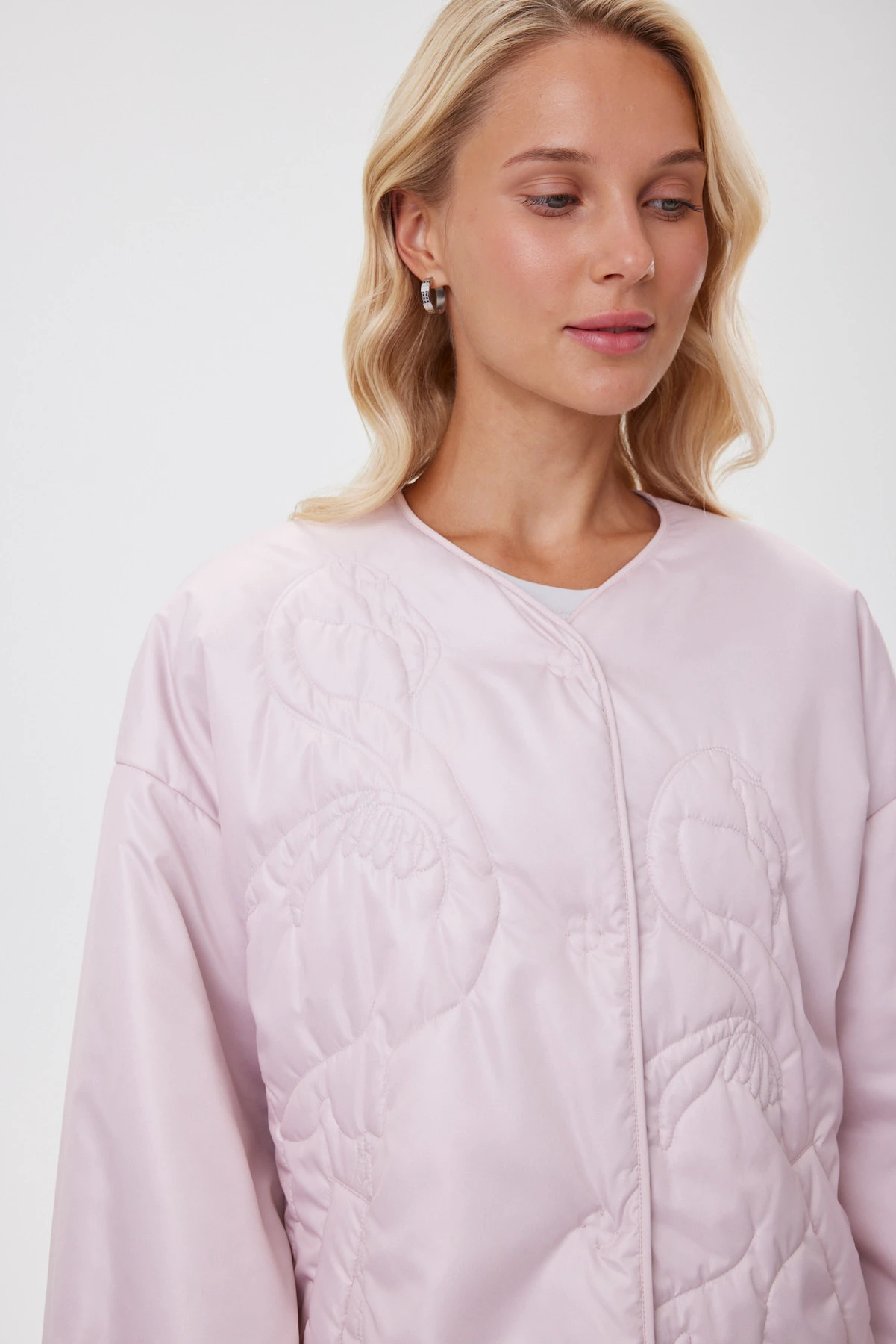 Нежно-розовый бомбер с фигурной стёжкой, нити которой подобраны в цвет ткани. Лаке с сатиновым отливом даёт «пухлую» фактуру и приятную тактильность: ткань плотная, но податливая, без шелеста и эффекта «целлофана». Внутри — современный утеплитель Isosoft: лёгкий, воздухопроницаемый, не сбивается при стирке и надолго сохраняет объём, обеспечивая комфорт в межсезонье и прохладное лето. Спущенная линия плеча, аккуратная окантовка и сборка по низу рукава добавляют мягкую графику, а подкладка с тонким принтом завершает образ.