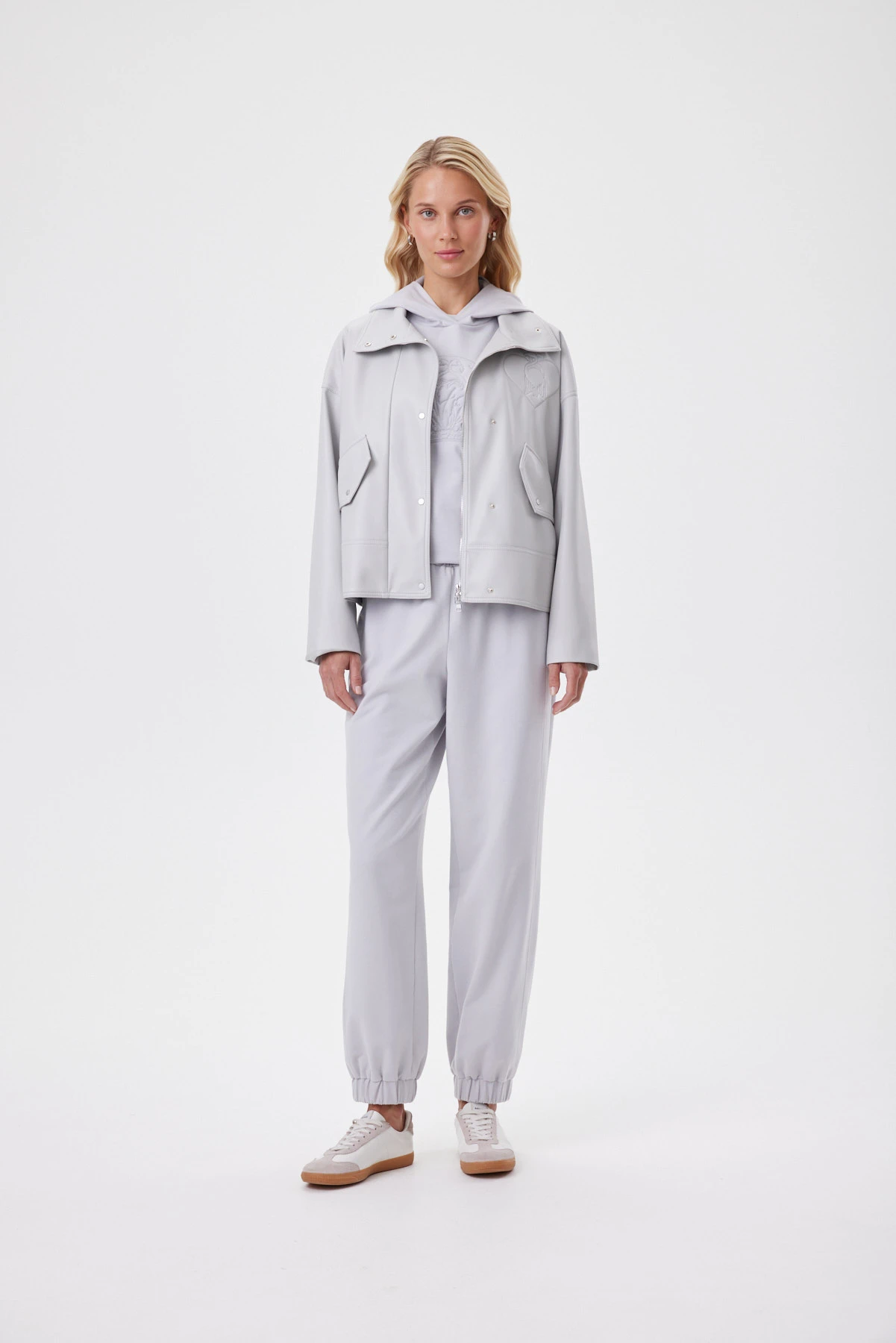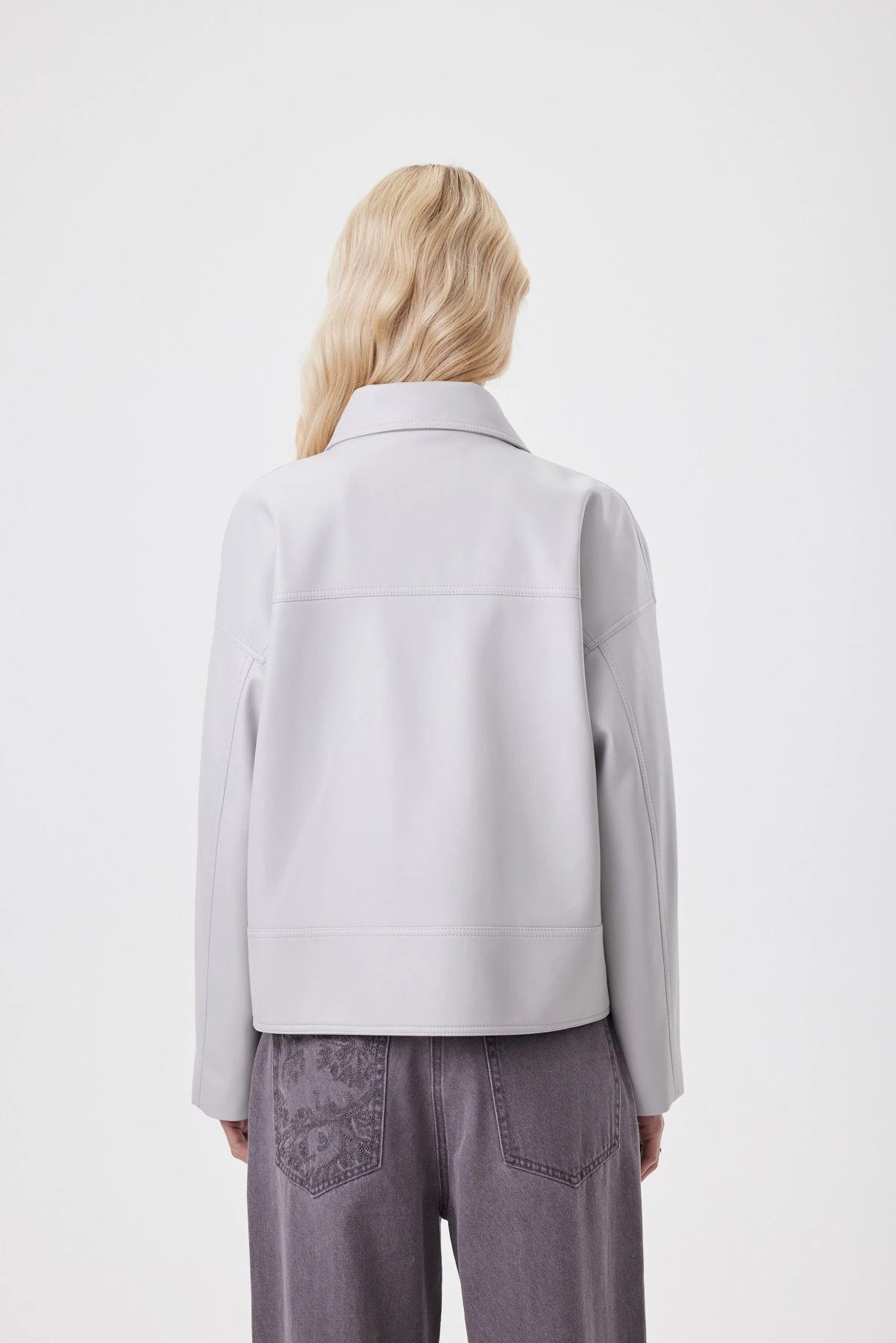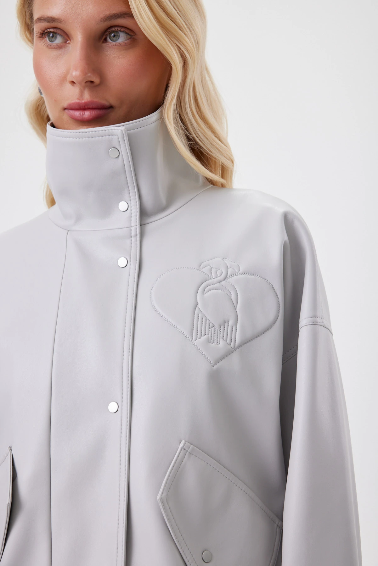 Графитовая куртка — современная классика с характером: сдержанная, но выразительная. На фоне строгого оттенка особенно эффектно звучит акцентный шеврон спереди справа — объёмное сердце с вышитым фламинго, как тонкий знак эмоций внутри минимализма. Воротник-стойка и крупные клапаны формируют собранный силуэт, а спущенное плечо и свободный рукав делают посадку комфортной и непринуждённой. Материал куртки — новая генерация экокожи, далёкая от стереотипов «плёнки» и дерматина. Материал не перегревается, приятен в носке в городе и в поездках, а подкладка с сердечным принтом добавляет образу романтики.