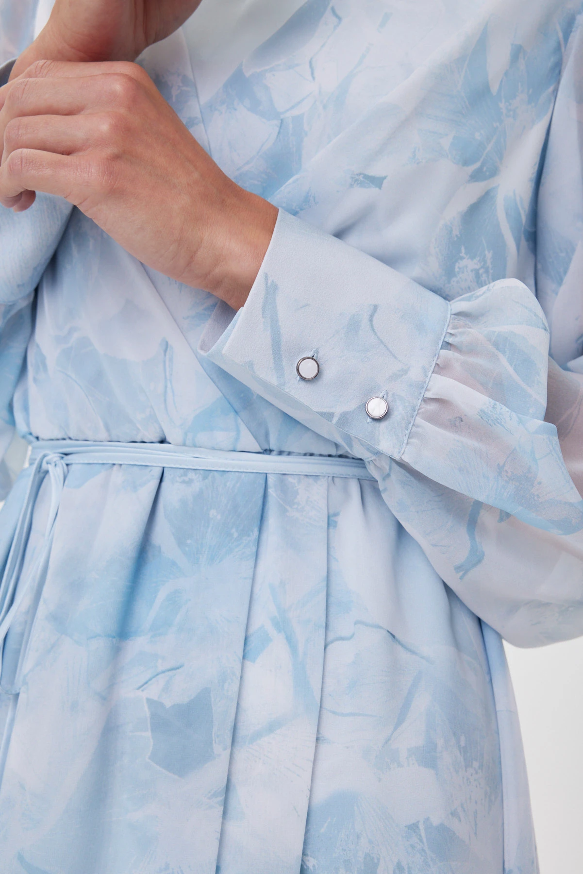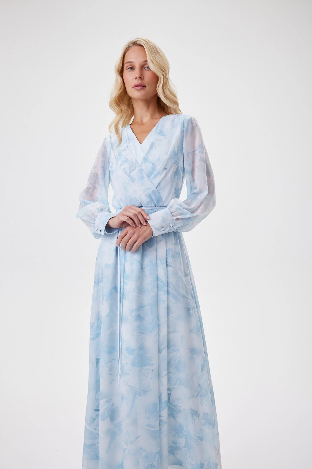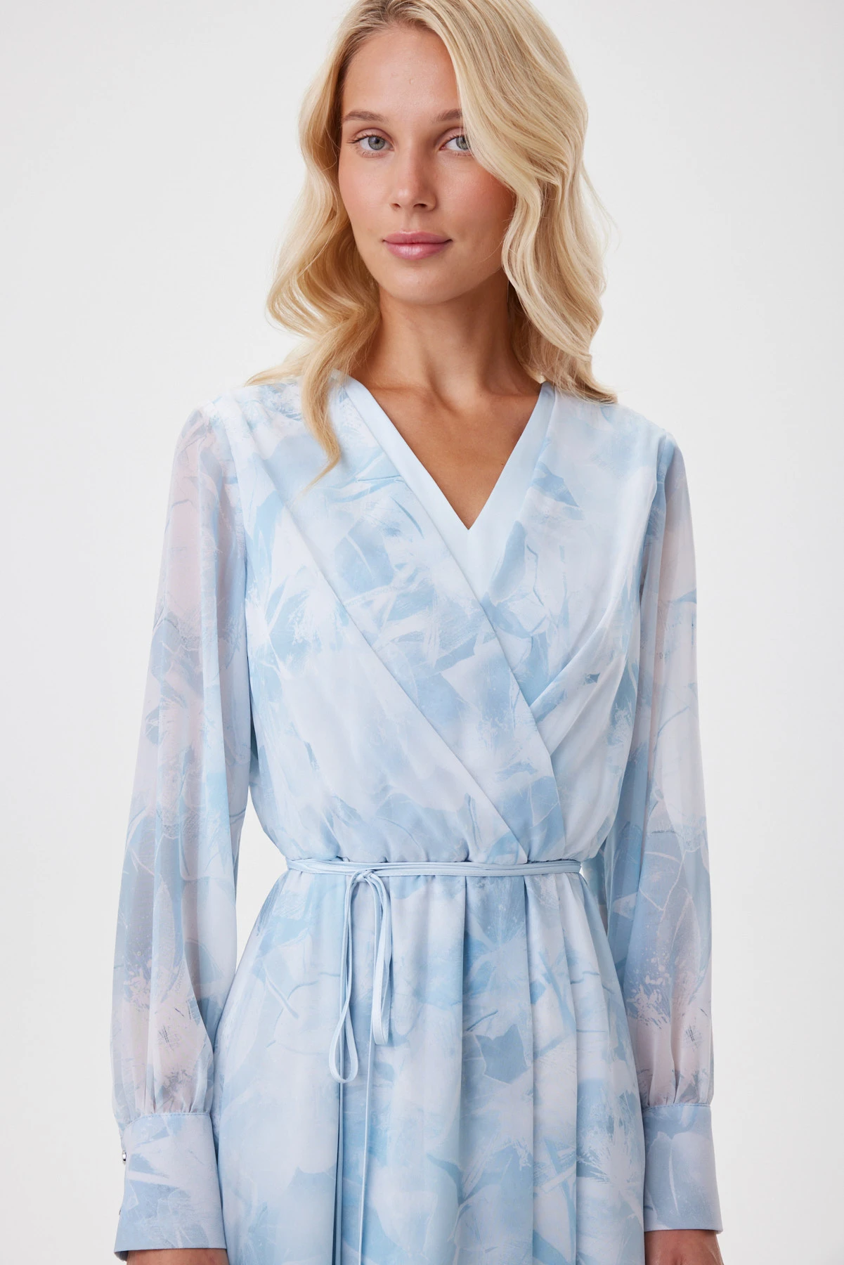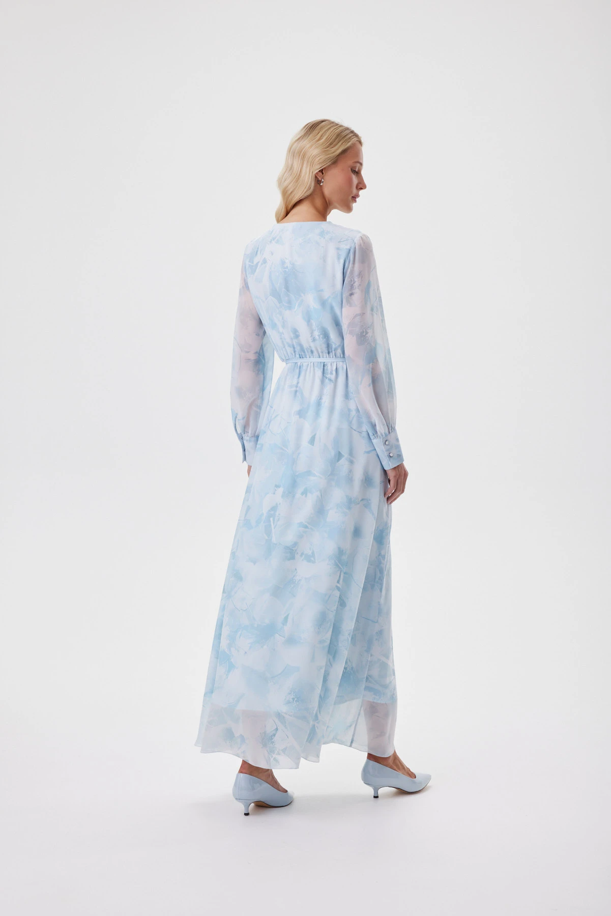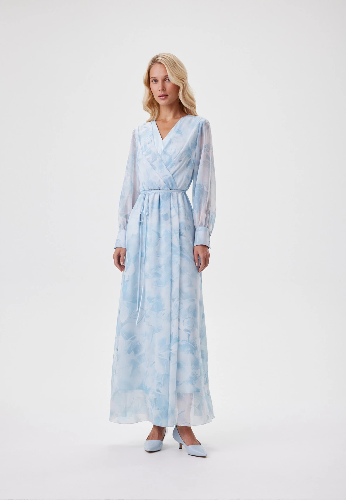 Воздушное платье из полупрозрачного шифона, голубые оттенки которого работают как фильтр: они освежают кожу, делают взгляд мягче и придают лицу «свечение изнутри». Авторский принт в голубых цветах напоминает отпечатки цветов, застывших во льду. Сложный крой с имитацией запаха переходит в аккуратную драпировку по талии: внутренняя складка не даёт юбке расходиться при ходьбе, сохраняя плавность движений. Двойной лиф делает модель лёгкой, но не просвечивающей. Широкие манжеты с имитацией запонок и тонкий пояс добавляют структуры летящему образу. Подходит и для повседневных, и для особых случаев.