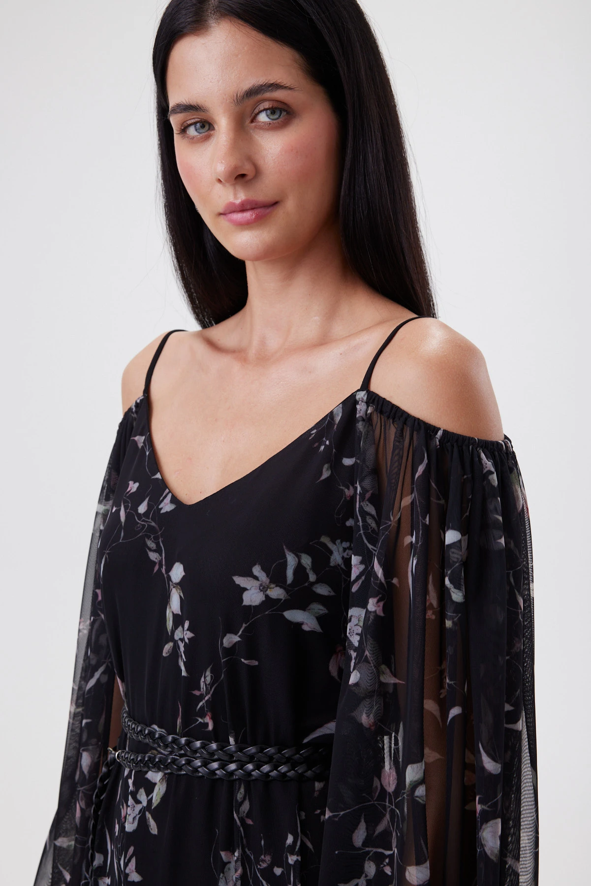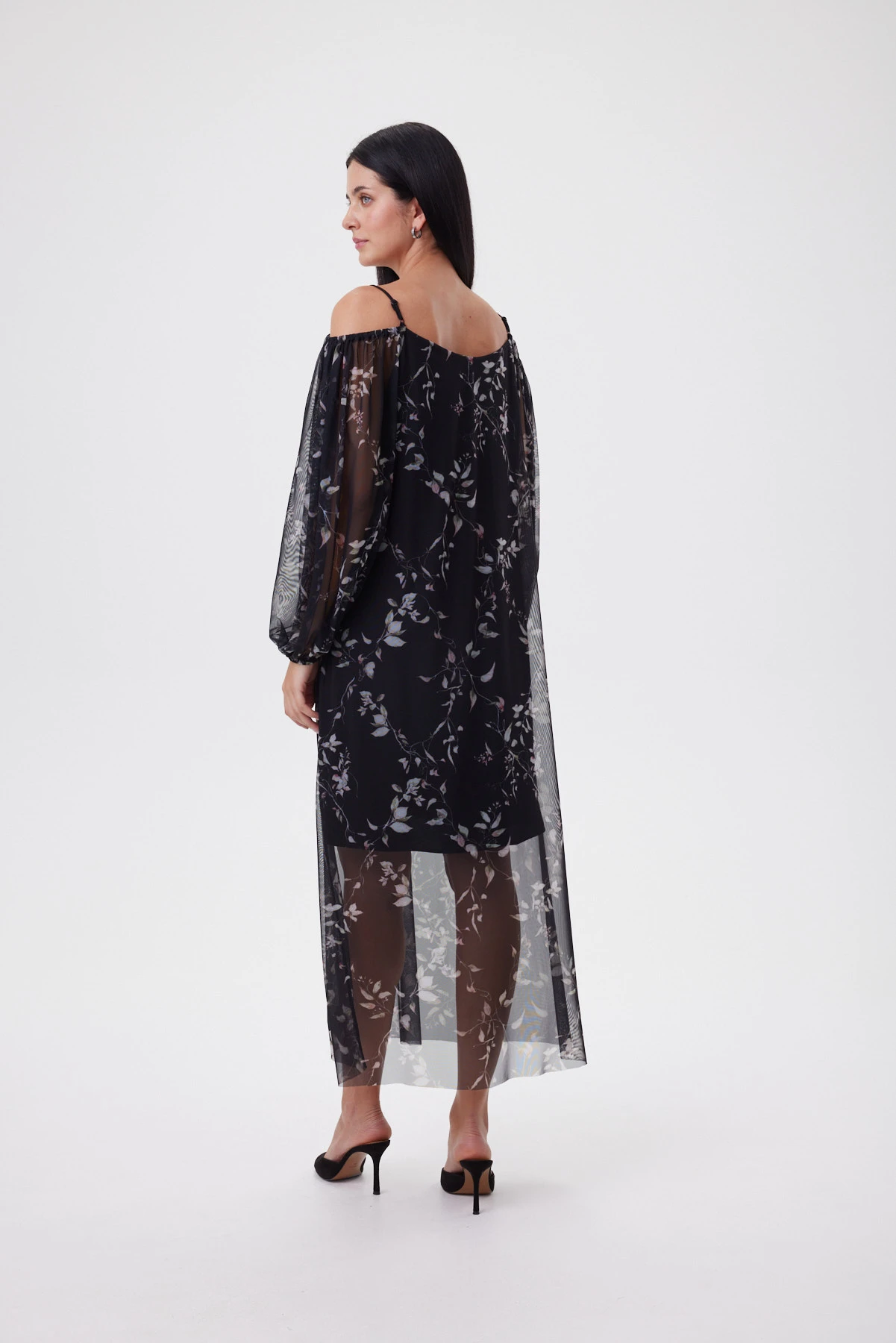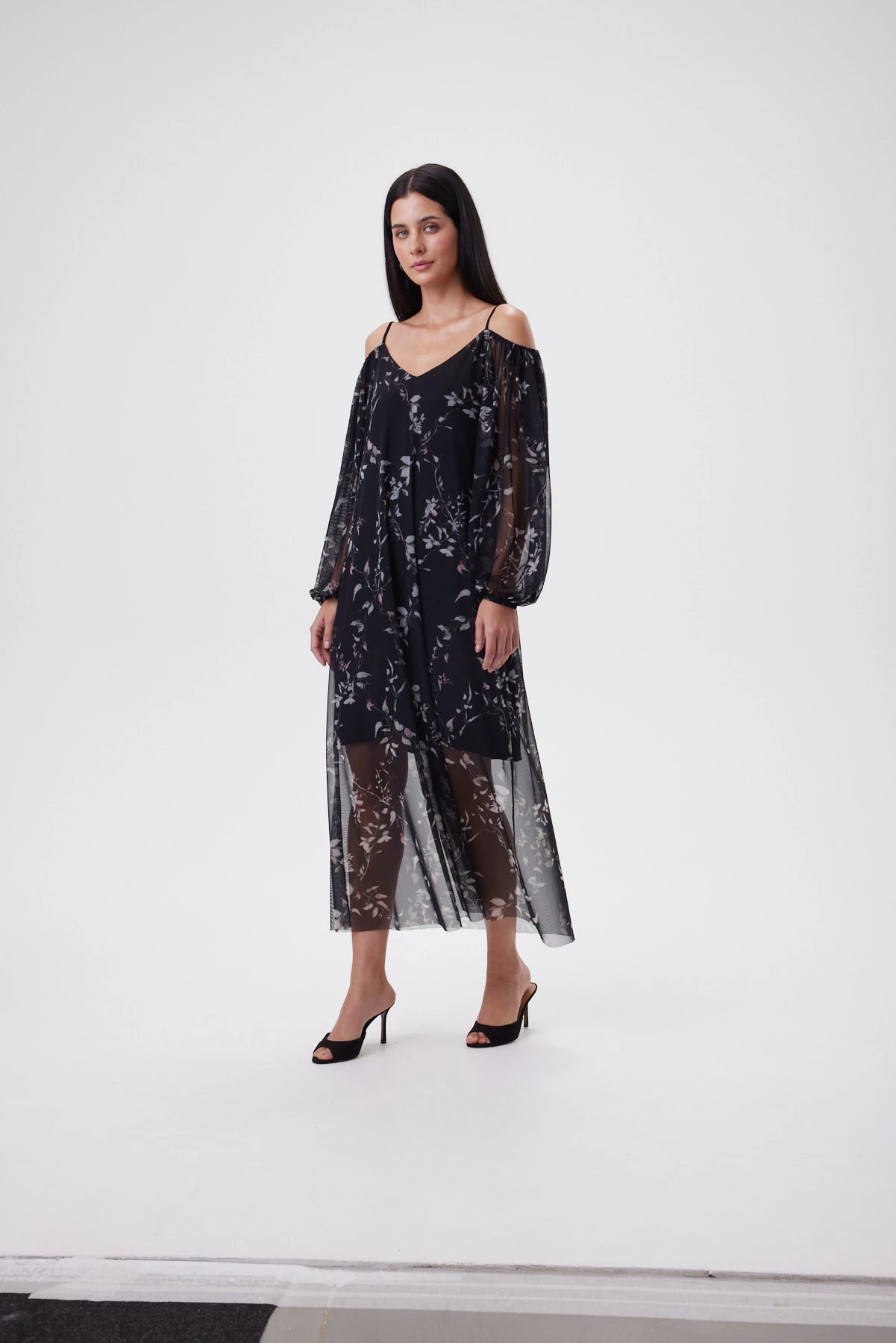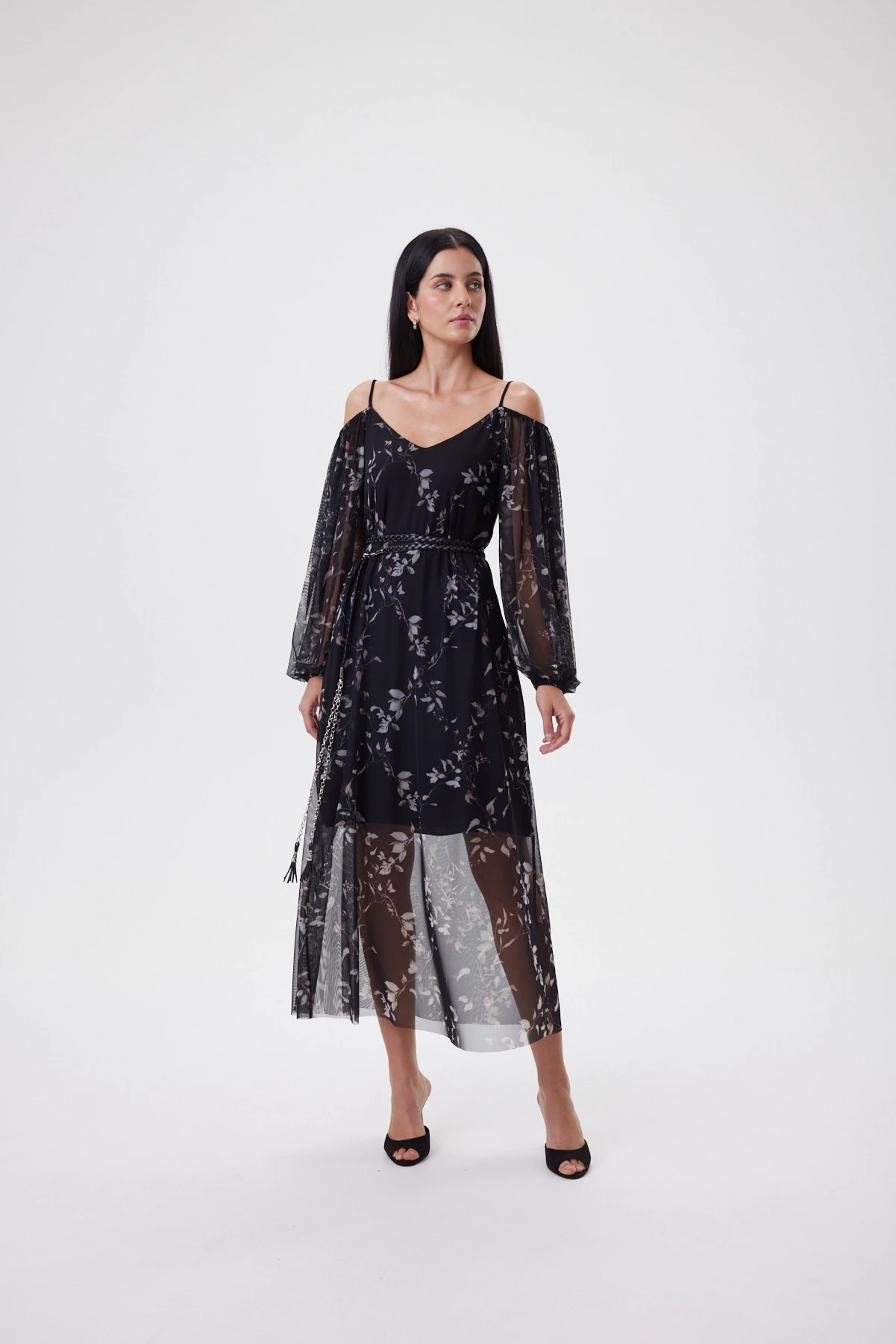 Платье А-силуэта выстраивает тонкую вертикаль: мягкое расширение к низу даёт текучее движение и визуально удлиняет силуэт. Линия плеч трансформируется — бретели и эластичные ленты позволяют носить с открытым, спущенным плечом или более собранно, а воздушный рукав на тесьме держит элегантную форму. Пластичная сетка нового поколения приятна к телу и двусторонне тянется, поэтому посадка получается точной и комфортной. Внутри — подкладка, которая сохраняет деликатную прозрачность без лишней откровенности. На глубоком чёрном фоне серо-розовый флоральный принт выглядит как рисунок в вечернем тумане — мягко, утончённо и люксово. Комбинируется с тонкими босоножками и лаконичными украшениями, а для более прохладного городского настроения — с коротким жакетом или лёгким бомбером поверх.