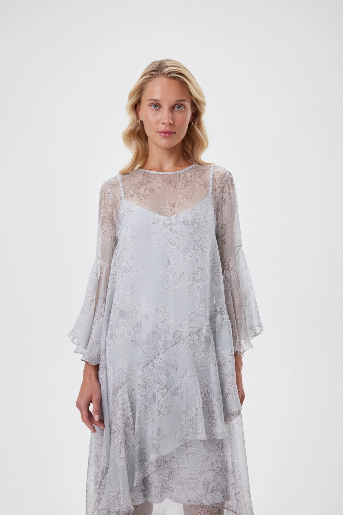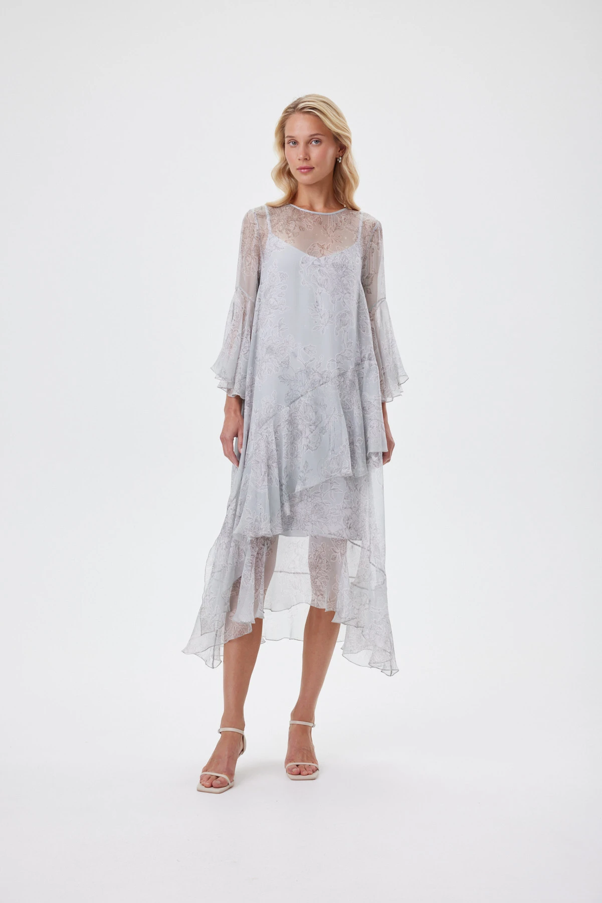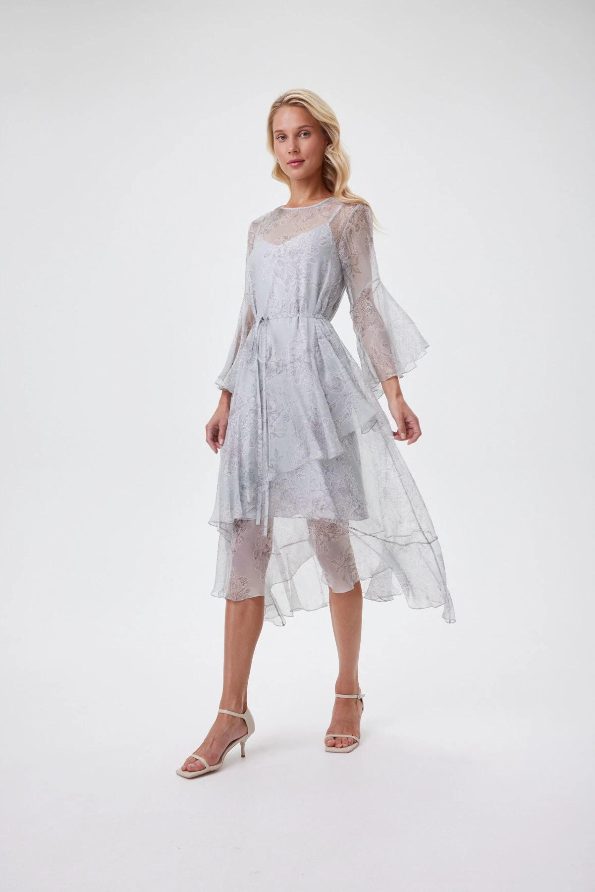 Платье А-силуэта в бохо-эстетике выполнено из тончайшей ткани с волокнами шёлка и вискозы — струящейся, с благородным матовым свечением. Нюдовая палитра пепельно-голубых и дымчато-серебристых оттенков мягко освежает кожу, а тонкая графика цветочного принта подчёркивает женственность и лёгкость образа. Сложная конструкция сочетает долевой и косой крой, благодаря чему платье сохраняет форму и многослойность, не растягиваясь со временем. Каскадный косой подрез по низу визуально стройнит и создаёт игру полупрозрачности, а внутренняя комбинация из премиальной вискозы выравнивает силуэт, оставляя ощущение лёгкой «вуали». Втачные воланы по рукавам и подолу добавляют романтичной воздушности без лишнего объёма — в движении они оживают, превращая силуэт в невесомое облако.