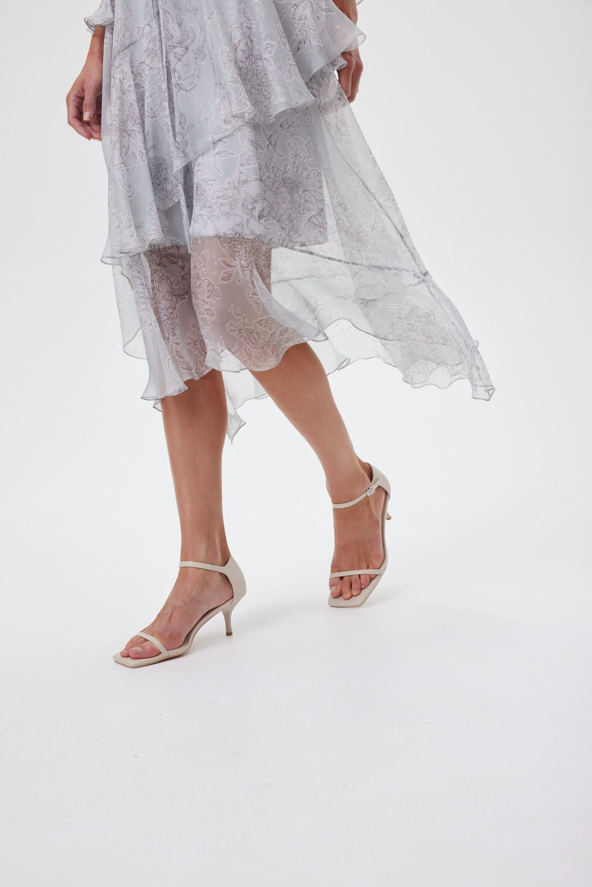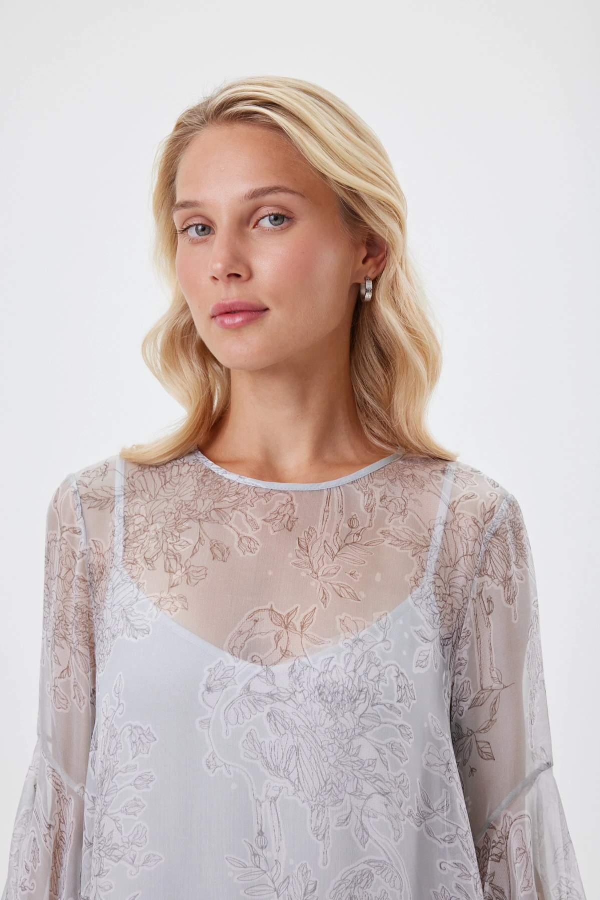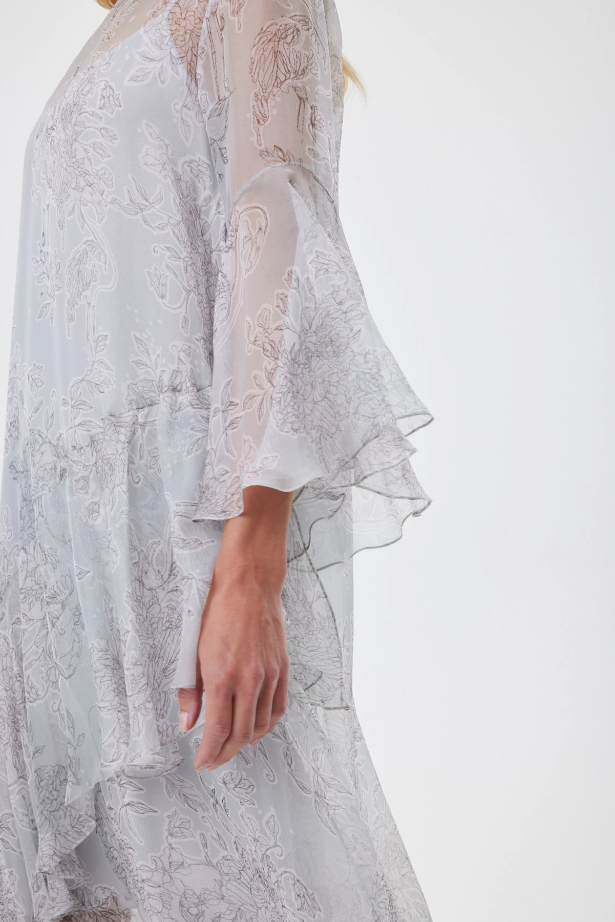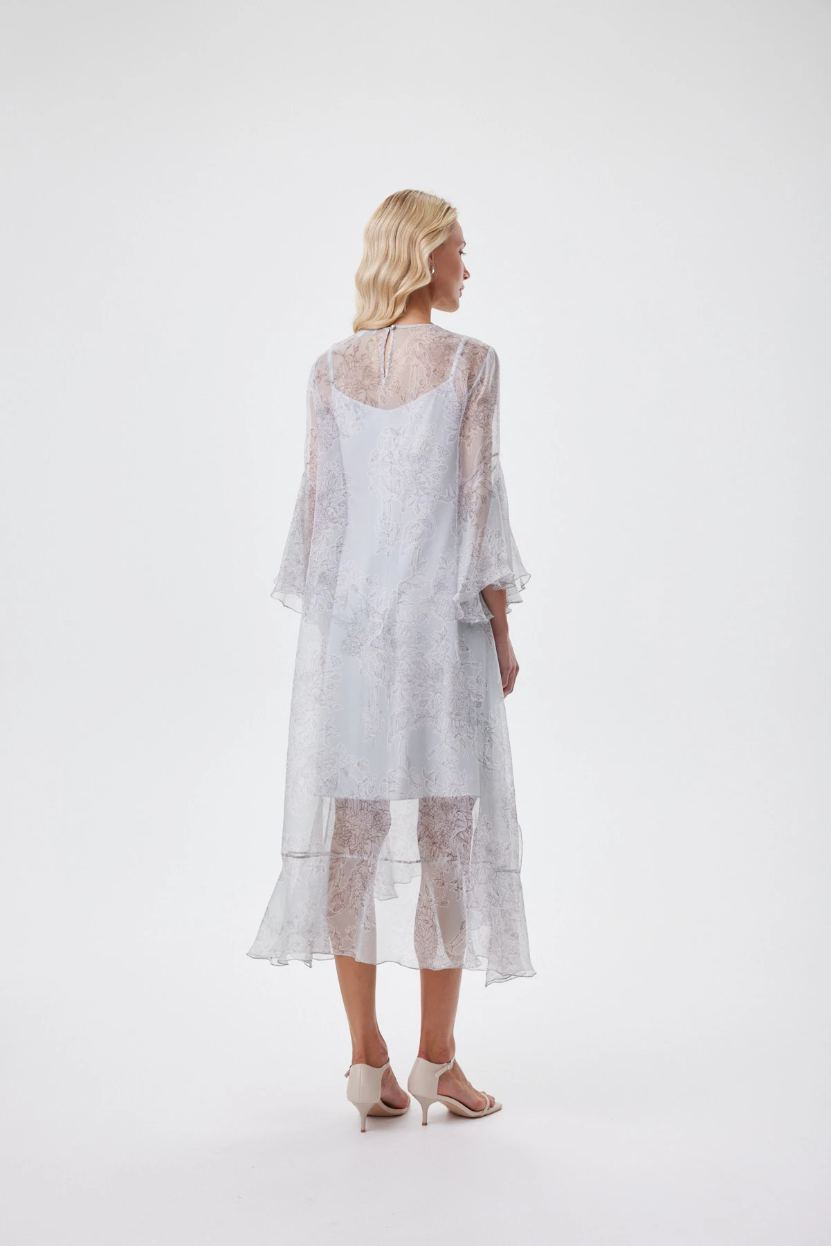 Платье А-силуэта в бохо-эстетике выполнено из тончайшей ткани с волокнами шёлка и вискозы — струящейся, с благородным матовым свечением. Нюдовая палитра пепельно-голубых и дымчато-серебристых оттенков мягко освежает кожу, а тонкая графика цветочного принта подчёркивает женственность и лёгкость образа. Сложная конструкция сочетает долевой и косой крой, благодаря чему платье сохраняет форму и многослойность, не растягиваясь со временем. Каскадный косой подрез по низу визуально стройнит и создаёт игру полупрозрачности, а внутренняя комбинация из премиальной вискозы выравнивает силуэт, оставляя ощущение лёгкой «вуали». Втачные воланы по рукавам и подолу добавляют романтичной воздушности без лишнего объёма — в движении они оживают, превращая силуэт в невесомое облако.