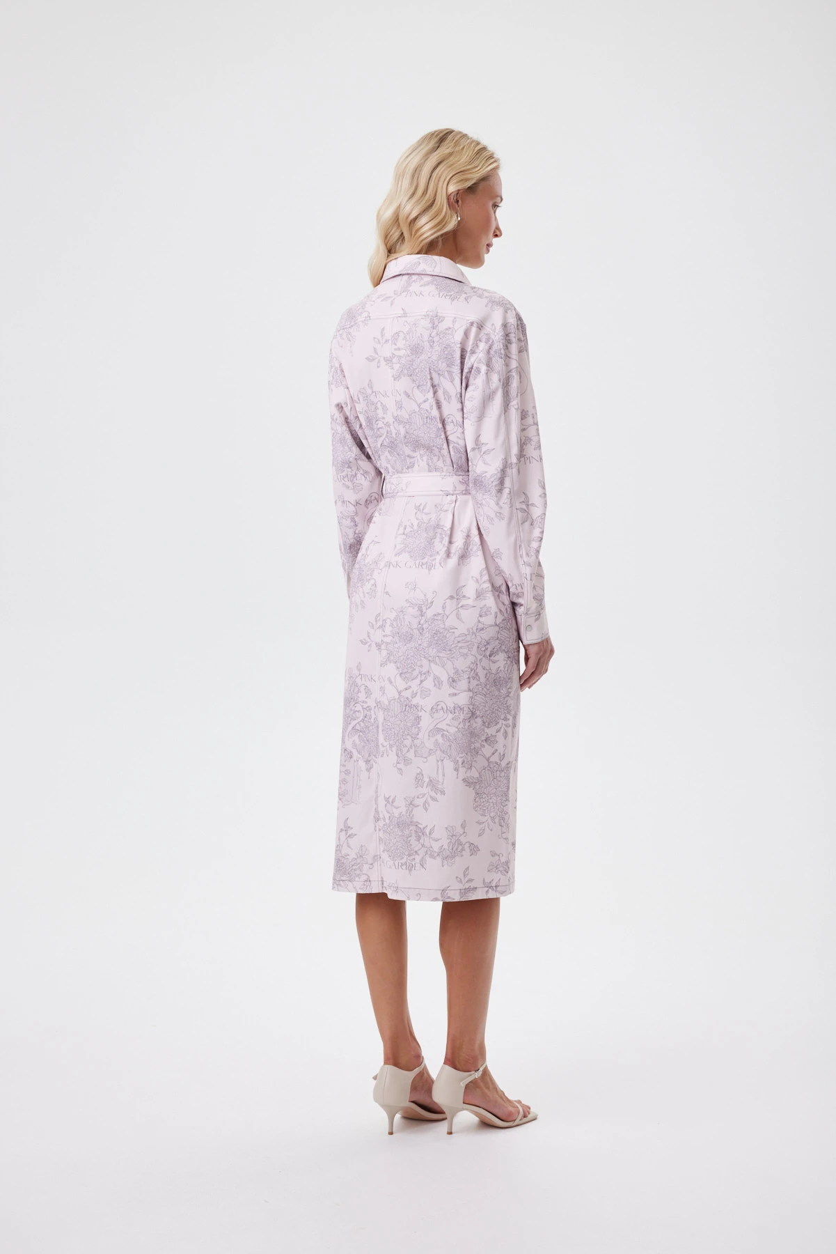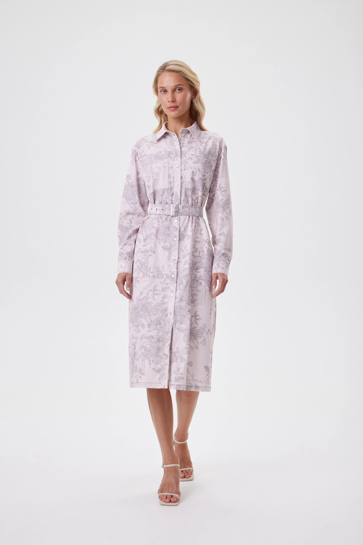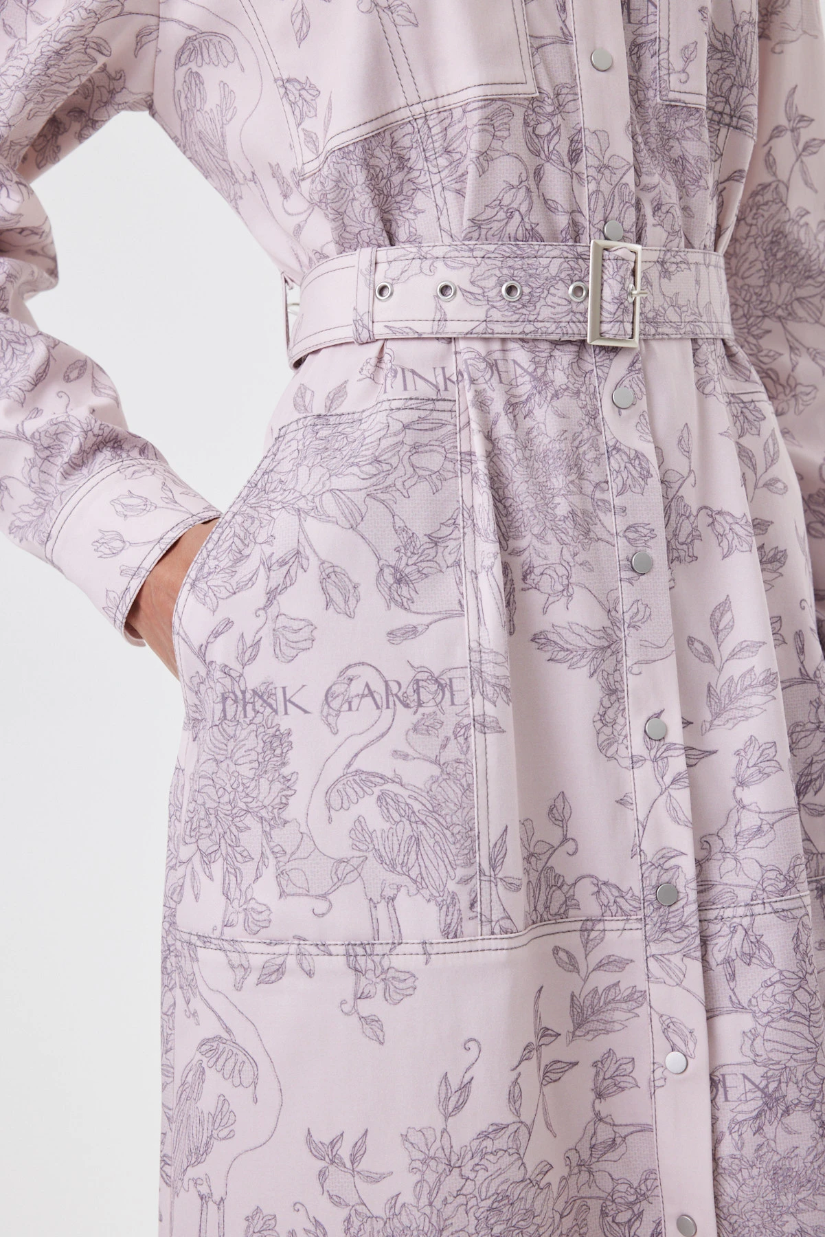 Платье-рубашка в стиле сафари соединяет функциональность и женственную выразительность: накладные карманы, кнопки и съёмный пояс с пряжкой задают чёткую форму, но силуэт остаётся мягким и динамичным. Рельефы, проходящие через карманы, визуально вытягивают фигуру, а слегка спущенный рукав и углублённая пройма дают современную, расслабленную посадку. Двухслойный полихлопок продуман для реальной жизни: верхний слой практичный — не мнётся, не выгорает и сохраняет насыщенность рисунка, нижний хлопковый — воздухопроницаемый и комфортный к телу. Деликатный авторский принт с фламинго и цветами выглядит как тонкая графика. Так, в одном образе встречаются собранность, романтика и лёгкий дух путешествий.
