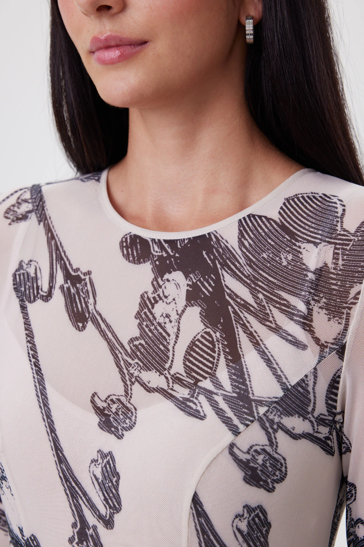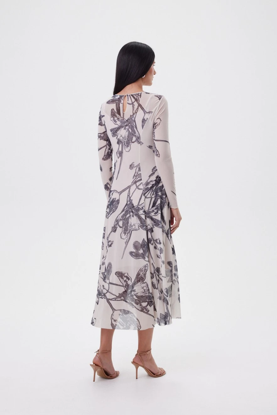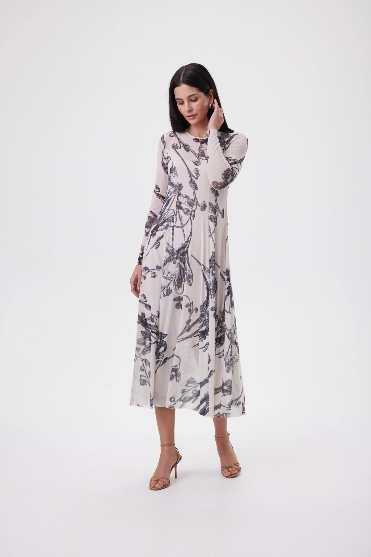 Платье в молочно-чёрной гамме звучит сдержанно и современно — тот самый вариант, который подходит и для прогулки, и для офиса. Авторский цветочный принт выглядит как иллюстрация тушью: ручной рисунок перенесён в digital-формат, поэтому линии остаются графичными, а нежные цветы создают изысканный и деликатный контраст. Нагрудные вытачки и клинья, раскрывающиеся от талии, выстраивают плавную вертикаль и естественный силуэт: сетка повторяет контуры тела без излишнего акцента, а расклёшенный низ добавляет динамики в шаге. Плотная двусторонне эластичная сетка приятна к телу и хорошо держит форму. Внутри — молочная вискозная комбинация, которая улучшает посадку, отвечает за комфорт и может носиться отдельно с другими изделиями.