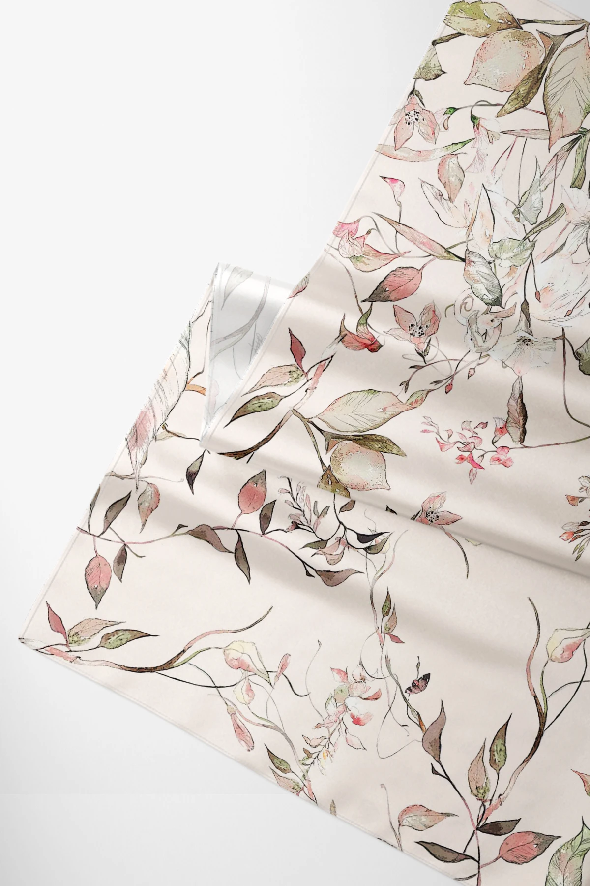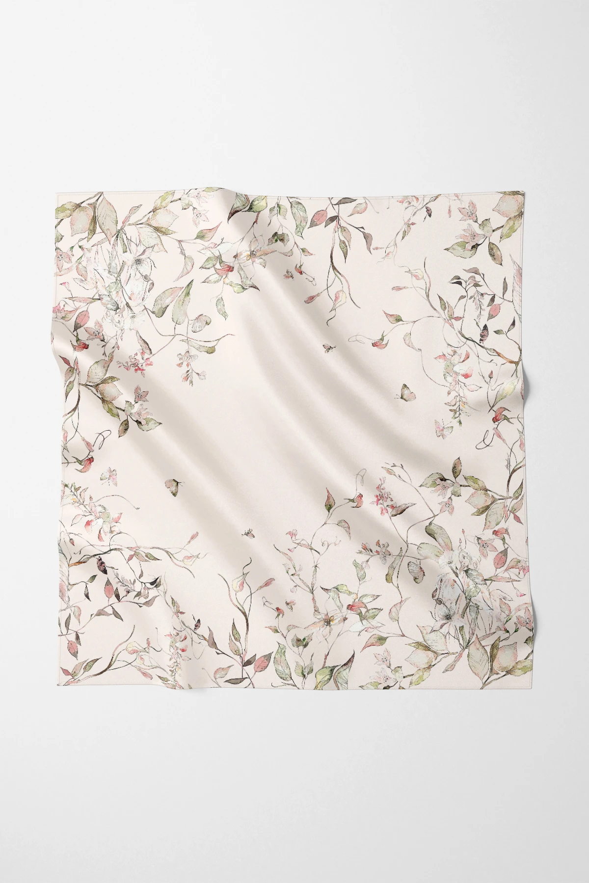 Платок в нежно-розовой гамме работает как мягкий фильтр у лица: оттенок освежает и добавляет любому образу утончённости. Акварельный рисунок цветов и зелени, созданный по мотивам растений старинных оранжерей и садов, выглядит тонко и интеллигентно — лёгкие полутона и воздушные линии читаются как художественная зарисовка. Платок универсальный: на шее — вместо украшения, на волосах — как аккуратная резинка или ободок, на ручке сумки — как уникальный акцент.