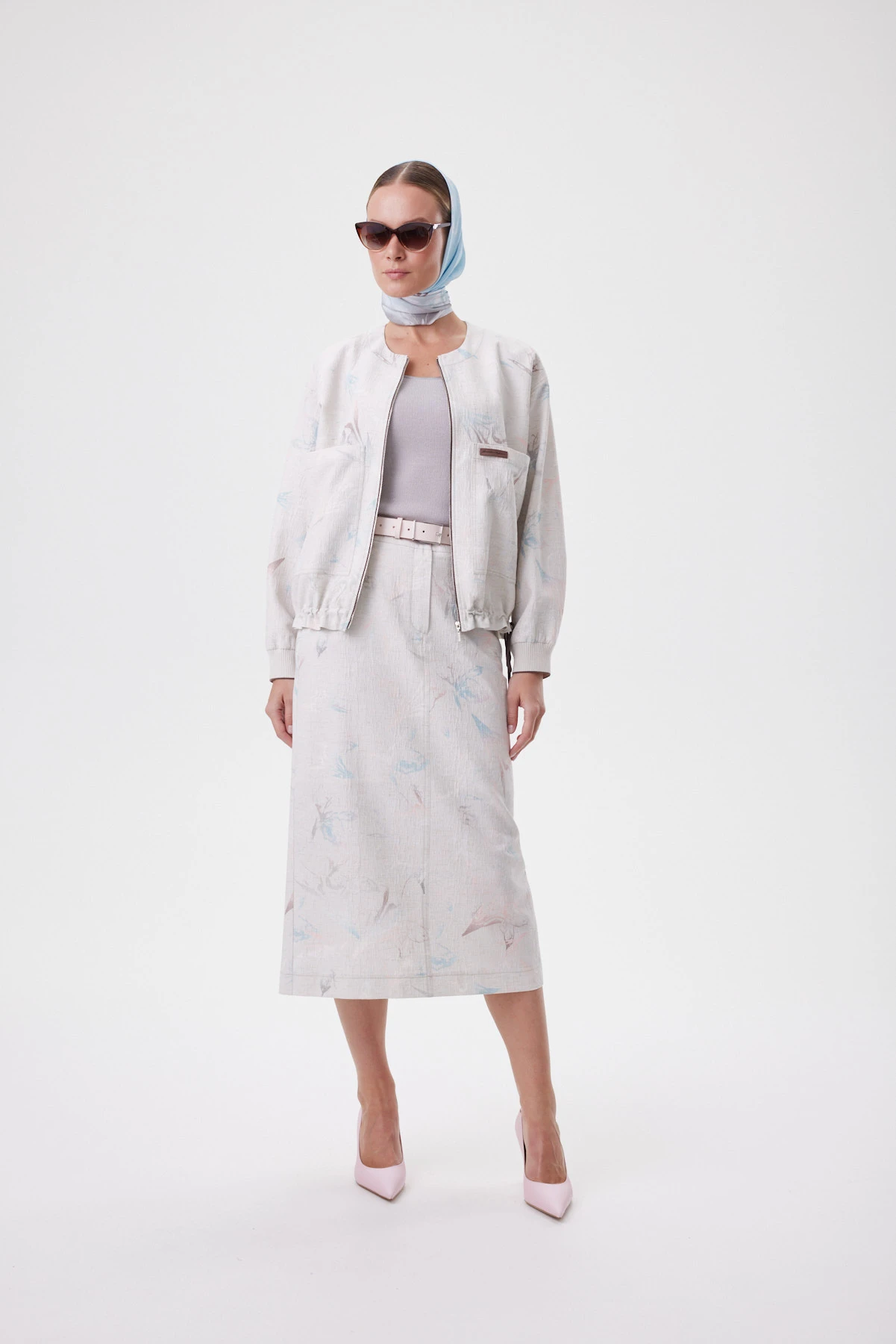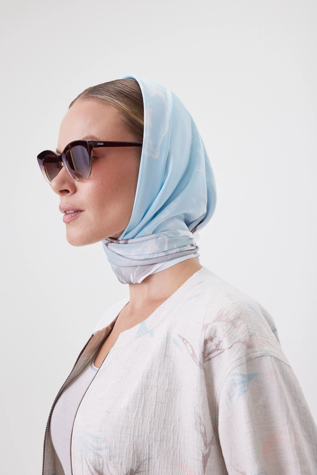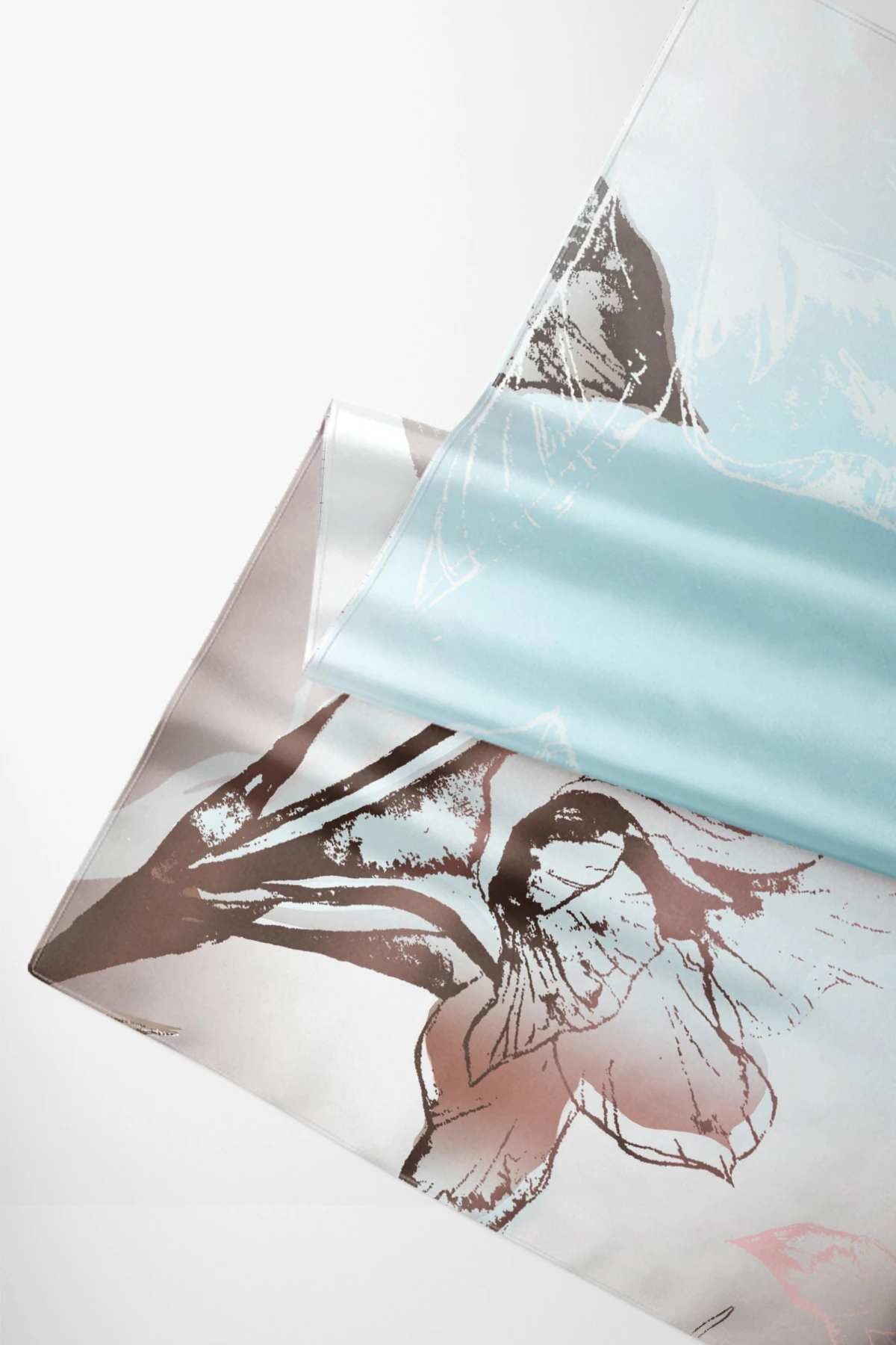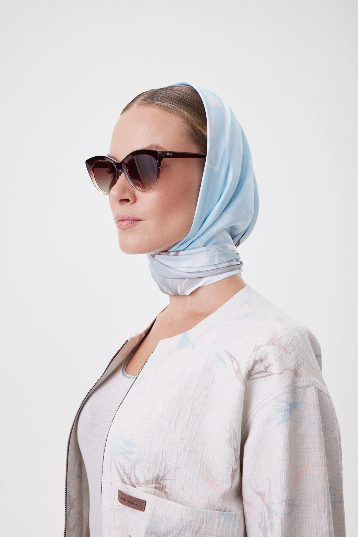 Платок с акварельным градиентом от холодного нежно-небесного к тёплому шоколадно-карамельному работает как мягкий «световой фильтр» у лица. Главный мотив — гладиолус, нарисованный от руки и переведённый в digital: силуэты почти невесомые, едва заметные, словно парят на фоне голубого неба, создавая ощущение воздуха и тихой элегантности. Лёгкий рисунок не спорит с образом, а добавляет ему глубину: платок изящно смотрится на шее, волосах и как акцент на сумке. Особенно гармоничен с молочным, бежевым, денимом и шоколадными оттенками — когда хочется добавить благородного цвета.