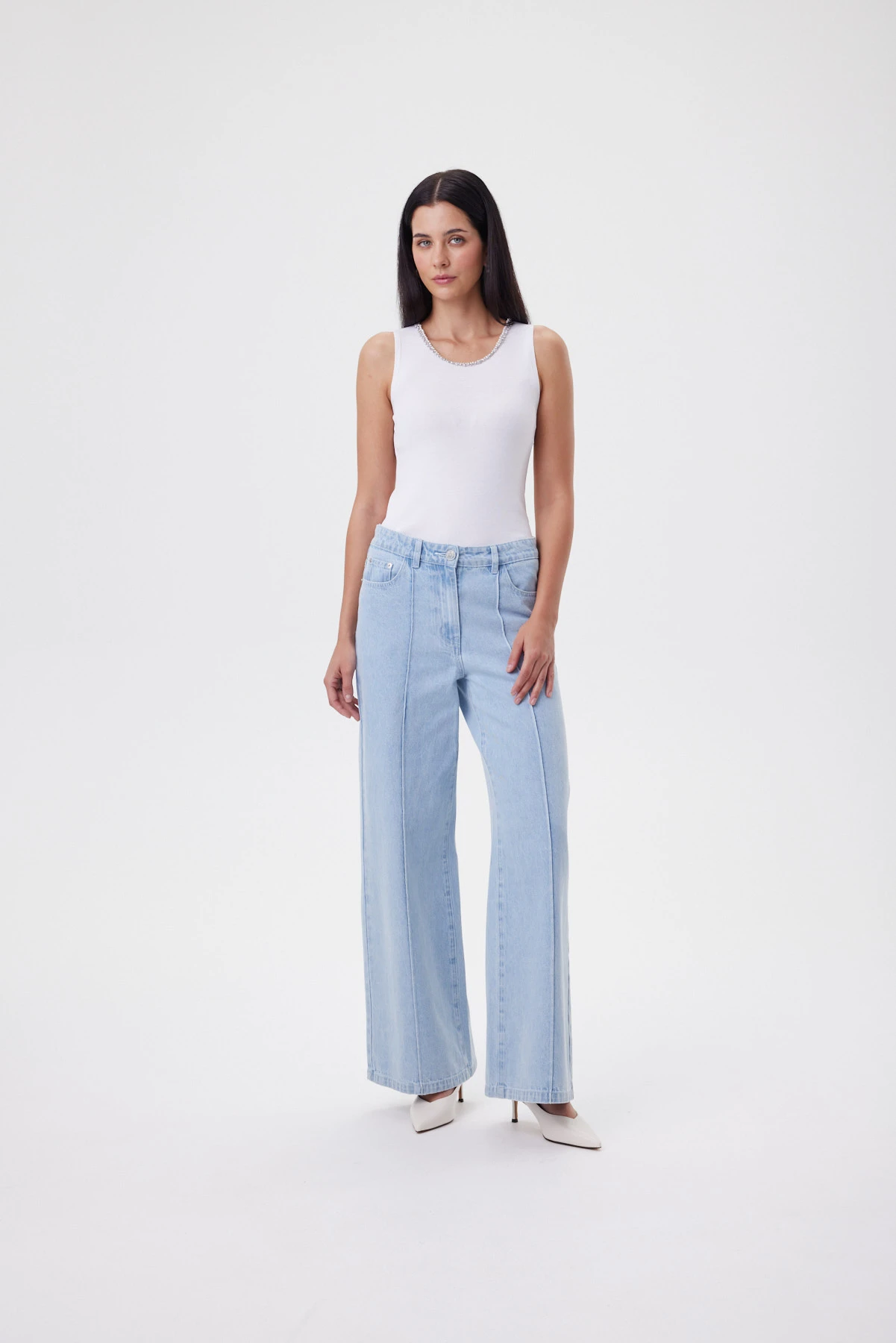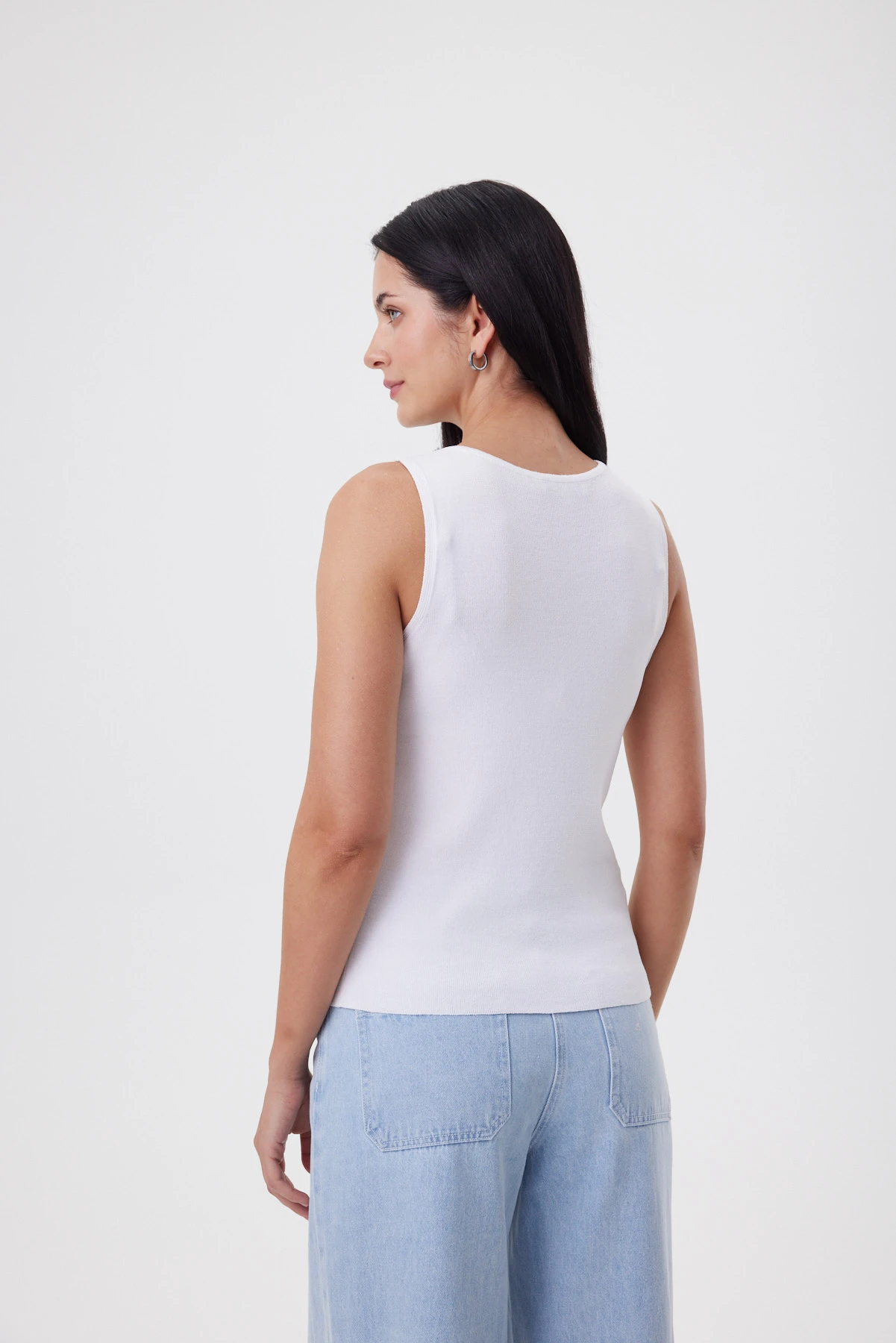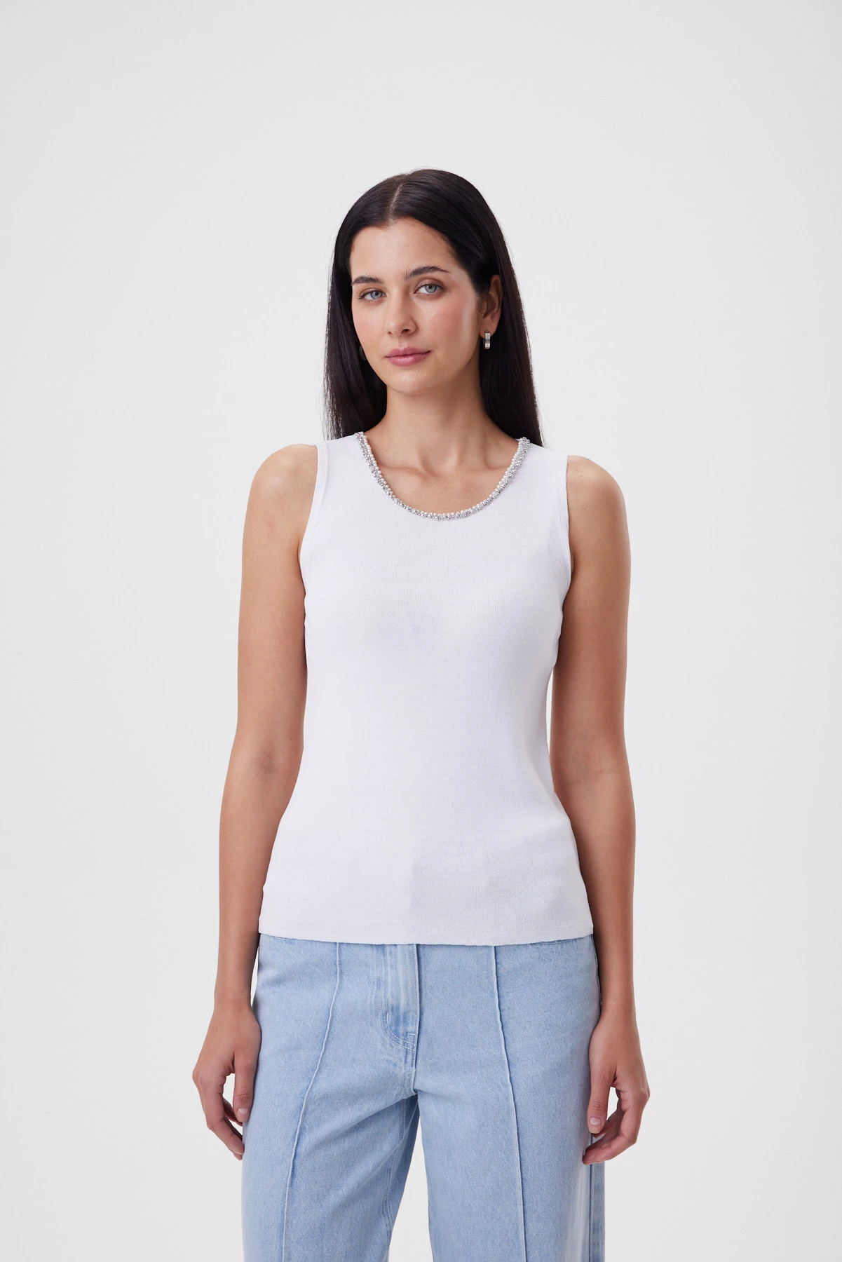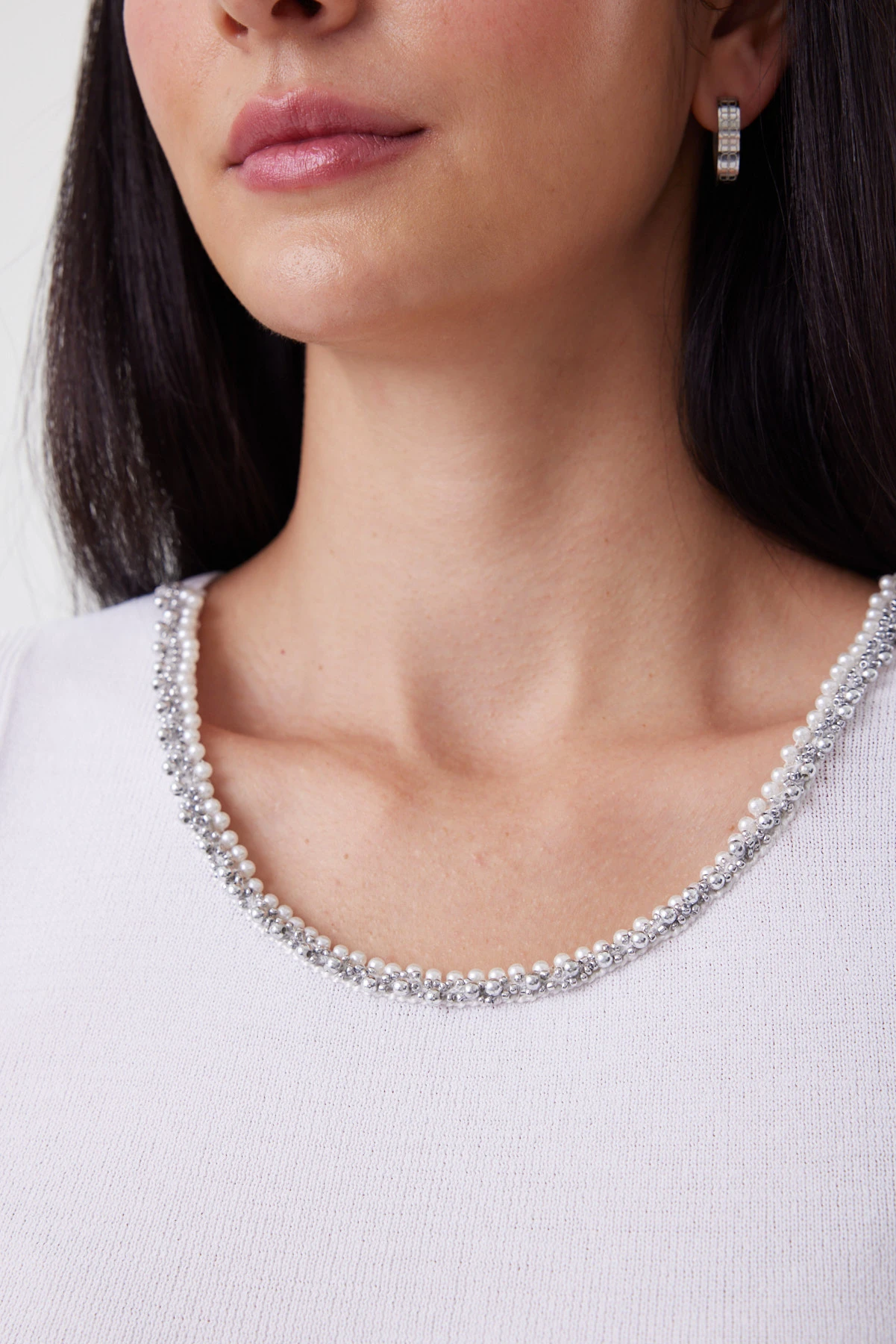По форме выреза топа выложены две тесьмы с разными видами бусин. Это не готовый фабричный элемент, а кропотливая работа: каждая лента оформлена по-своему, а их комбинация создаёт объёмный, переливающийся контур, поэтому можно обойтись без ожерелья и выглядеть нарядно. Чистый белый цвет, ровное полотно и мерцающая отделка горловины — всё это не кричит, а тихо собирает образ, подчёркивает шею и ключицы, освежает лицо и делает любой низ более аккуратным. Вискоза даёт мягкость и ощущение “второй кожи”, нейлон отвечает за упругость и “пружинность”: изделие не вытягивается, не теряет своей эластичности по низу и проймам, после носки возвращается к первоначальной форме.