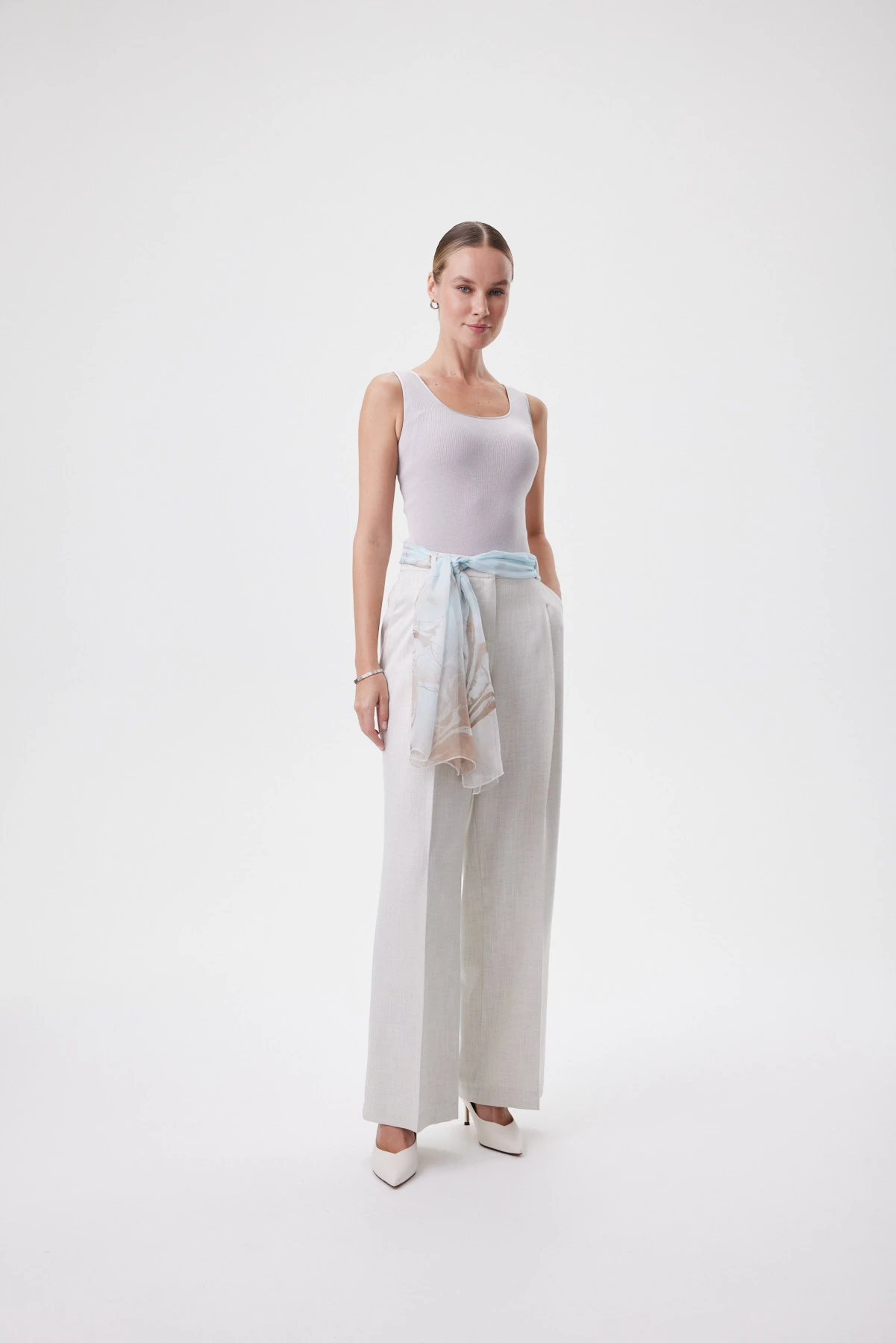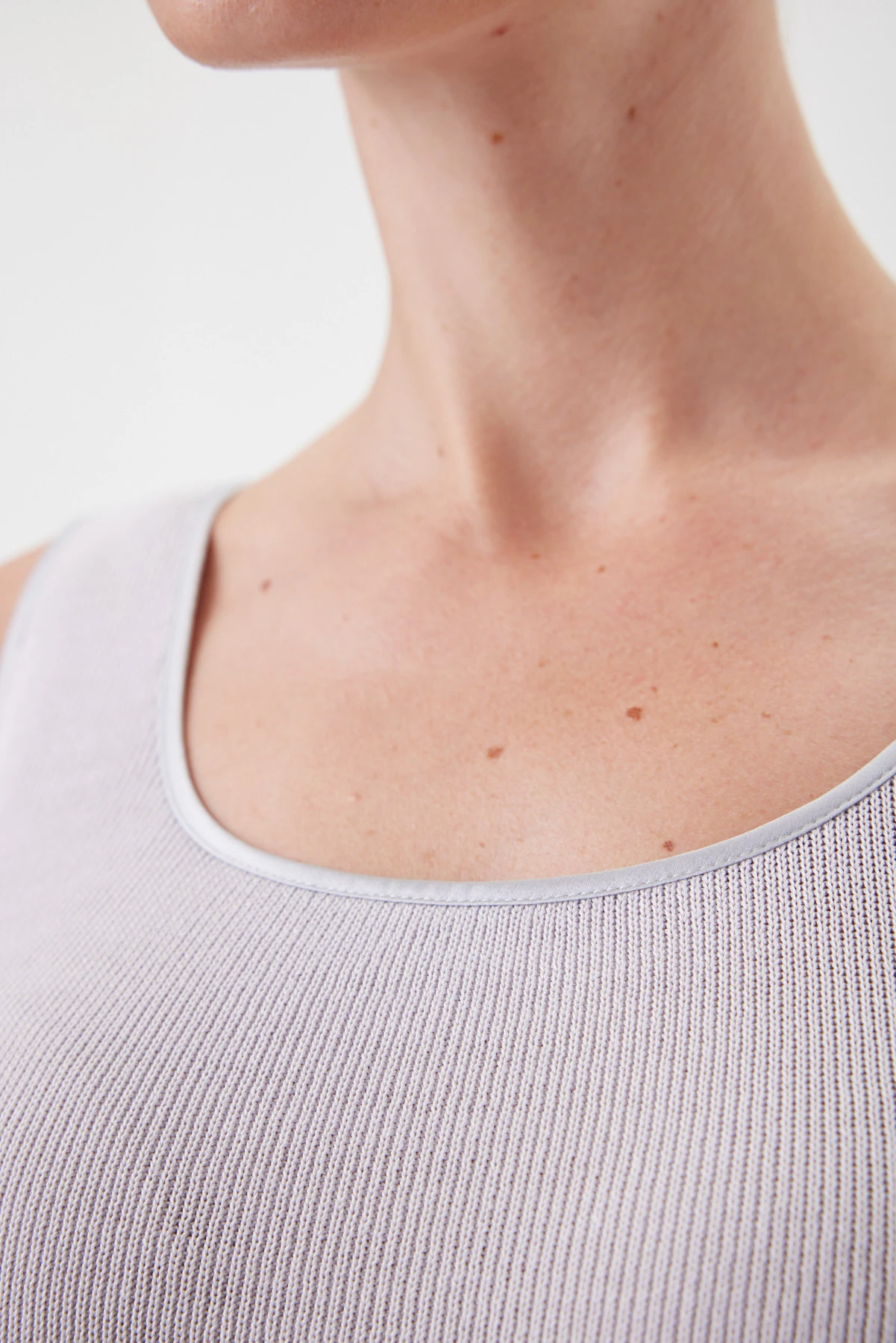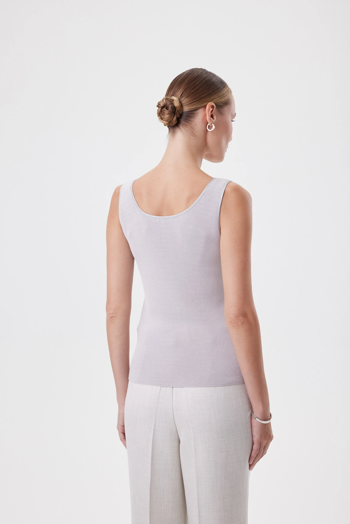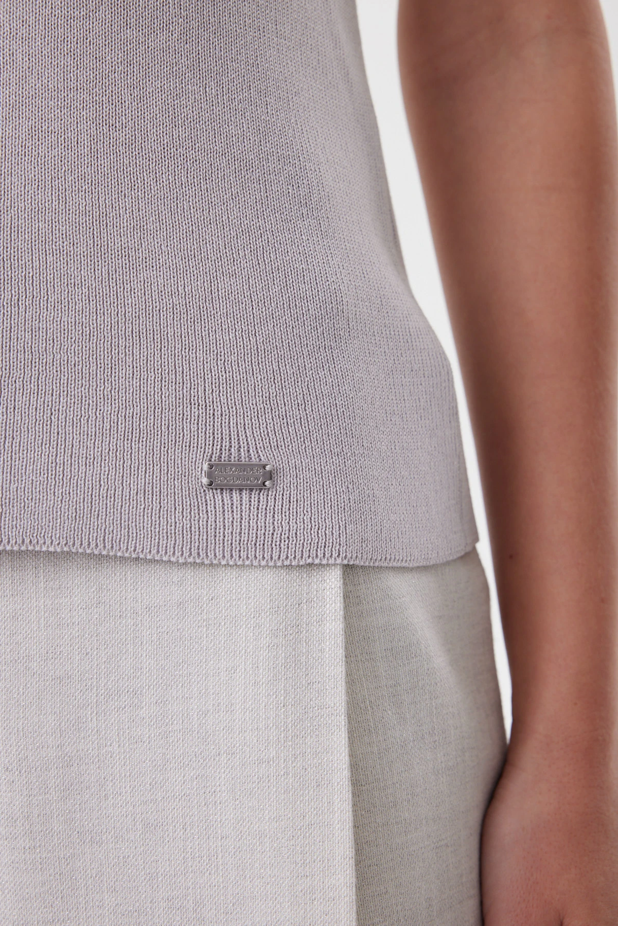 Трикотажный топ эластично повторяет фигуру, мягко собирая силуэт без лишнего обтяжения — удобно носить и соло, и под жакет. Глубина горловины и пройм выверена так, чтобы линия плеча и зона декольте выглядели аккуратно и женственно. Жемчужно-лавандовый оттенок с лёгким серебристым отливом мягко подсвечивает верх и делает образ более свежим. Пластичное полотно приятно к телу, комфортно даже в жару и держит форму без вытяжения. Ключевой акцент — окантовка горловины и пройм натуральным атласным шёлком: такой деликатный приём даёт тонкое сияние и ощущение премиальной отделки. Небольшая металлическая плашка по низу завершает образ. Сочетайте с белыми или графитовыми брюками для офиса, с денимом — для casual, или с юбкой в гладкой фактуре, чтобы подчеркнуть деликатный блеск топа.