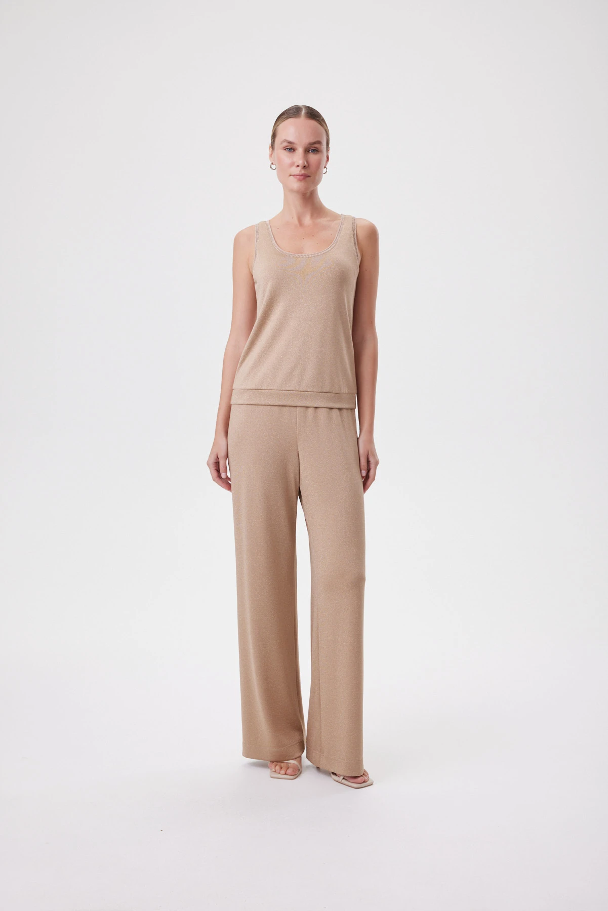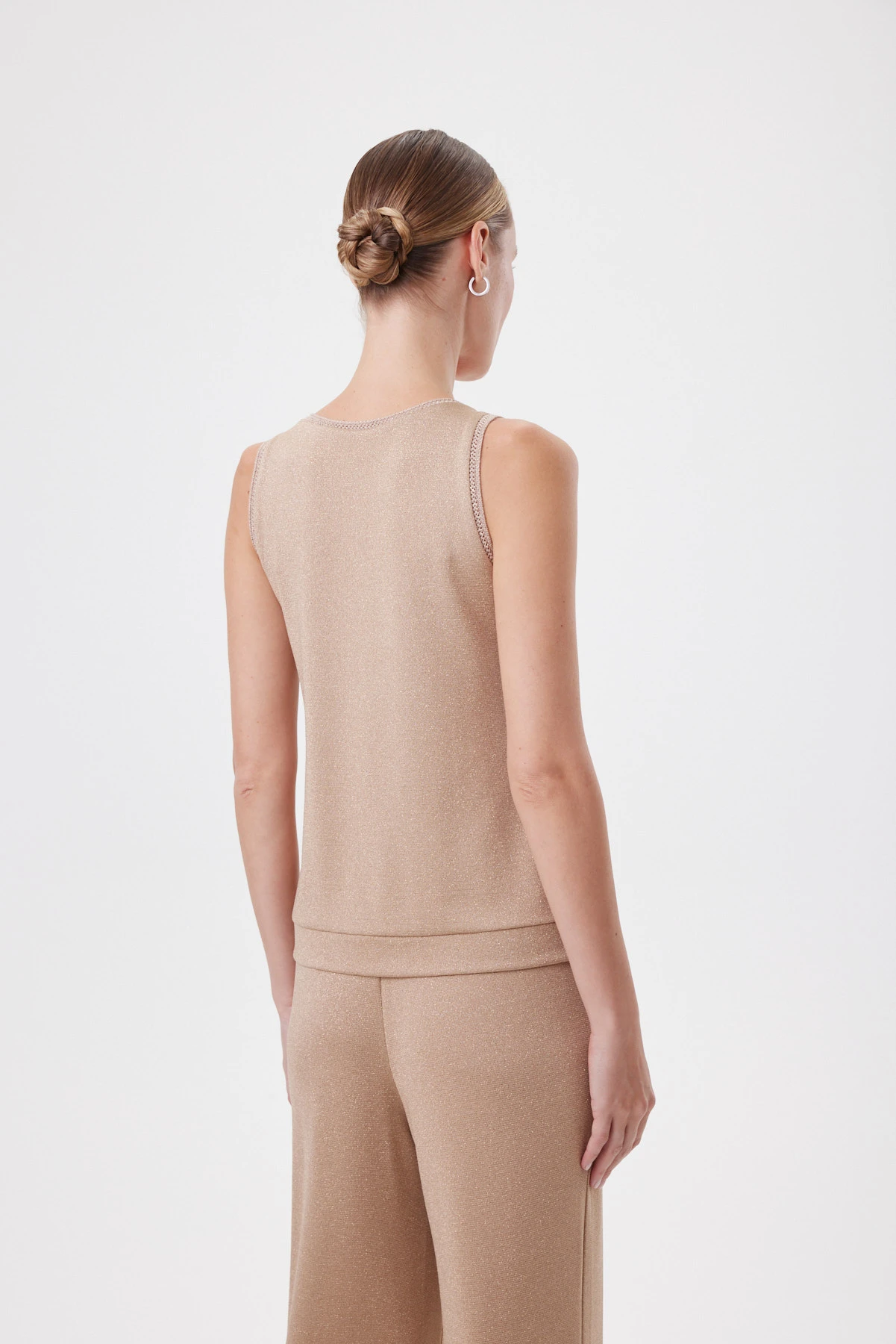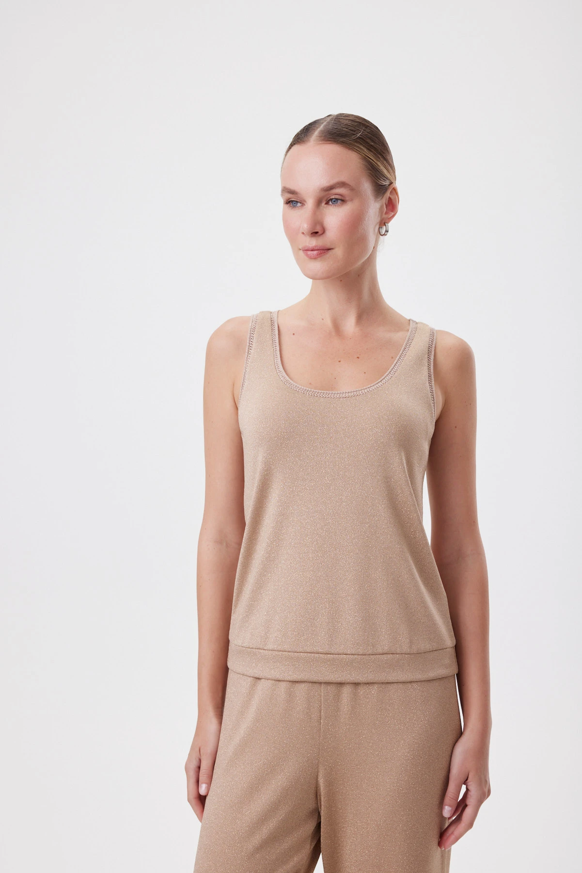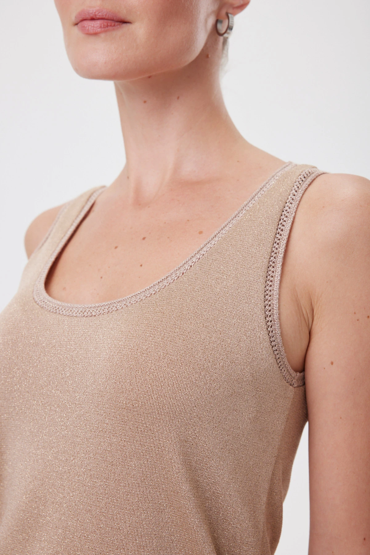 Топ из мягкого трикотажа с метанитом даёт тонкое сияние в движении. Модель мягко повторяет линию фигуры, но не облегает — создаёт ощущение воздушности и спокойствия. Низ выполнен широким притачным манжетом, чтобы топ не растягивался в носке и сохранял форму. Бретели достаточно широкие, чтобы элегантно открывать плечи. Ажурная эластичная бейка в тон по горловине и проймам добавляет лёгкий рельеф. Нюдовый беж с эффектом световой дымки выглядит благородно и универсально: днём — с белыми брюками, денимом и жакетом, вечером — с «золотыми» брюками из капсулы или сатиновой юбкой и лаконичными украшениями.