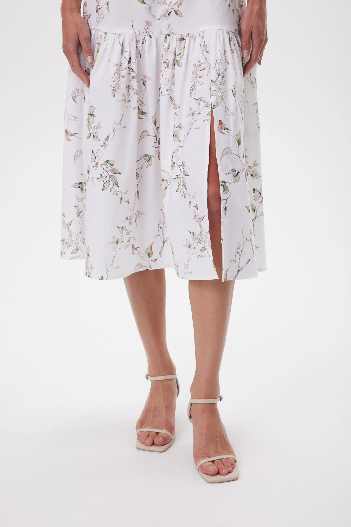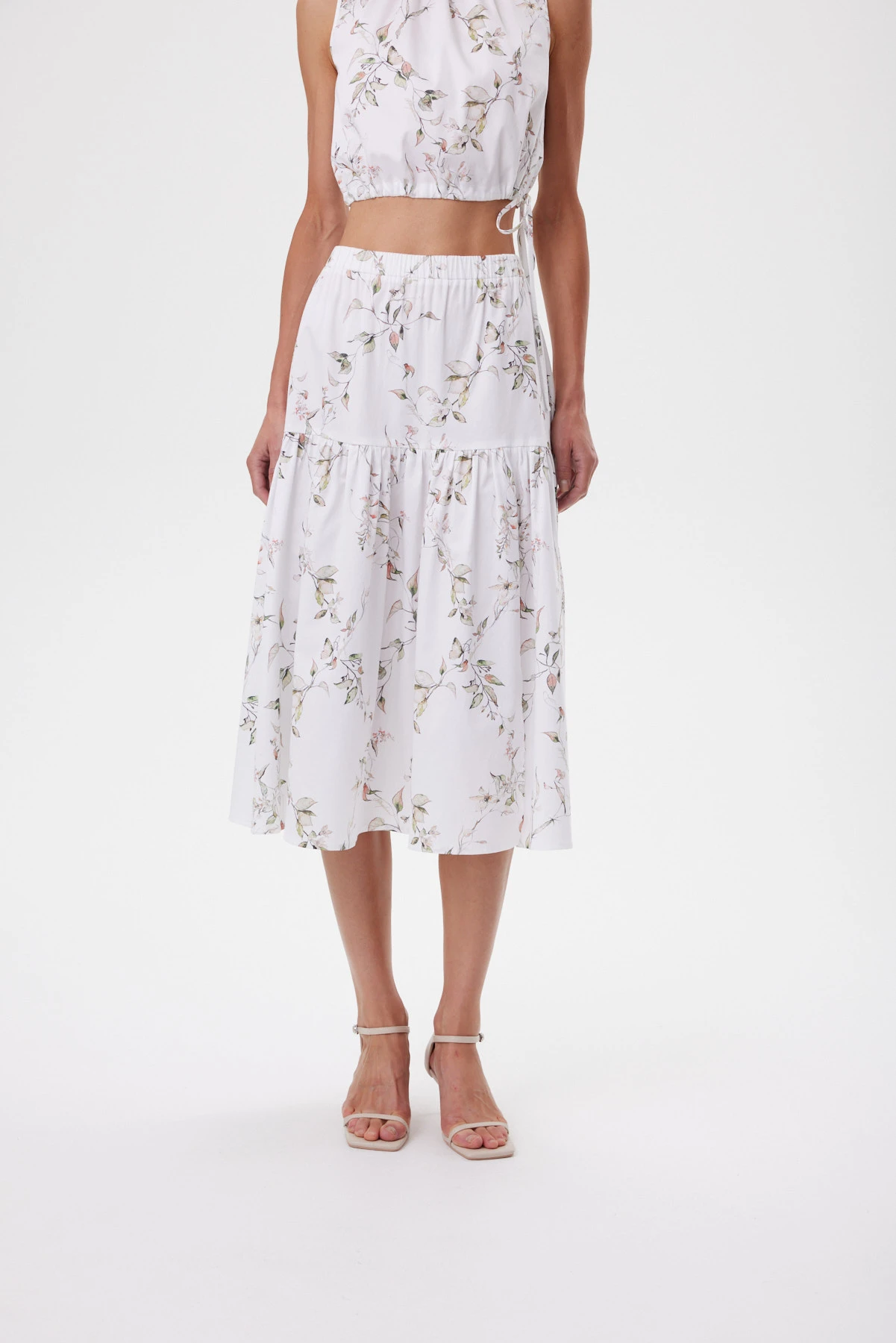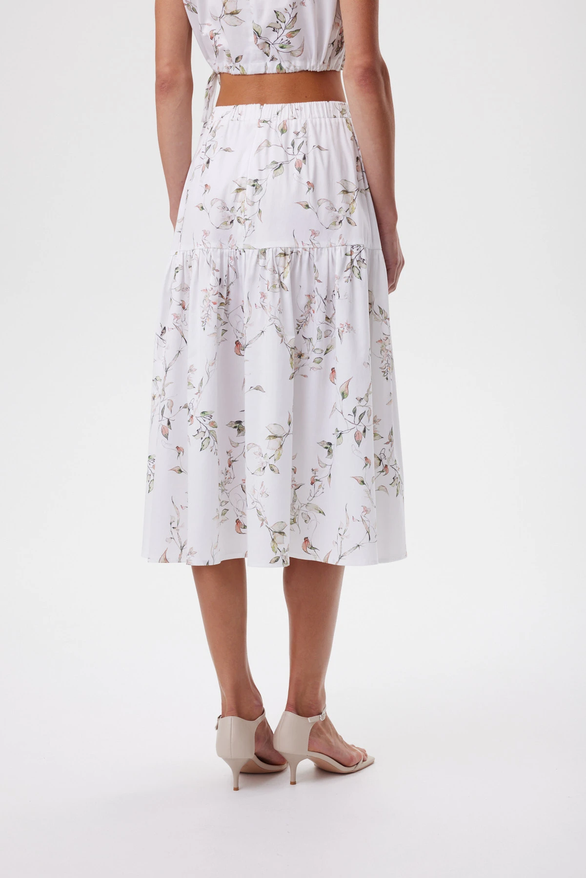 Юбка идеально передаёт настроение отдыха, тепла, чистоты и летней свободы. Акварельный ботаничекий принт словно нанесён на ткань мазками — этот художественный эффект подчёркивает философию спокойной женственности и естественной красоты. Вытачки собирают линию талии аккуратно, а эластичный пояс садится мягко и ровно, без лишнего объёма. Небольшой разрез в нижнем ярусе юбки добавляет динамики и воздушности образу. Премиальный хлопок комфортен в жару, эластан в составе даёт пластичность, чтобы ткань красиво струилась в движении. Комплектуется с укороченным топом и оливковыми жакетом-кимоно из капсулы для контраста фактур, с белой рубашкой навыпуск или с лёгким жакетом-кимоно для собранного летнего комплекта.