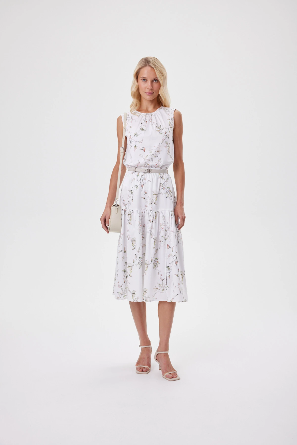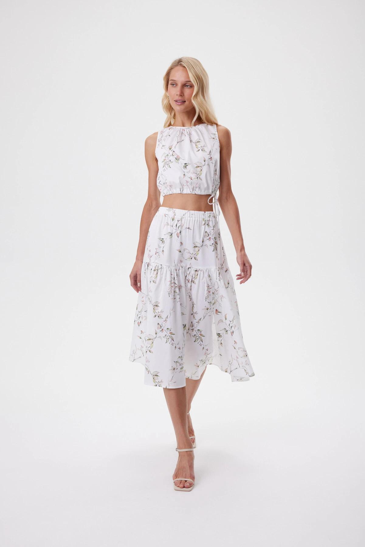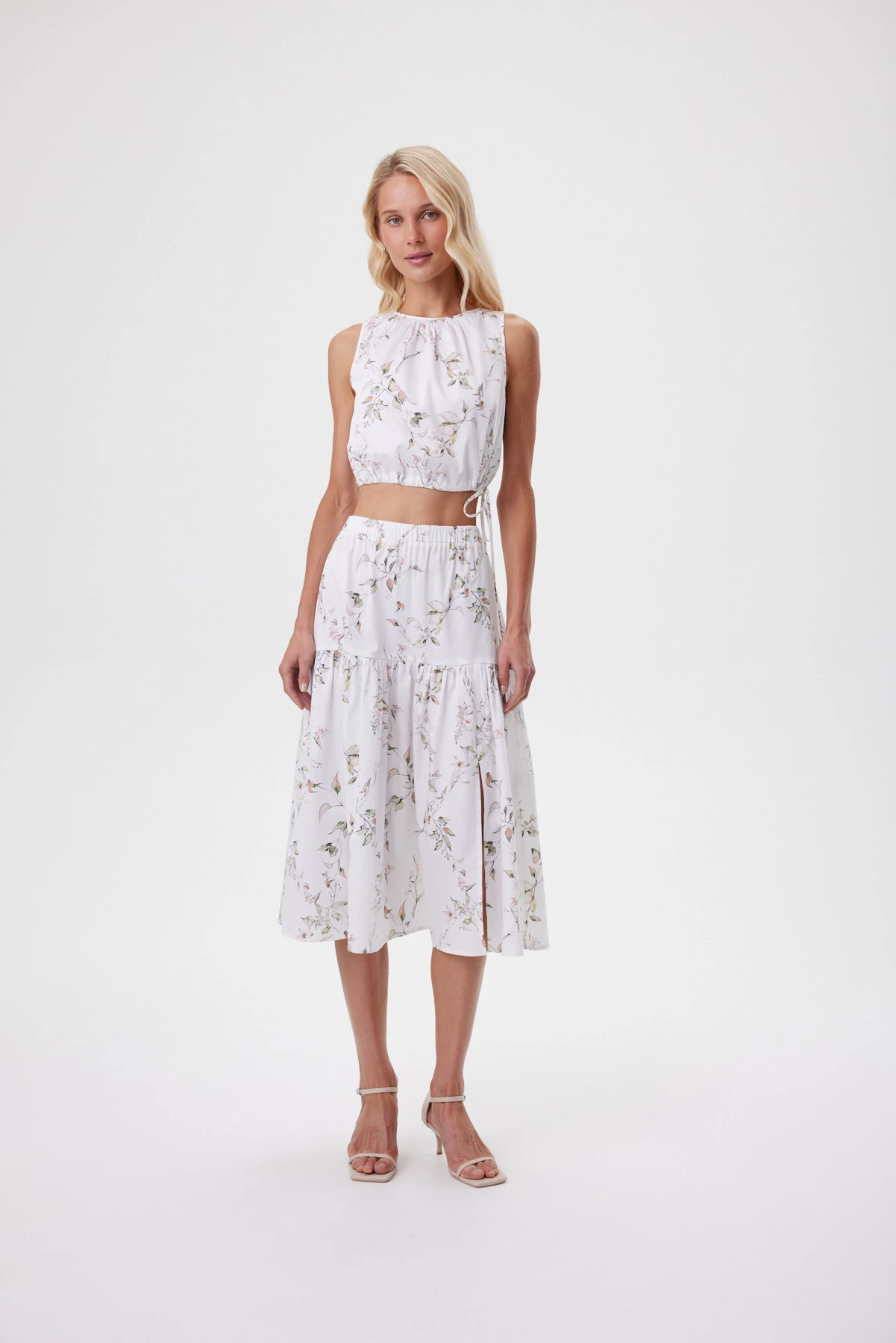 Юбка идеально передаёт настроение отдыха, тепла, чистоты и летней свободы. Акварельный ботаничекий принт словно нанесён на ткань мазками — этот художественный эффект подчёркивает философию спокойной женственности и естественной красоты. Вытачки собирают линию талии аккуратно, а эластичный пояс садится мягко и ровно, без лишнего объёма. Небольшой разрез в нижнем ярусе юбки добавляет динамики и воздушности образу. Премиальный хлопок комфортен в жару, эластан в составе даёт пластичность, чтобы ткань красиво струилась в движении. Комплектуется с укороченным топом и оливковыми жакетом-кимоно из капсулы для контраста фактур, с белой рубашкой навыпуск или с лёгким жакетом-кимоно для собранного летнего комплекта.