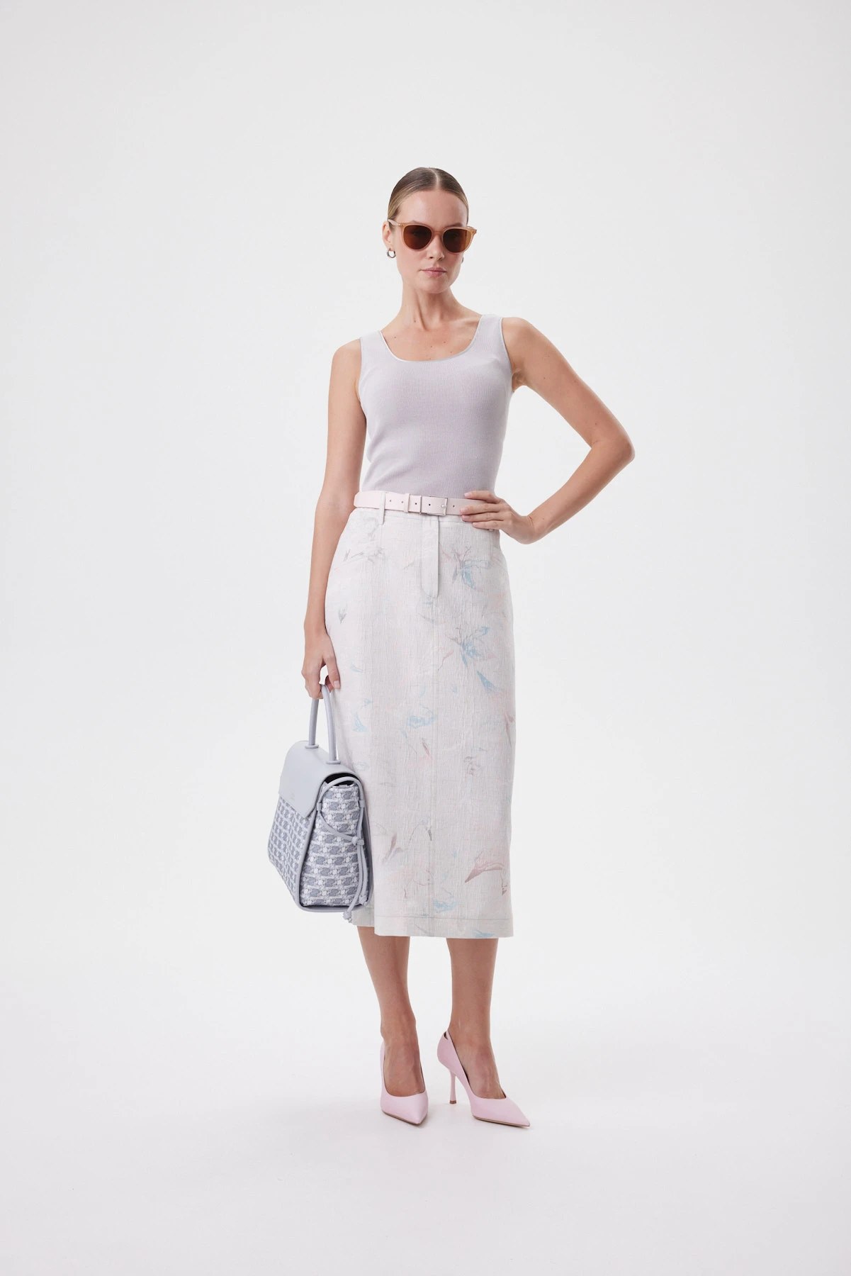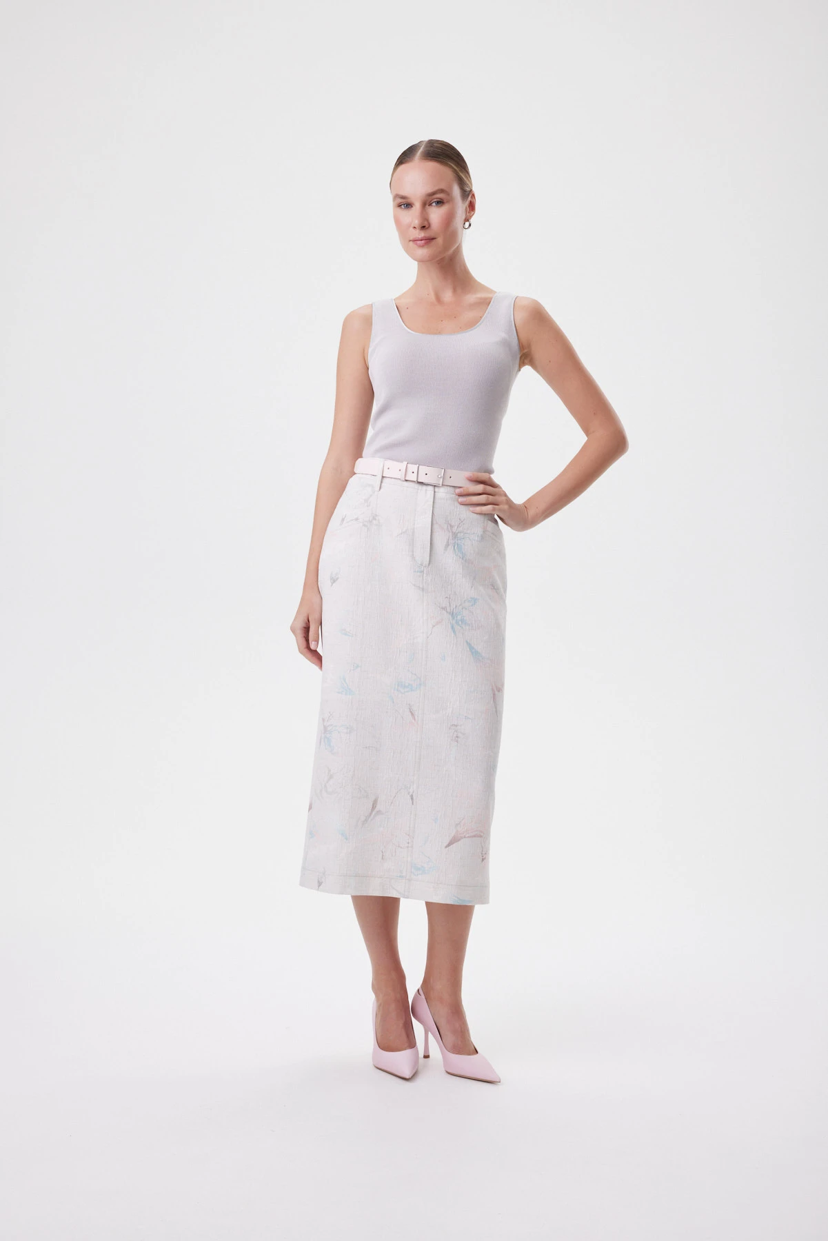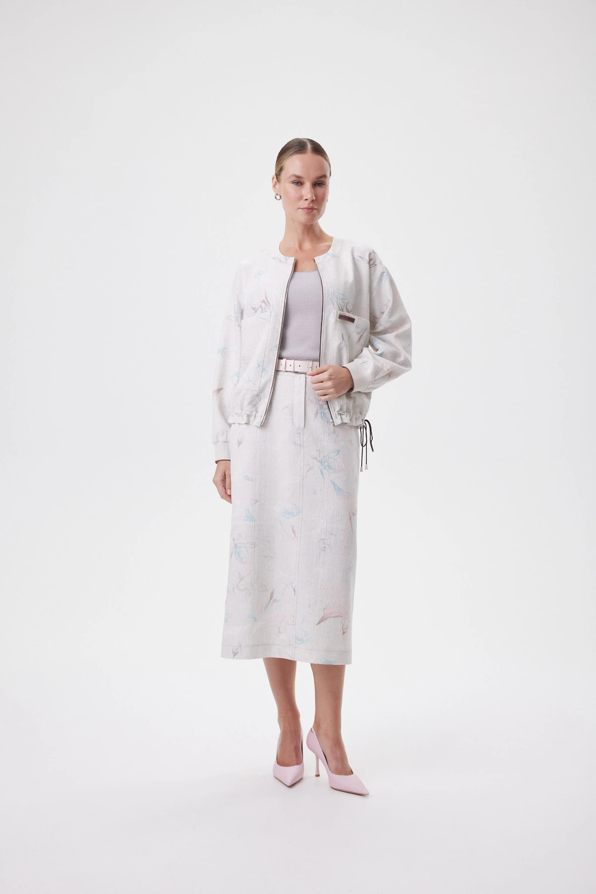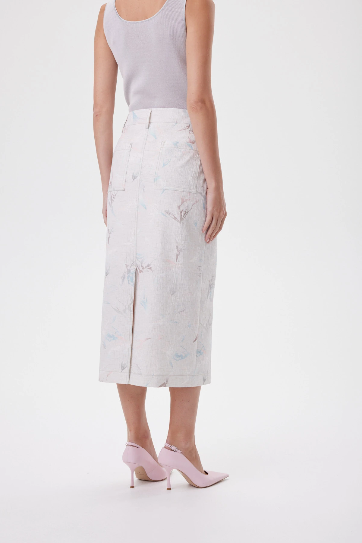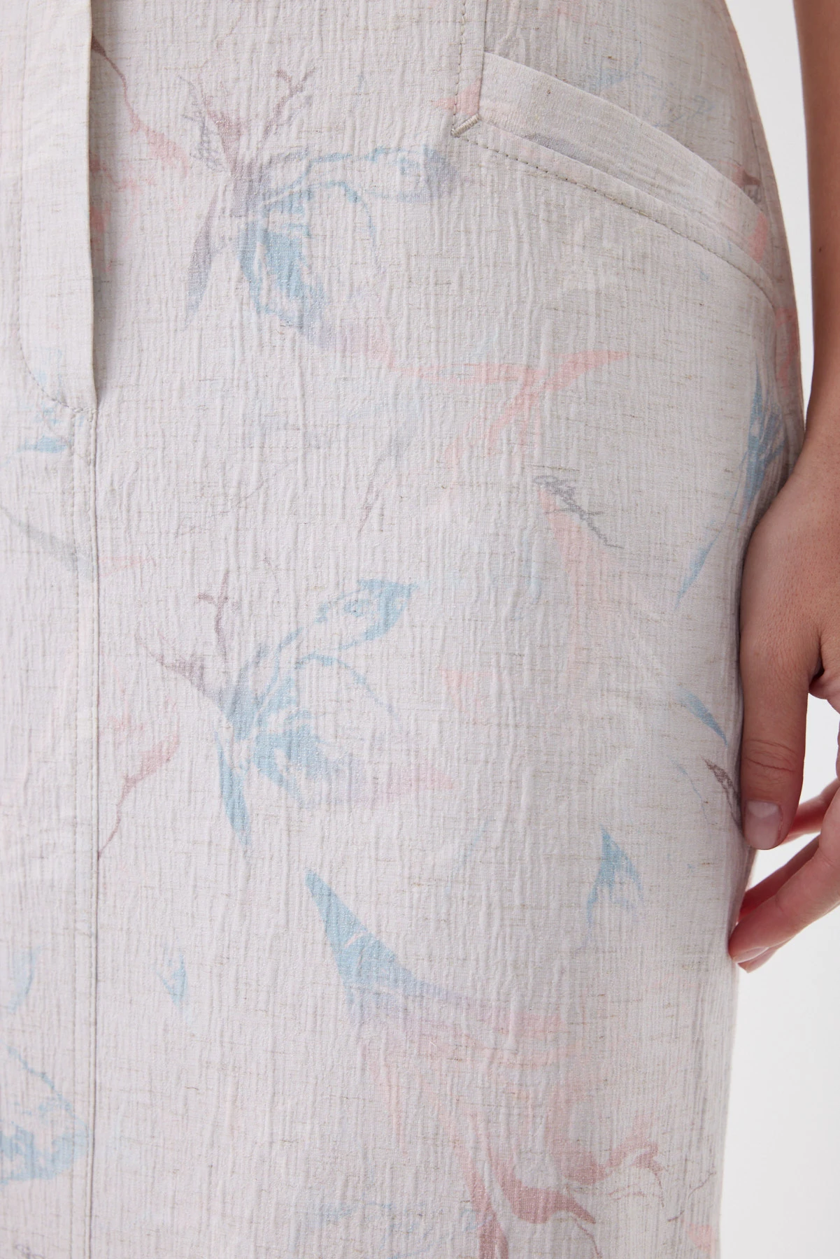 Юбка прямого силуэта с мягким сужением к низу выстраивает стройную вертикаль и аккуратно собирает талию — без жёсткости и «статичности» в шаге. Конструкция вдохновлена денимом: гульфик, карманы и линия пояса создают привычную, собранную посадку, а задний разрез даёт свободу движения и красивую походку. Фактурная смесовая ткань с лёгким переливом держит форму и меньше мнётся, поэтому юбка выглядит аккуратно весь день, а стойкая цифровая печать сохраняет чистоту оттенков. Акварельно-пастельный принт уравновешен «джинсовыми» строчками, шлёвками и объёмными карманами — получается модный контраст романтики и casual. Внутри — хлопковая подкладка для мягкого контакта с кожей. Сочетайте с блузоном из капсулы, с белой футболкой и кедами или с лаконичным топом и босоножками для более собранного образа.
