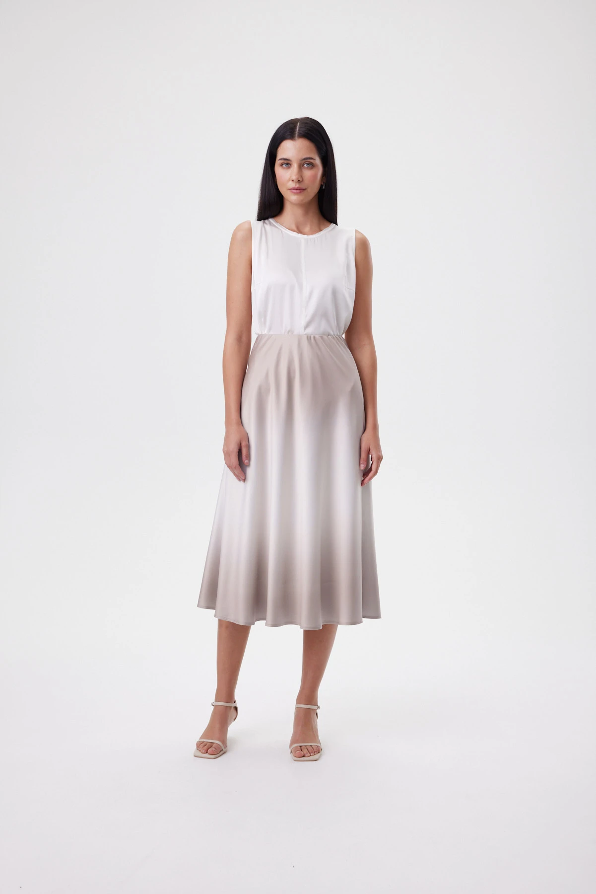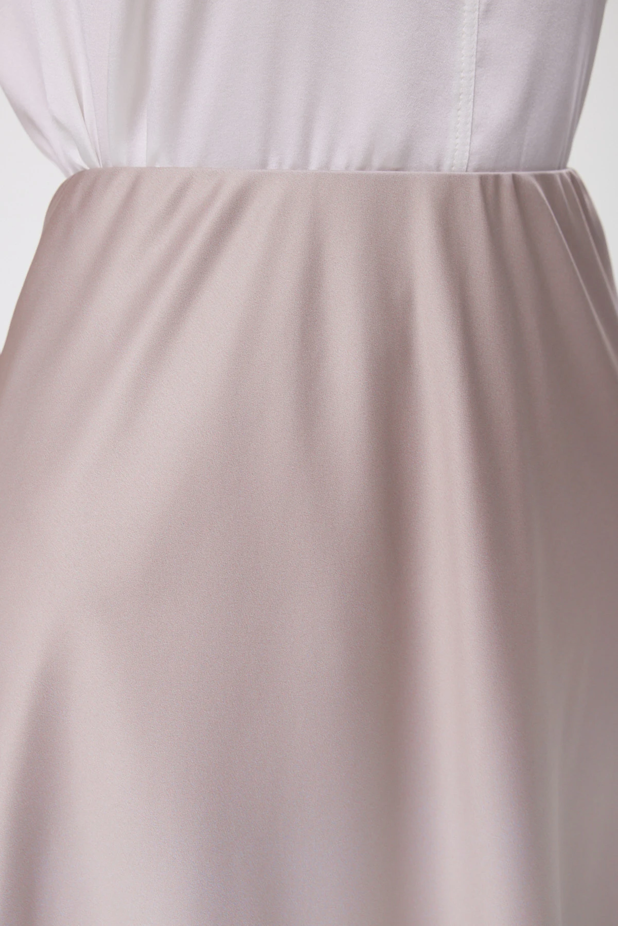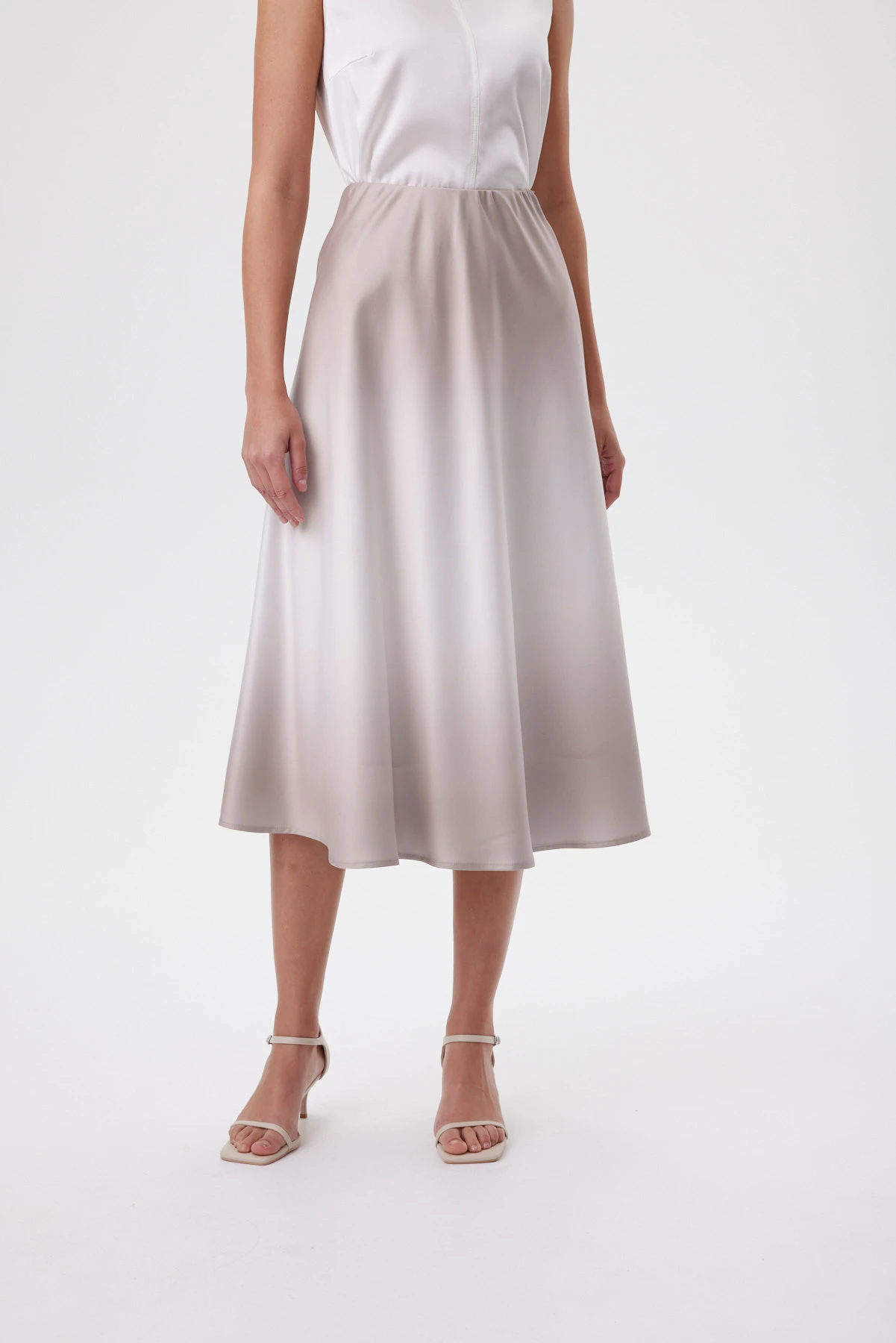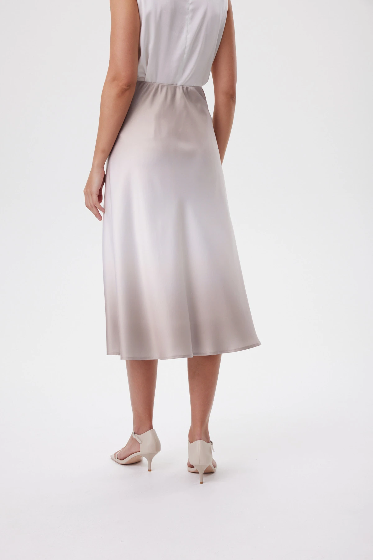 Юбка слегка расклешённая, такой крой подходит большинству типов фигур. Градиент у пояса — не декоративный эффект, а продуманная иллюзия, работающая на фигуру: более тёмный оттенок визуально собирает силуэт и создаёт ощущение выраженной линии талии. Плавный переход цвета усиливает А-силуэт юбки, смещая акцент вниз и делая образ комфортным и женственным без утяжеления. Ткань с атласным переплетением напоминает натуральный шёлк: плотная, гладкая, с ровным благородным блеском, который красиво раскрывается в движении и по-разному играет на переходах цвета. Подкладка обеспечивает уверенную посадку и делает светлый оттенок универсальным — юбка выглядит воздушной, но остаётся непрозрачной и аккуратной даже с заправленным верхом.