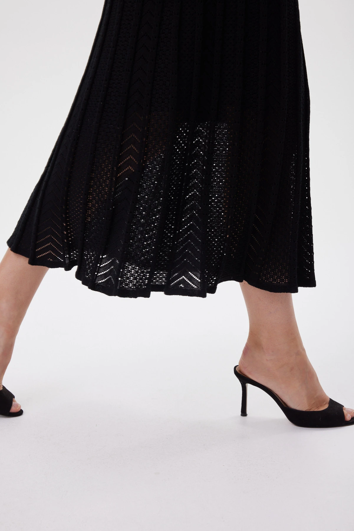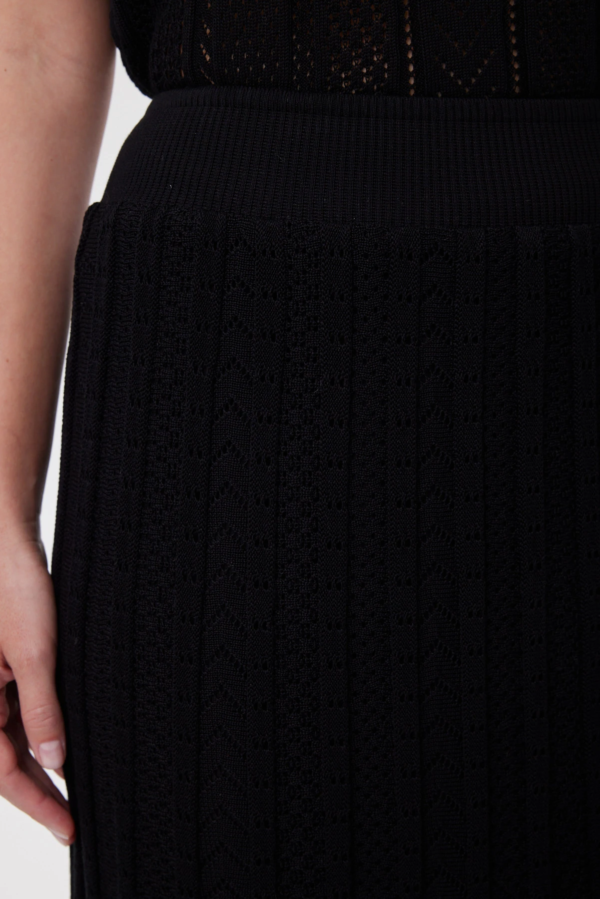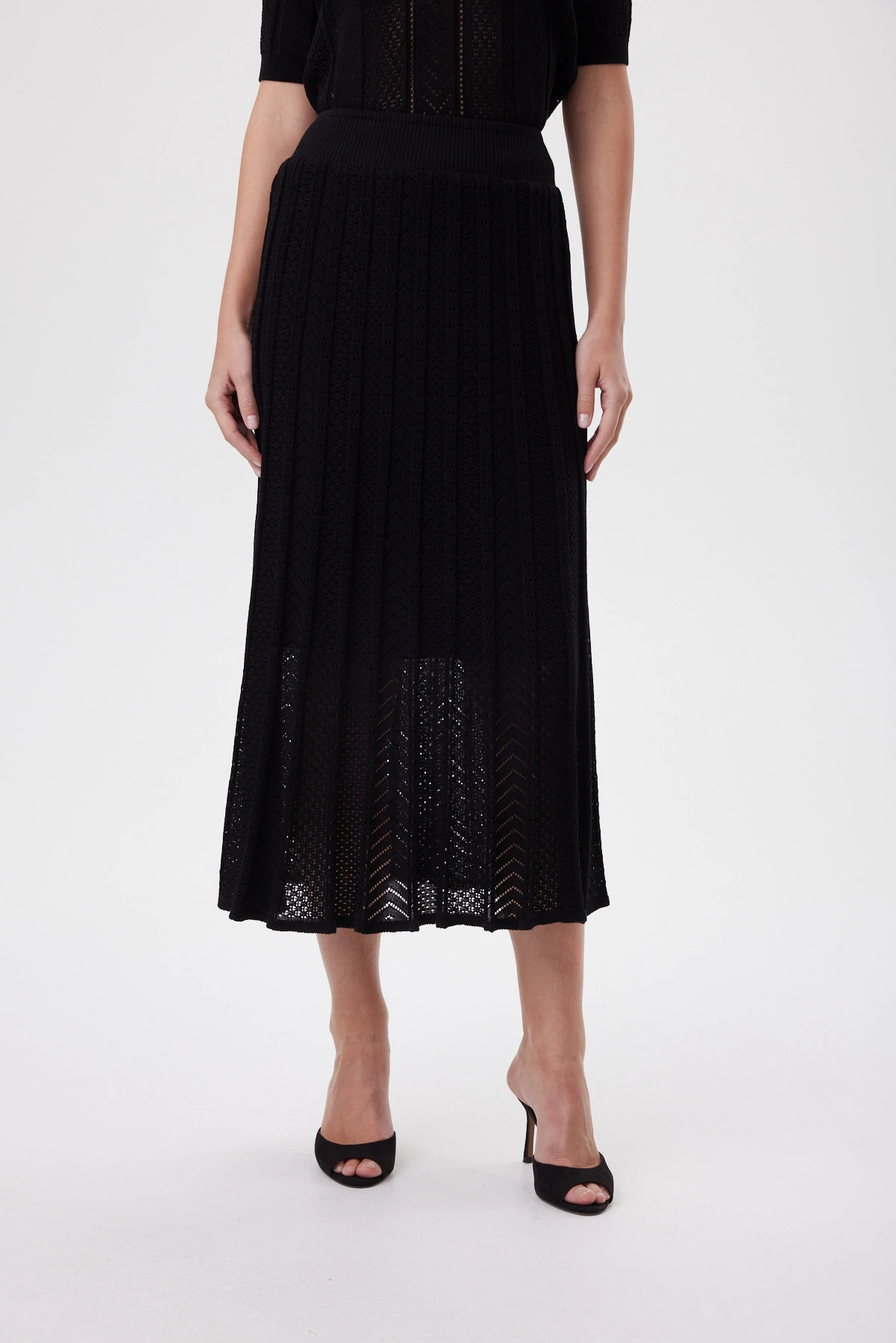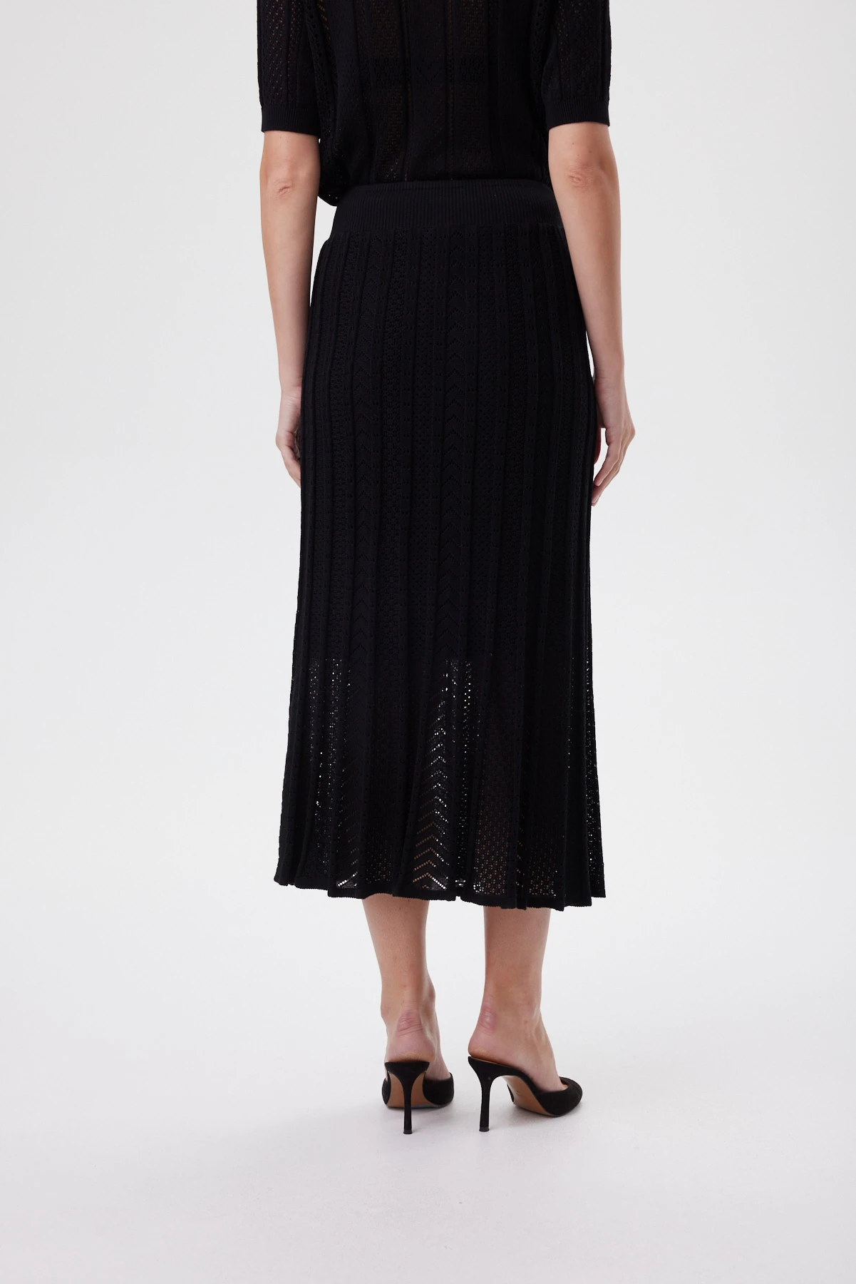Чёрная юбка связана из ажурного трикотажа на тенселе — прохладного к коже, мягкого и устойчивого к деформации. Конструкция клиньев выстроена так, чтобы создать эффект гофре: ритм сужения к талии и расширения к низу задаёт стройные вертикали, делает фигуру более вытянутой и добавляет динамики шагу. Пояс оформлен широкой эластичной бейкой и дополнительно стабилизирован скрытой кулиской с внутренней лентой — посадка надёжная и комфортная весь день. Лёгкая вискозная подкладка защищает от просвета, не цепляется за вязку и сохраняет воздушность движения. Сочетайте с монохромным верхом для графичного образа, с белой рубашкой для контраста или с топом и каблуком — для более вечернего настроения.