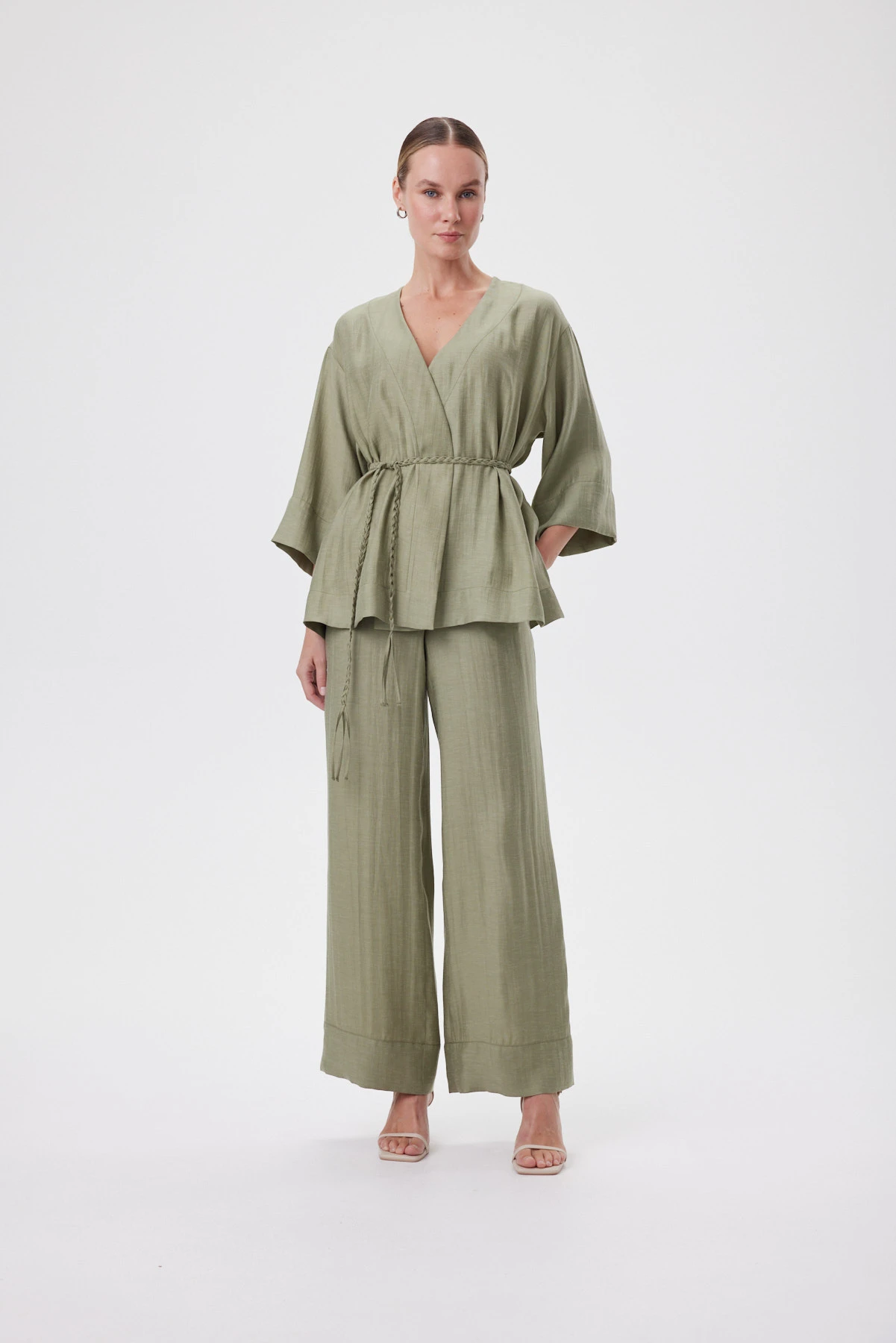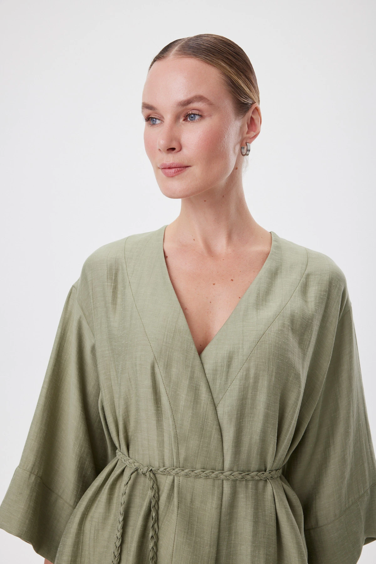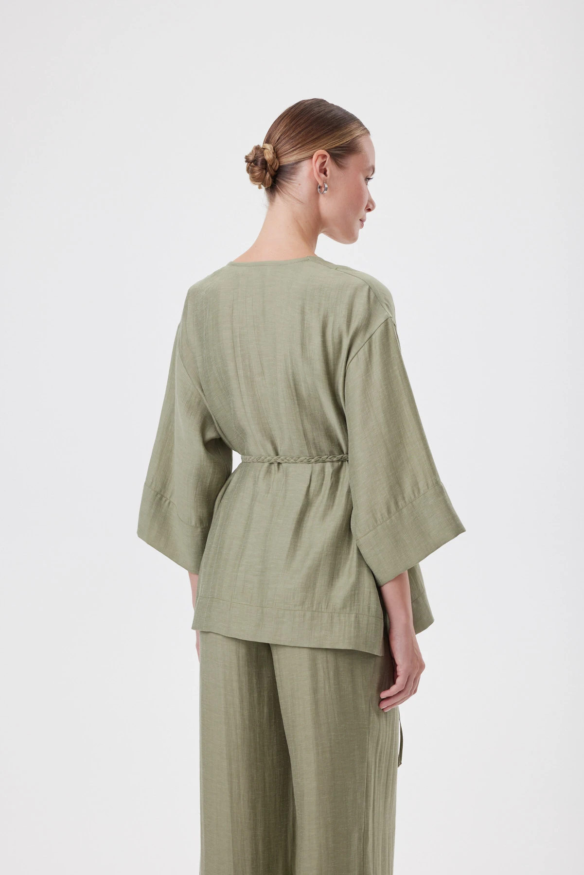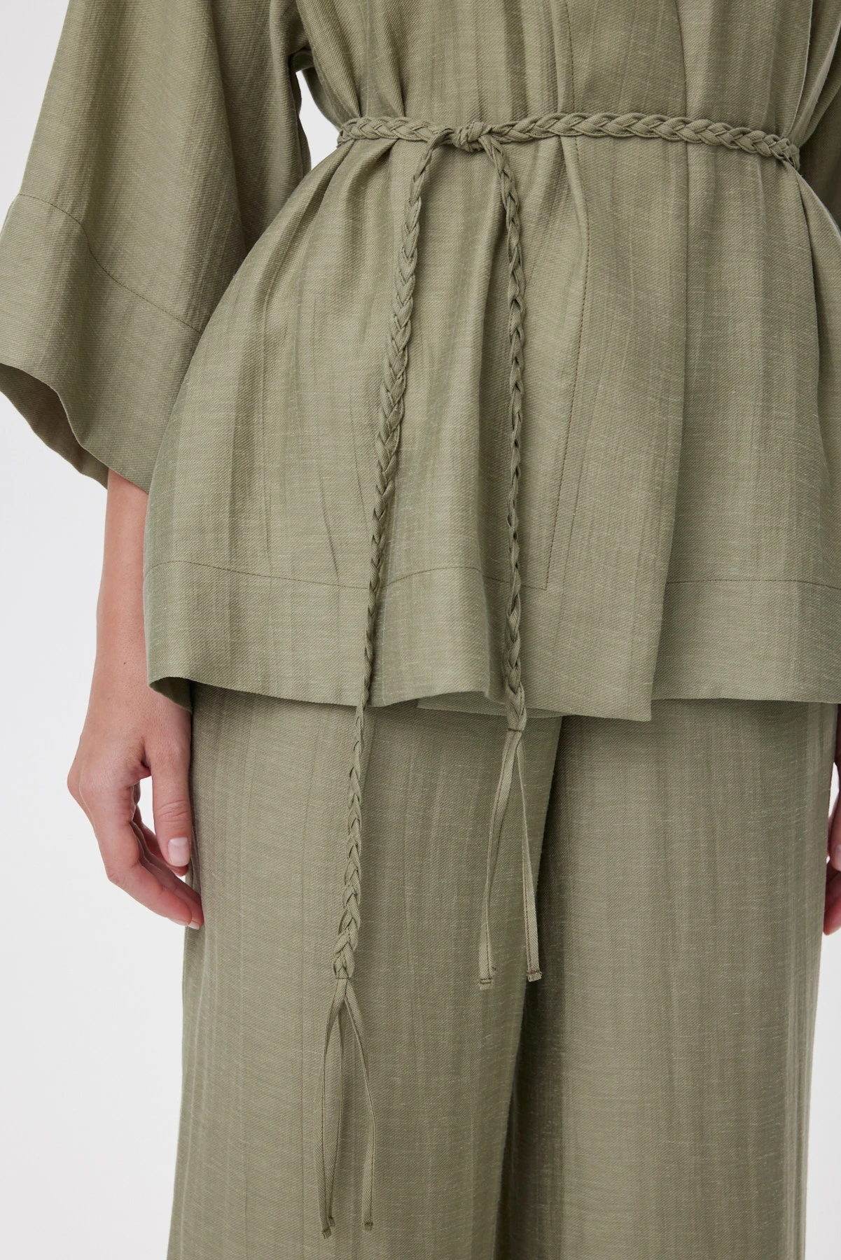 Оливковый жакет в свободном крое кимоно передаёт идею естественной свободы — то ощущение, когда летний воздух проходит сквозь ткань, одежда не диктует форму, а лишь мягко подчёркивает фигуру. Сборки у пояса формируют аккуратный объём и задают красивую вертикаль. Плетёный пояс ручной работы позволяет регулировать посадку: можно оставить свободной или подчеркнуть талию по настроению. Лён добавляет натуральный характер модели, а благодаря небольшому проценту полиэстера в составе жакет меньше мнётся и сохраняет форму в течение дня. Комбинируется с белыми брюками и шортами, денимом, а также поверх платья для расслабленного образа.