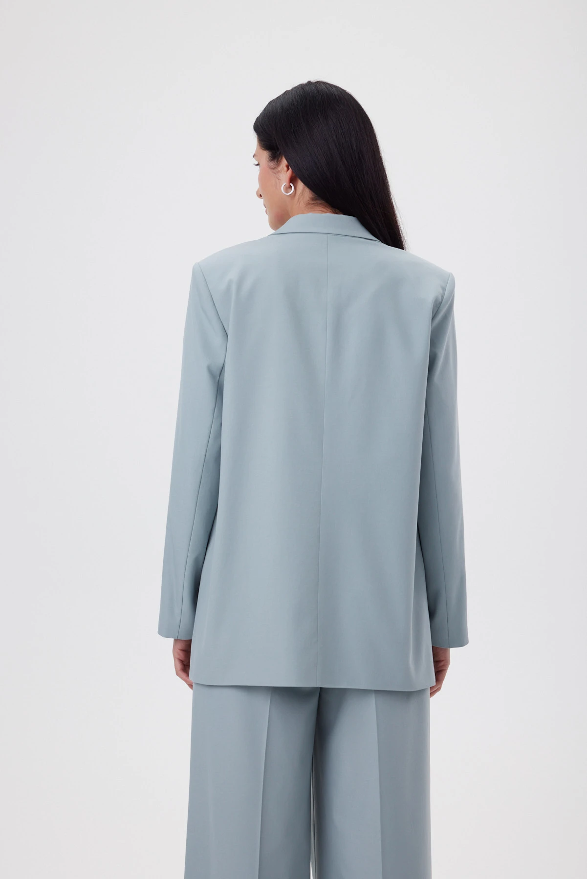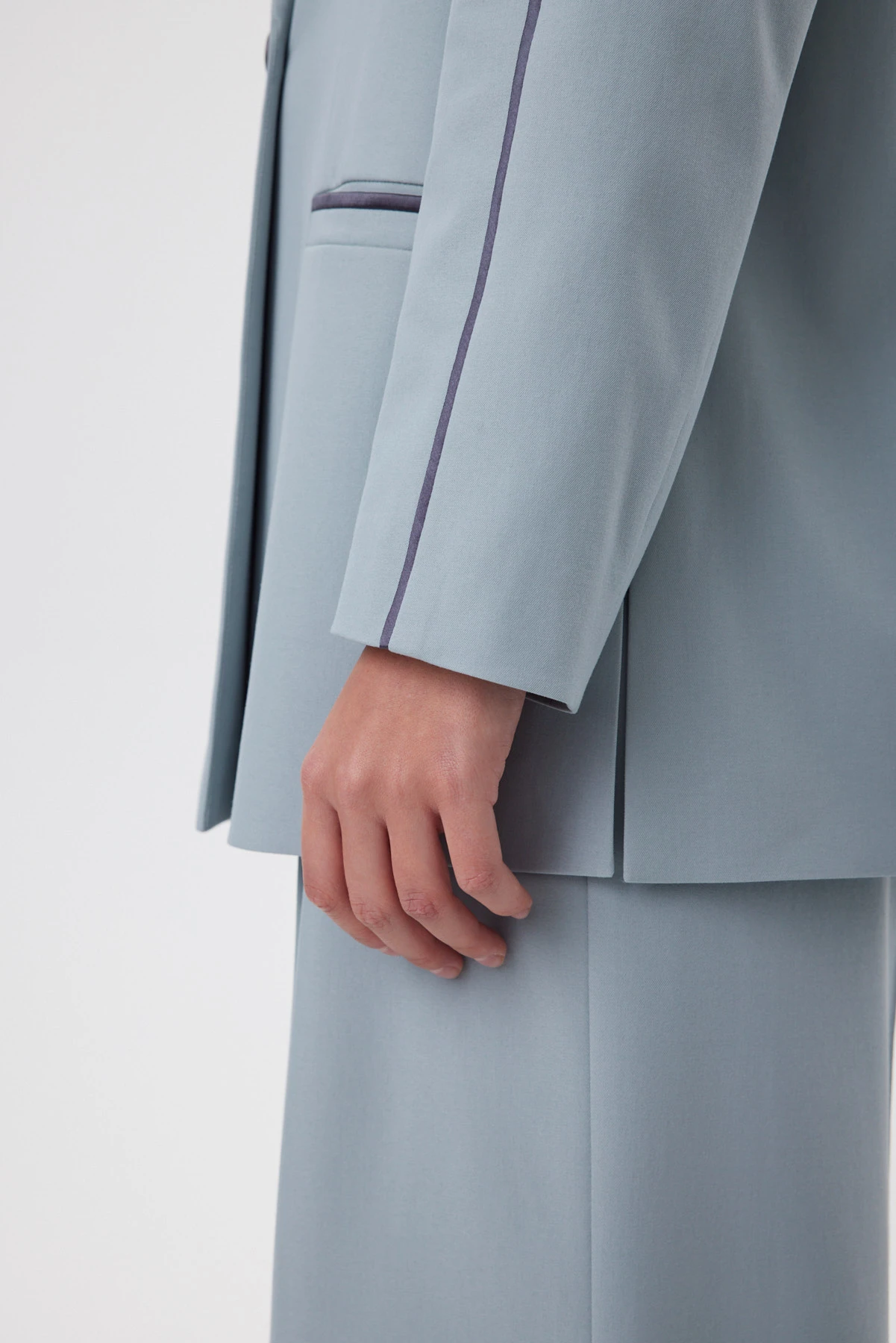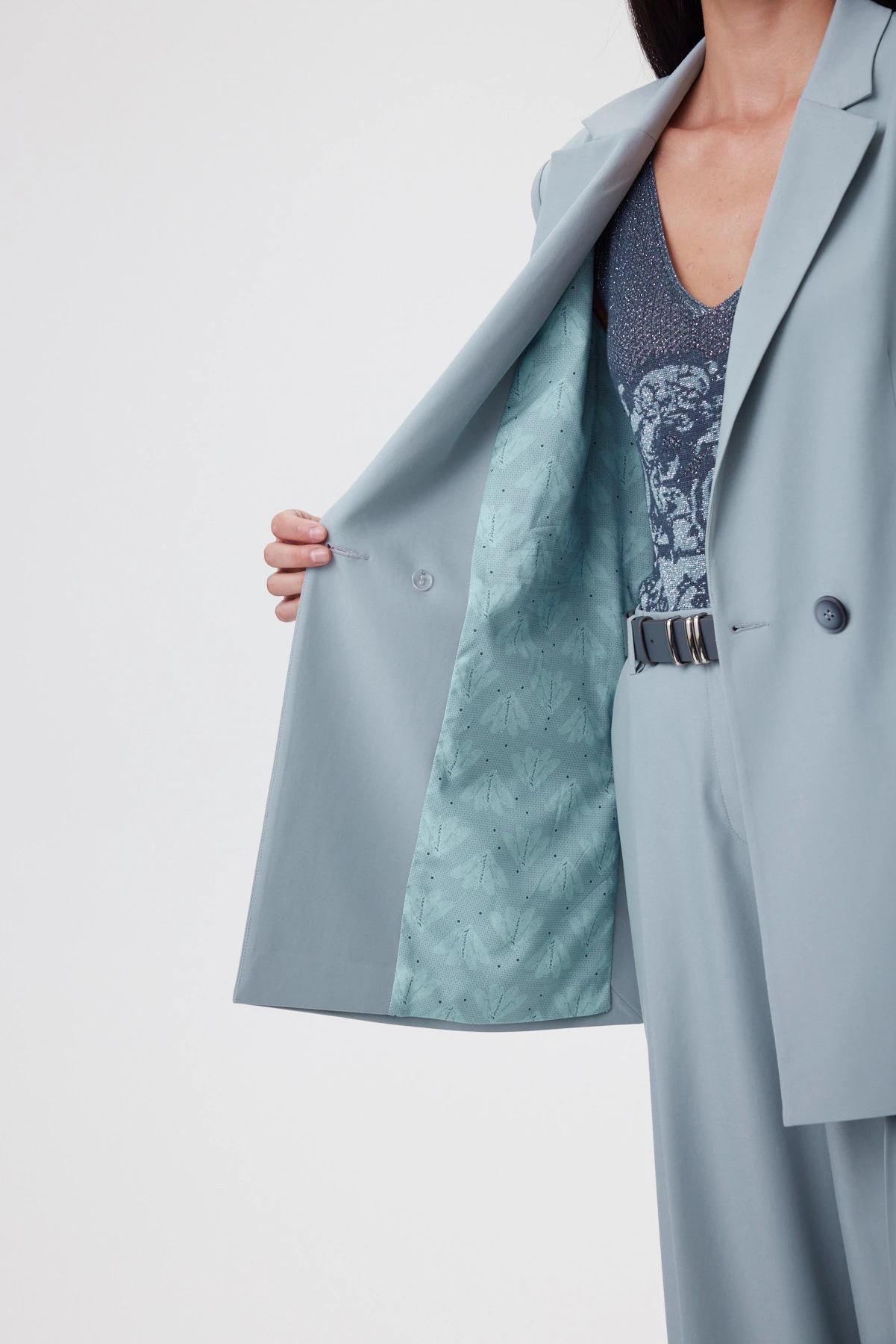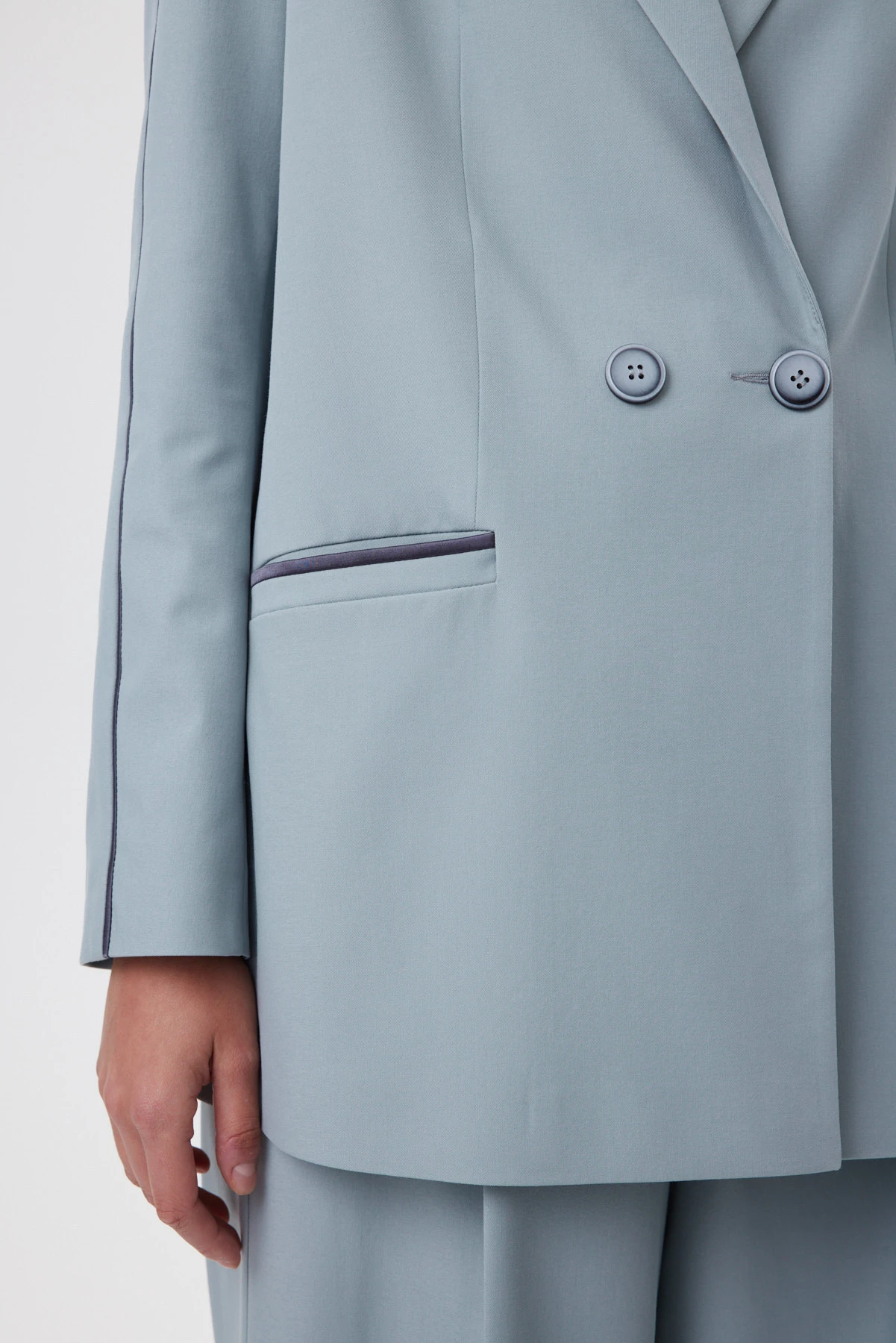 Удлинённая форма мятного жакета создаёт спокойный, выверенный силуэт, который смотрится актуально вне зависимости от трендов. Перед и спинка сохраняют идеальную плоскость без рельефов, что создаёт ощущение лёгкости и художественной “раскрепощённости” — редкая находка для удлинённого жакета. Высокие боковые разрезы до уровня кармана делают шаг свободнее, а фигуру во время движения — пластичнее. Ключевой приём — сатиновый графитовый кант, втачанный в шов по внешней стороне рукава: он собирает линию руки и делает силуэт аккуратнее. Внутри — подкладка с авторским принтом и рукописным логотипом; чуть более светлый тон красиво играет при открытой носке.