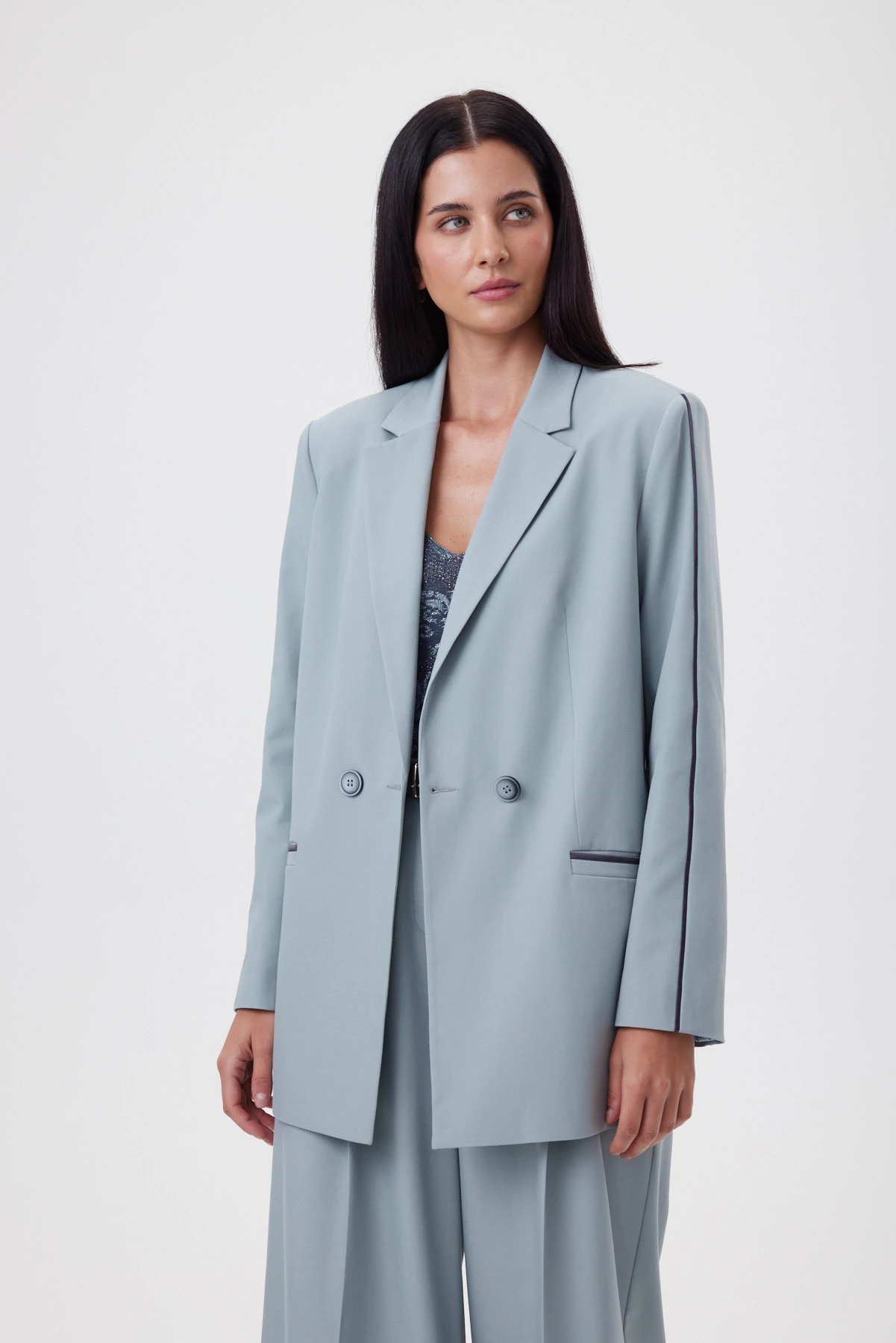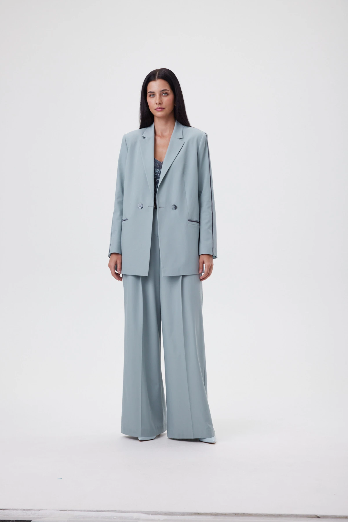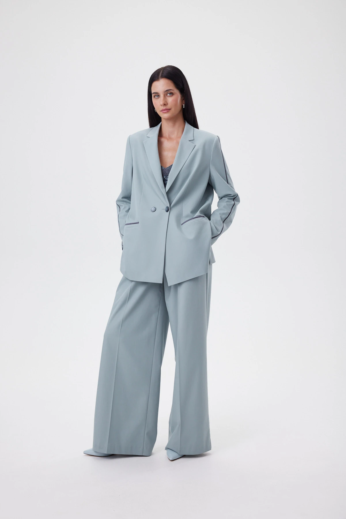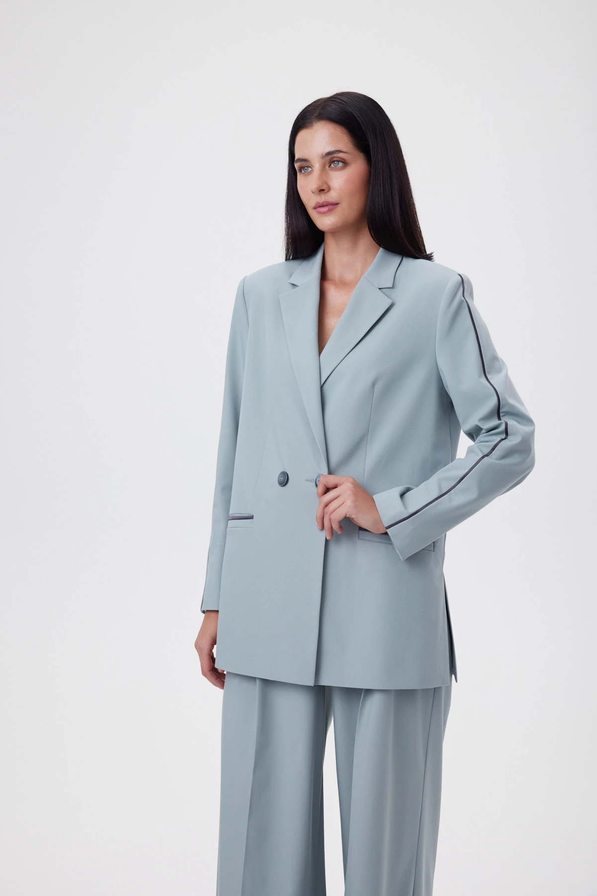 Удлинённая форма мятного жакета создаёт спокойный, выверенный силуэт, который смотрится актуально вне зависимости от трендов. Перед и спинка сохраняют идеальную плоскость без рельефов, что создаёт ощущение лёгкости и художественной “раскрепощённости” — редкая находка для удлинённого жакета. Высокие боковые разрезы до уровня кармана делают шаг свободнее, а фигуру во время движения — пластичнее. Ключевой приём — сатиновый графитовый кант, втачанный в шов по внешней стороне рукава: он собирает линию руки и делает силуэт аккуратнее. Внутри — подкладка с авторским принтом и рукописным логотипом; чуть более светлый тон красиво играет при открытой носке.